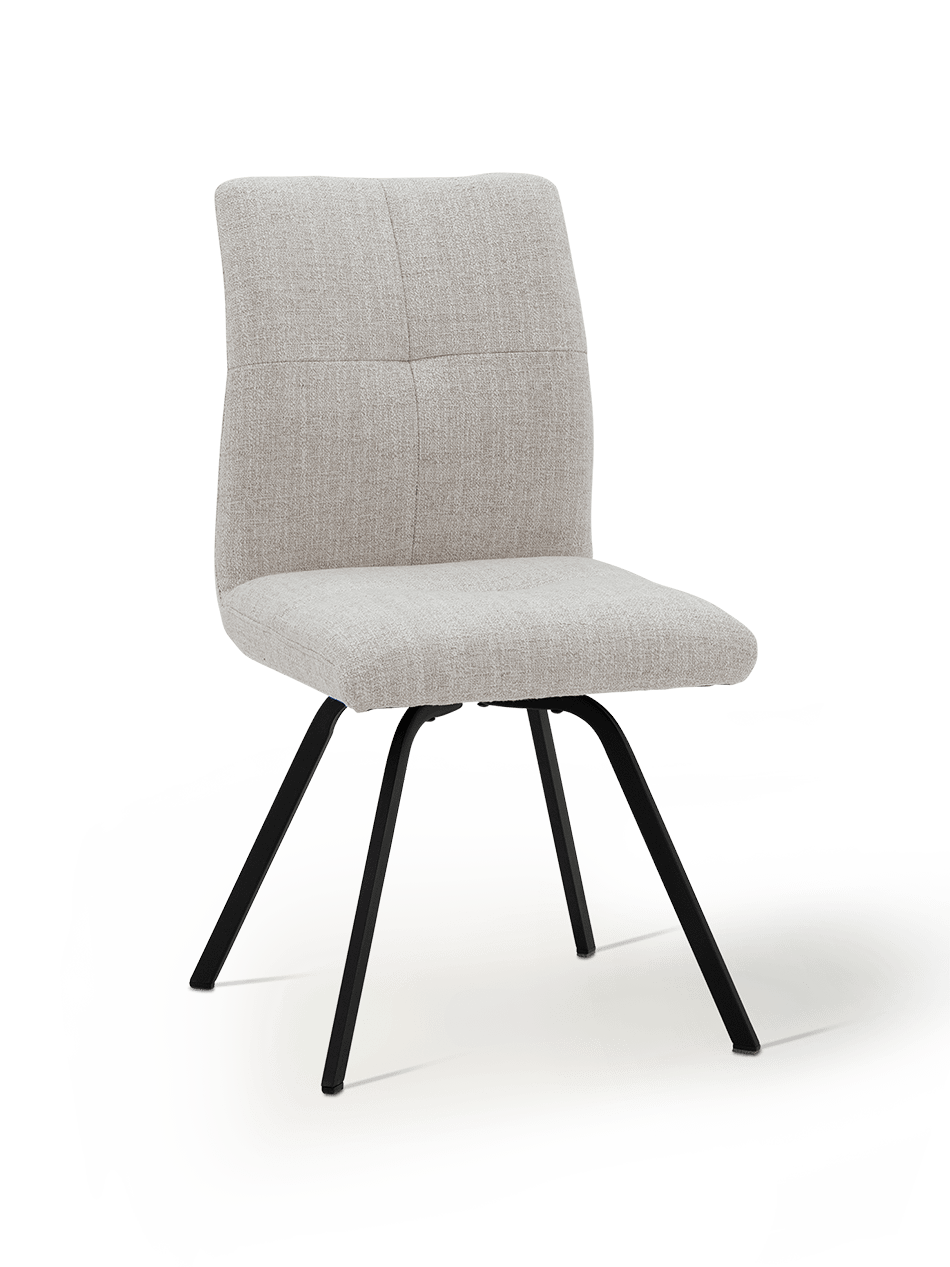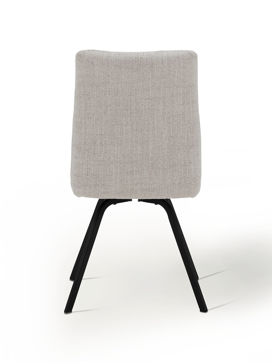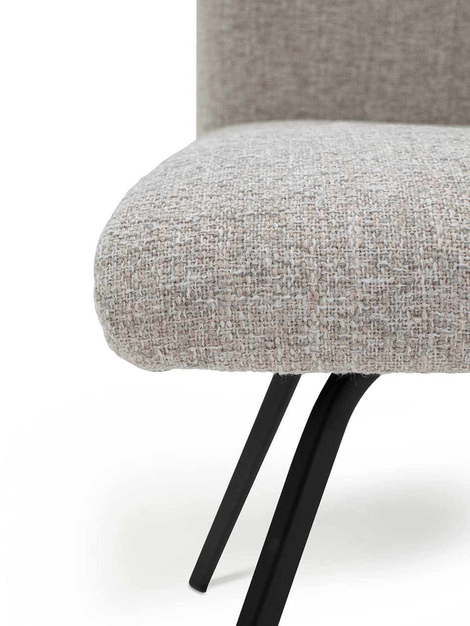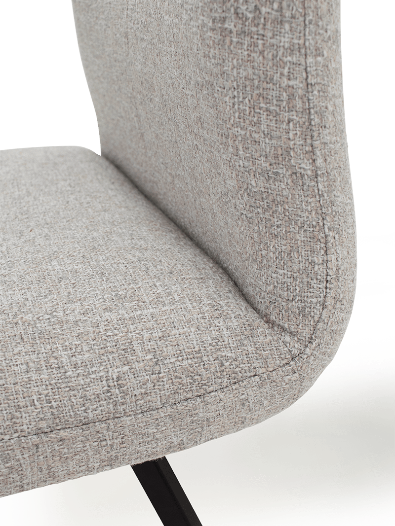 De afgeronde rug en zitting bieden uitstekende ondersteuning, ideaal voor lange tafelmomenten. Dankzij de zitdiepte van 45 cm en de zithoogte van 48 cm ervaar je een ontspannen maar stabiele zithouding. Het zwarte metalen onderstel zorgt voor een moderne, verfijnde basis die de natuurlijke uitstraling van de stof perfect contrasteert.