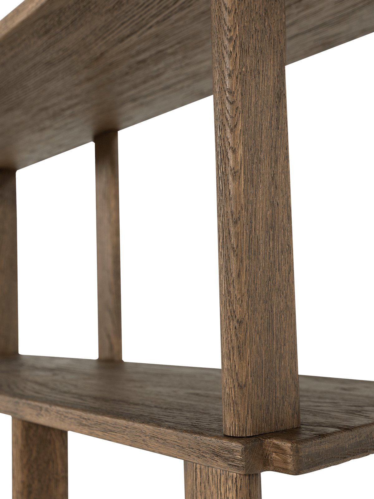 De Riss boekenkast biedt met zijn legplanken voldoende opbergruimte, zonder zwaar te ogen. Het subtiele lijnenspel van de verticale en horizontale delen creëert een speelse uitstraling, terwijl de natuurlijke houtnerf het meubel een authentieke en karaktervolle toets geeft.