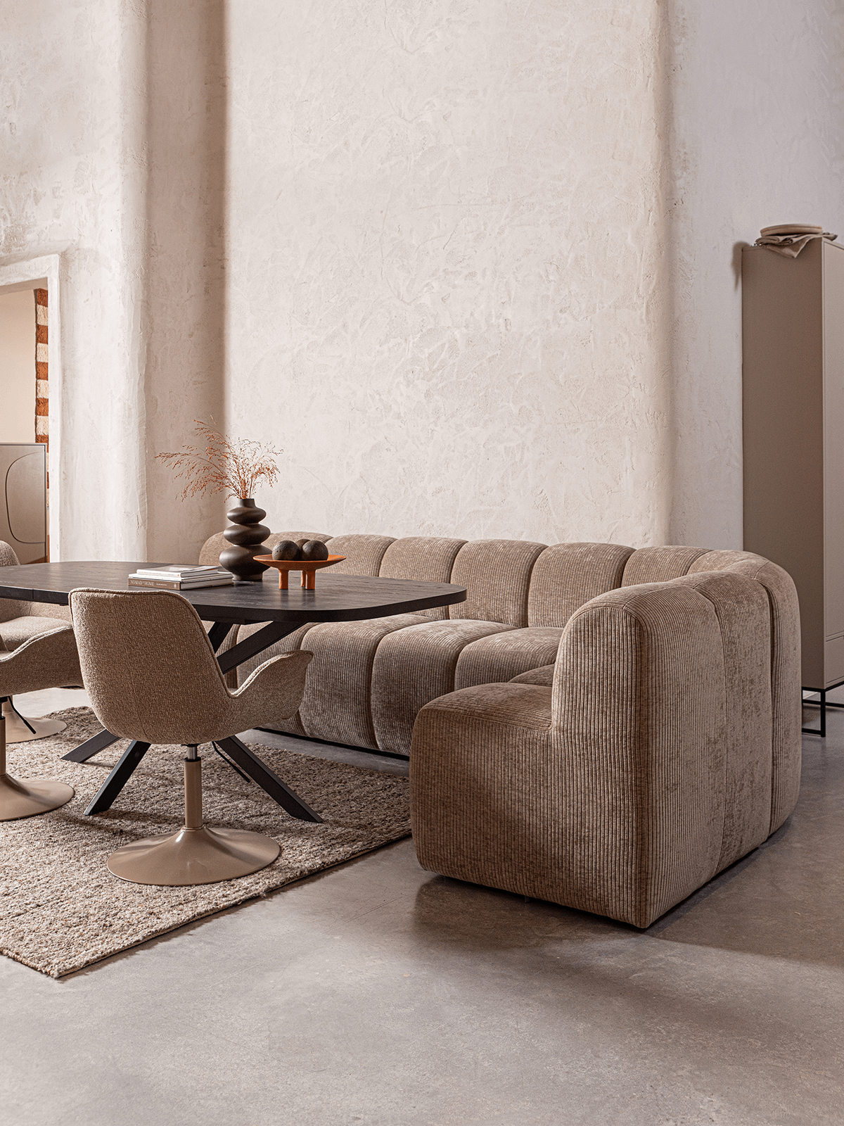 De 1-zit Mojo van Woood combineert een eigentijdse vormgeving met een heerlijk zitcomfort. De afgeronde vormen en de zachte ribstof in donkere zandkleur zorgen voor een warme, uitnodigende look. Dankzij het compacte formaat past deze fauteuil perfect in elke woonkamer, zithoek ofleeshoek. Zacht, modern en veelzijdig De zitting en de comfortabele rugleuning maken van de Mojo een echte relaxplek. De ribstructuur van de stof geeft extra diepte aan de kleur en voelt aangenaam aan. Gebruik de 1-zit als los element of combineer hem met andere onderdelen uit de Mojo-collectie om een modulaire opstelling te creëren die perfect aansluit bij jouw interieur.