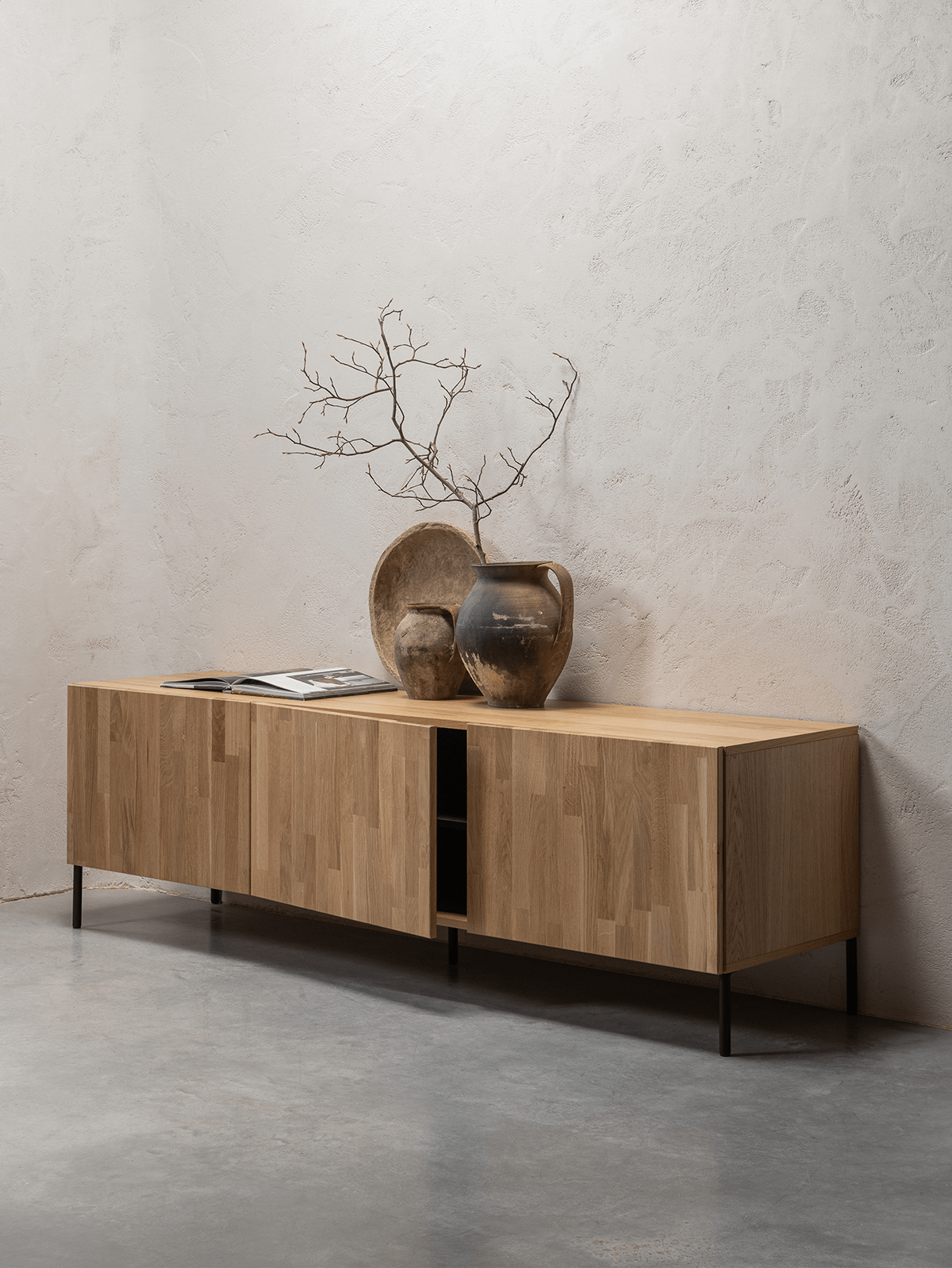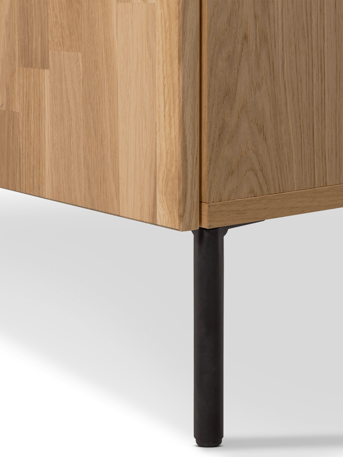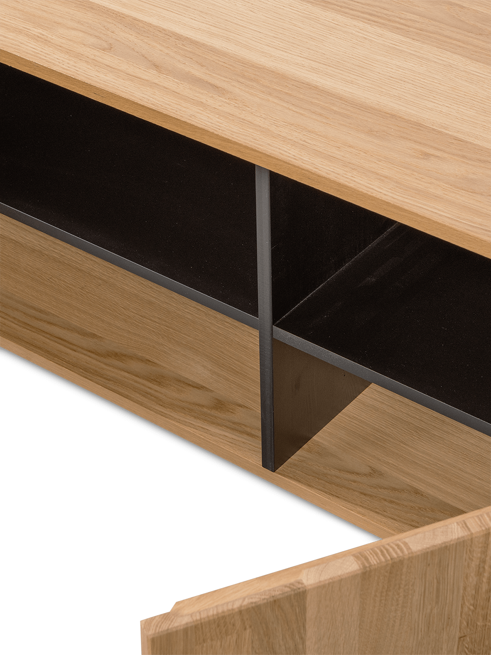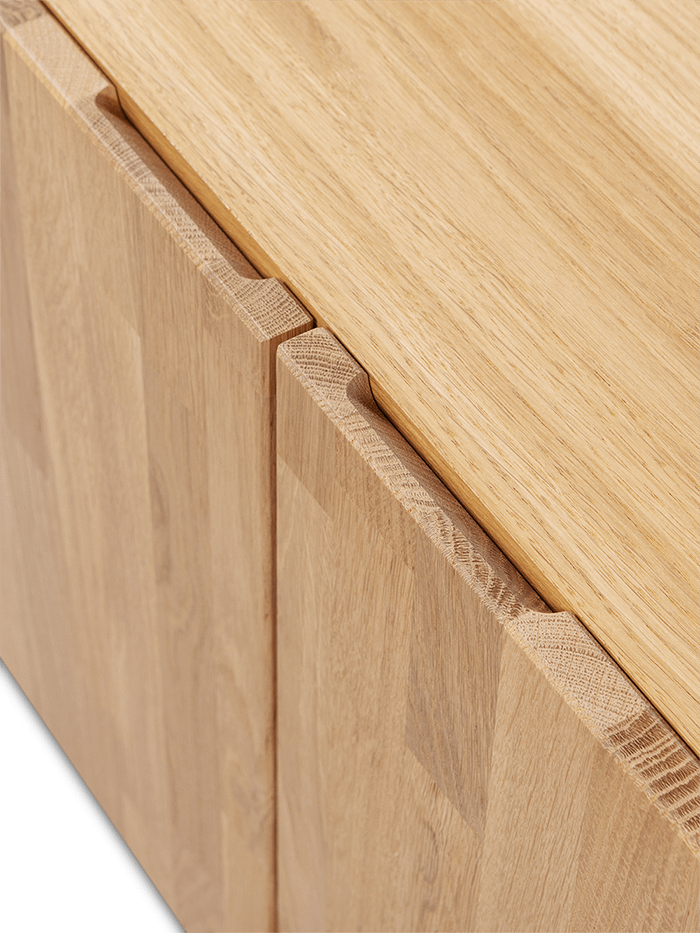 Het TV-meubel Bono van Woood combineert een strak ontwerp met de warme uitstraling van natuurlijk eikenhout. De nerfstructuur en de matte afwerking geven dit meubel een rustige, eigentijdse look.