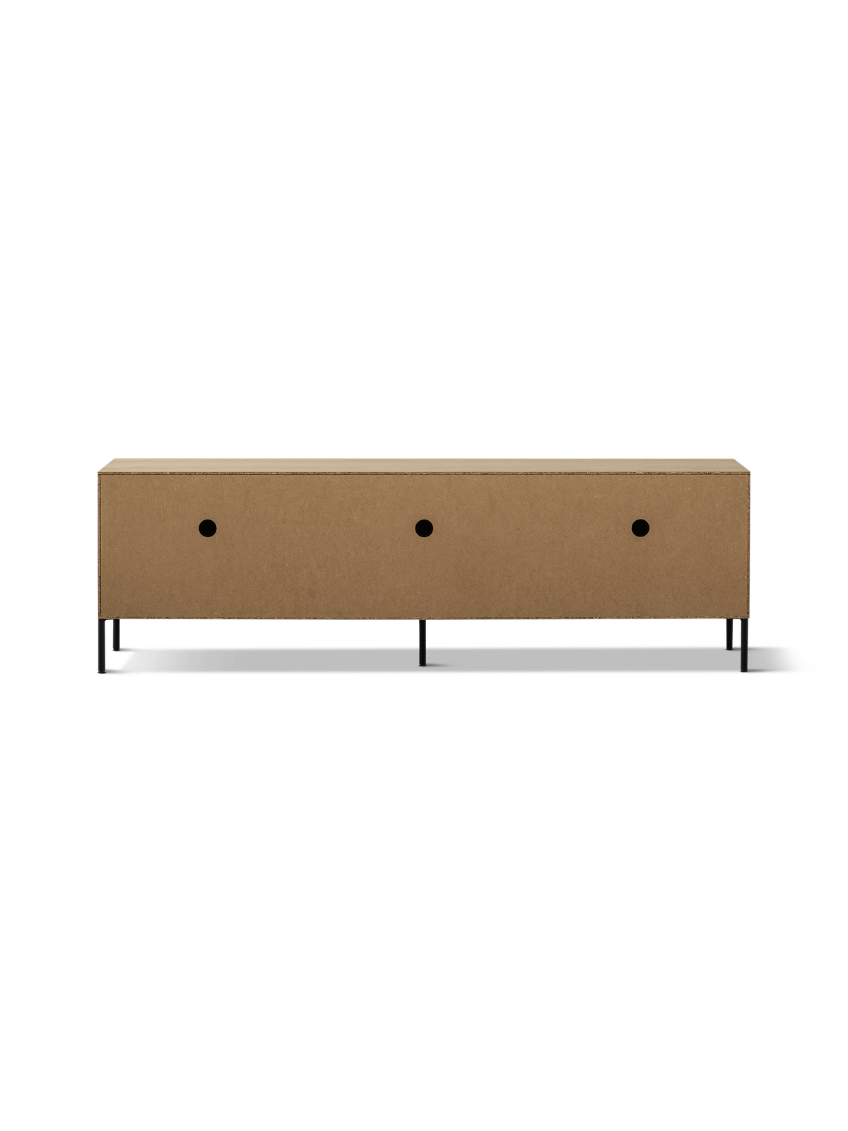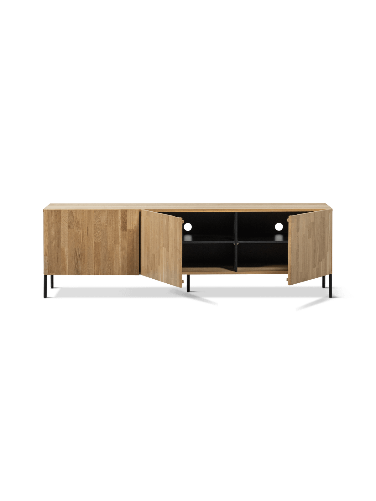 TV-meubel Bono biedt ruime opbergmogelijkheden achter de drie deuren, ideaal voor het netjes opbergen van multimedia-apparatuur, kabels en accessoires. De openingen aan de achterzijde zorgen voor een discrete kabeldoorvoer.