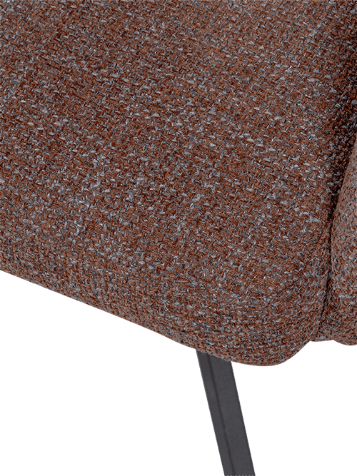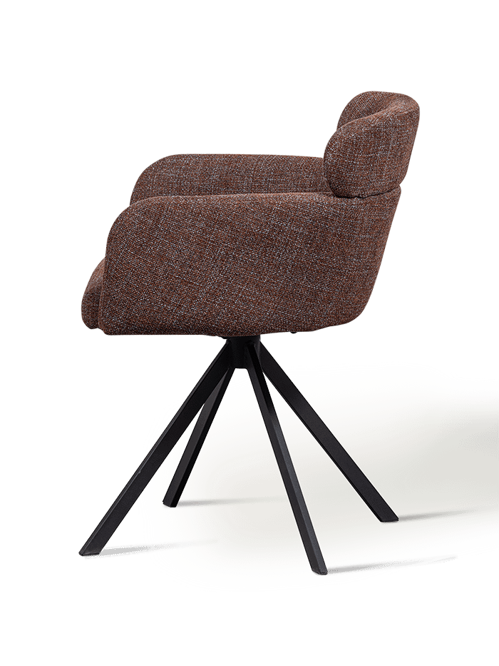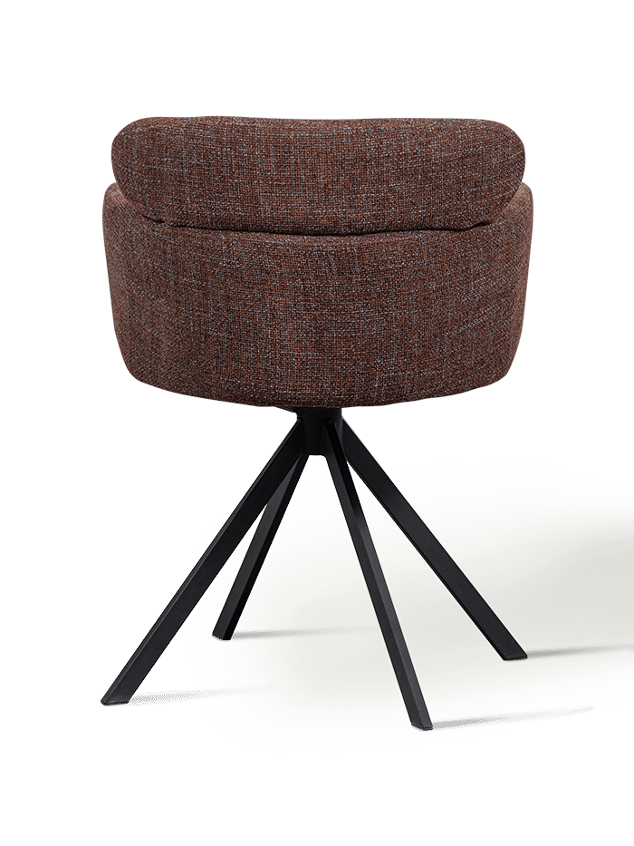 De stoel is bekleed met een zachte, geweven stof in een diepe kastanjekleur. Het subtiele gemêleerde effect in de stof geeft extra diepte en karakter. De zwarte metalen poten zorgen voor een stevige basis en een moderne uitstraling. Dankzij het draaimechanisme geniet je bovendien van extra bewegingsvrijheid en gebruiksgemak.