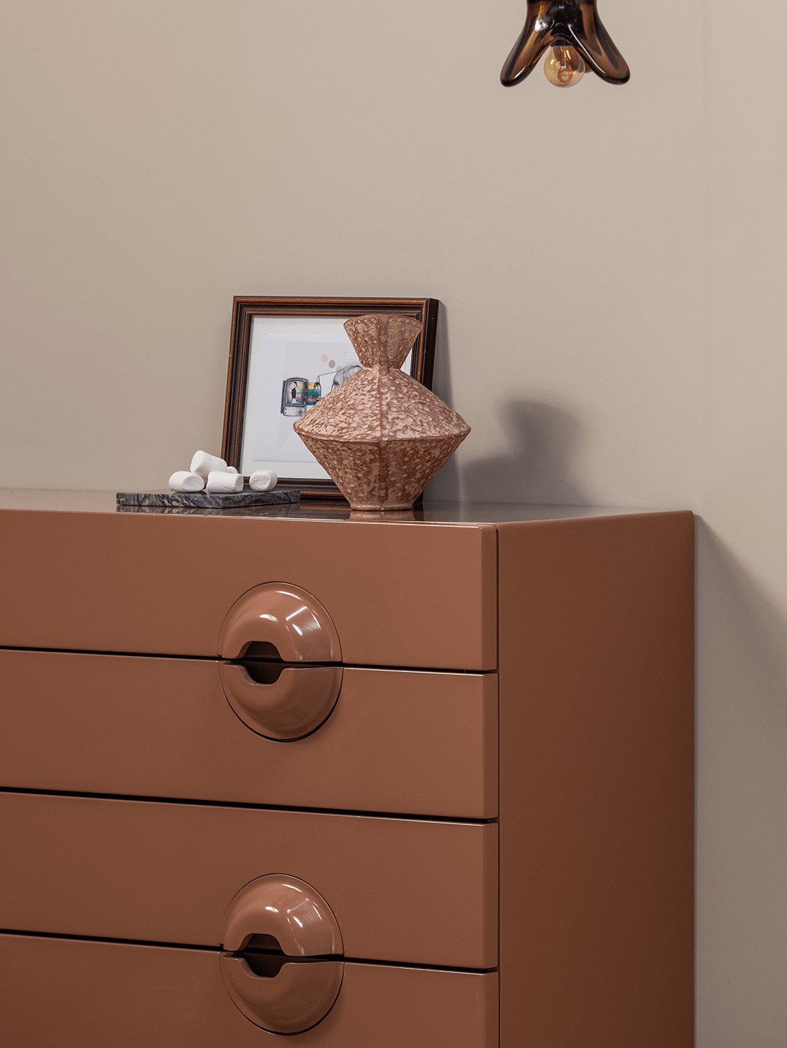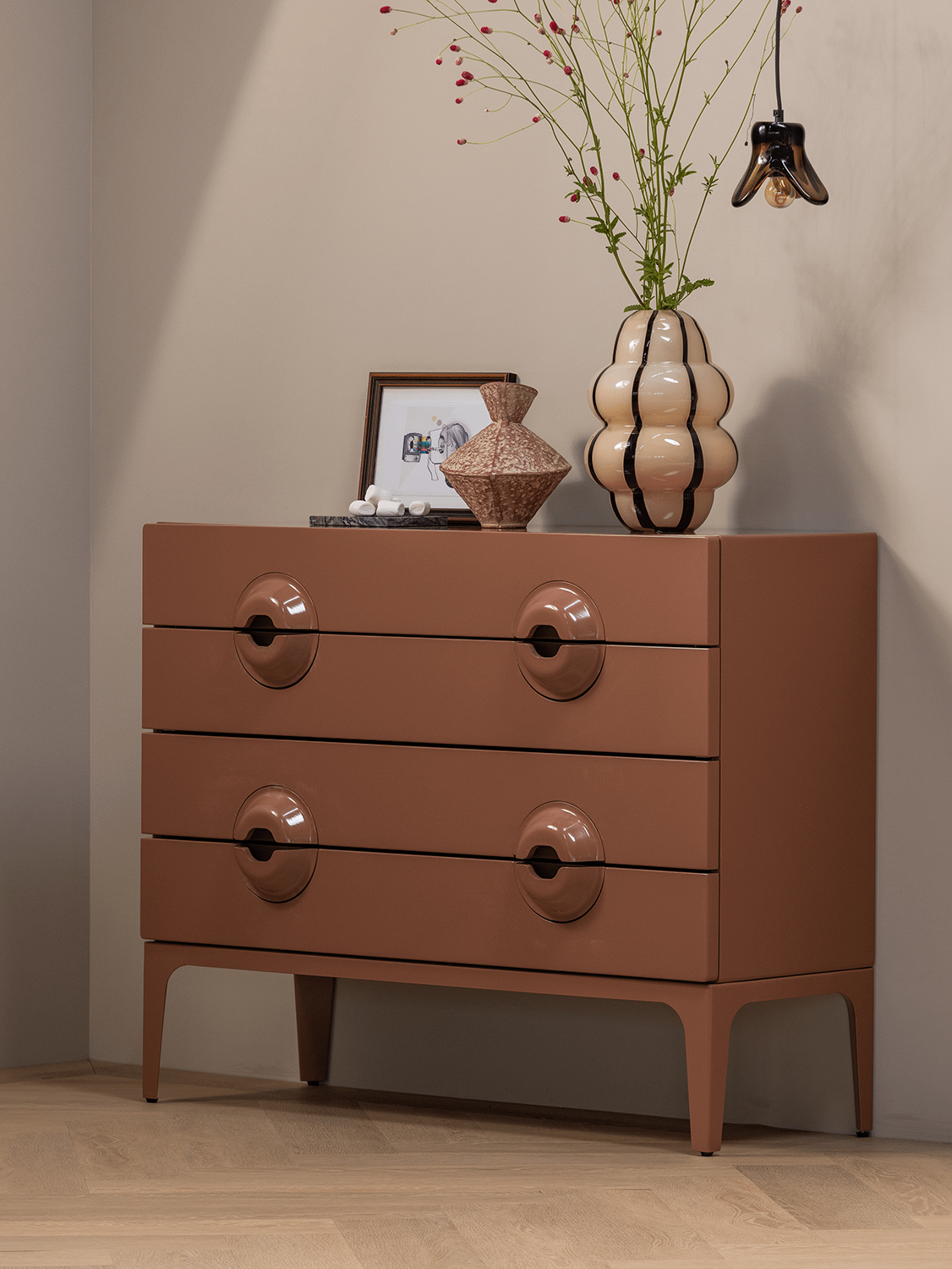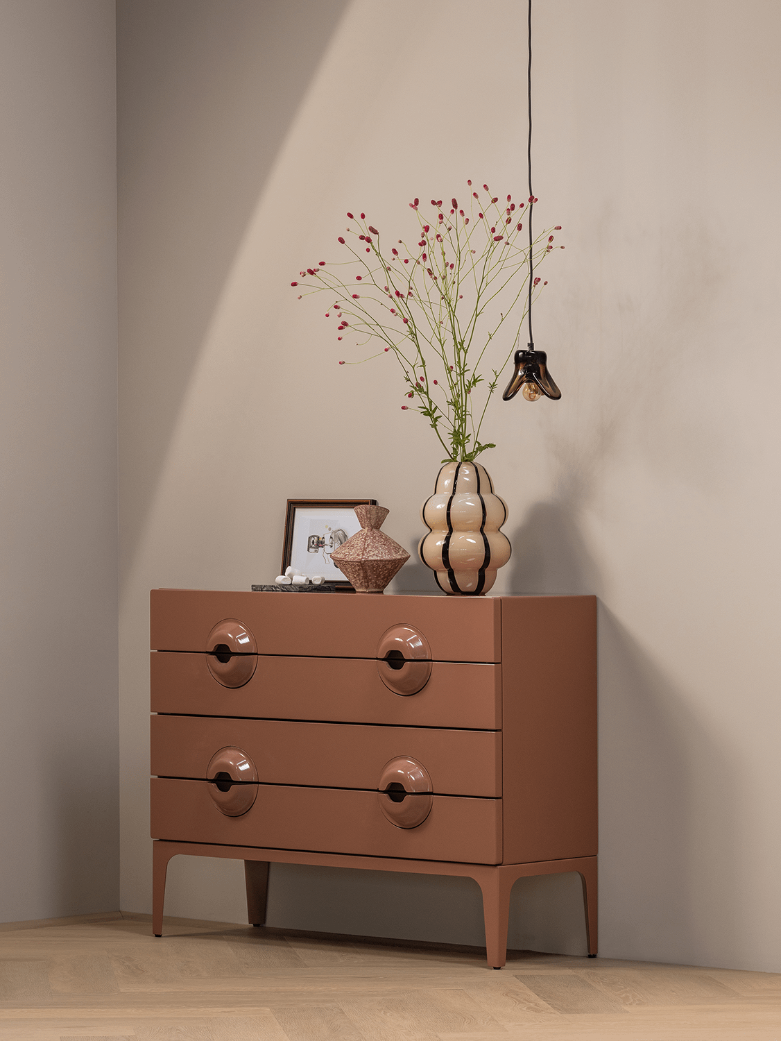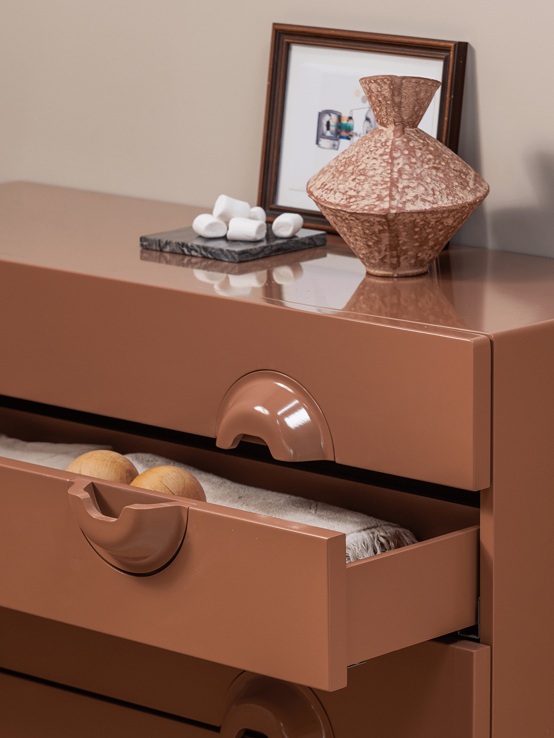 De commode Merge van Woood brengt karakter en verfijning samen in één stijlvol ontwerp. Met haar afgeronde handgrepen en glanzende oudroze afwerking straalt deze kast pure elegantie uit. De zachte, poederachtige tint voegt warmte en klasse toe aan je interieur, ideaal voor wie houdt van subtiel design met een speelse knipoog.