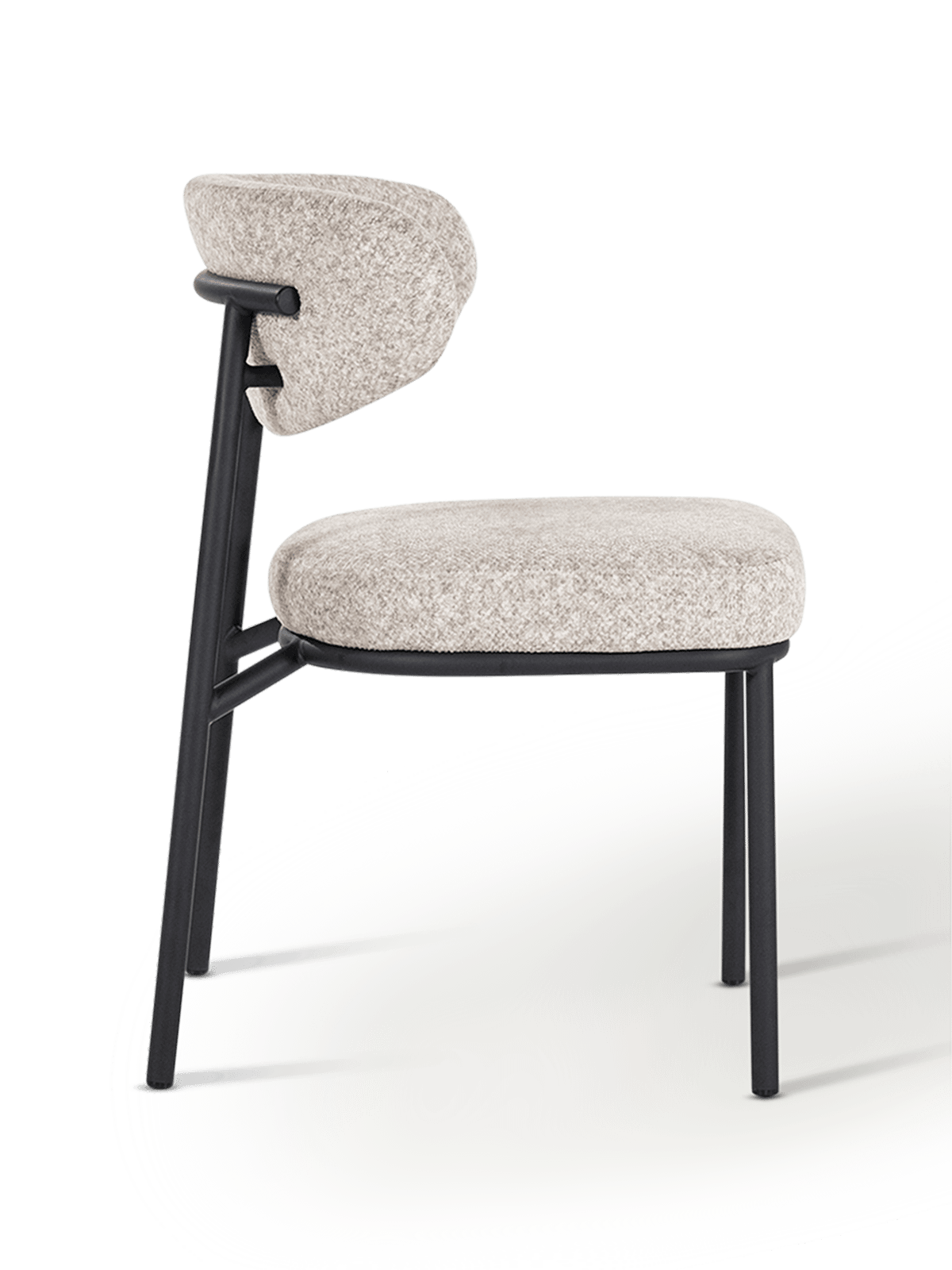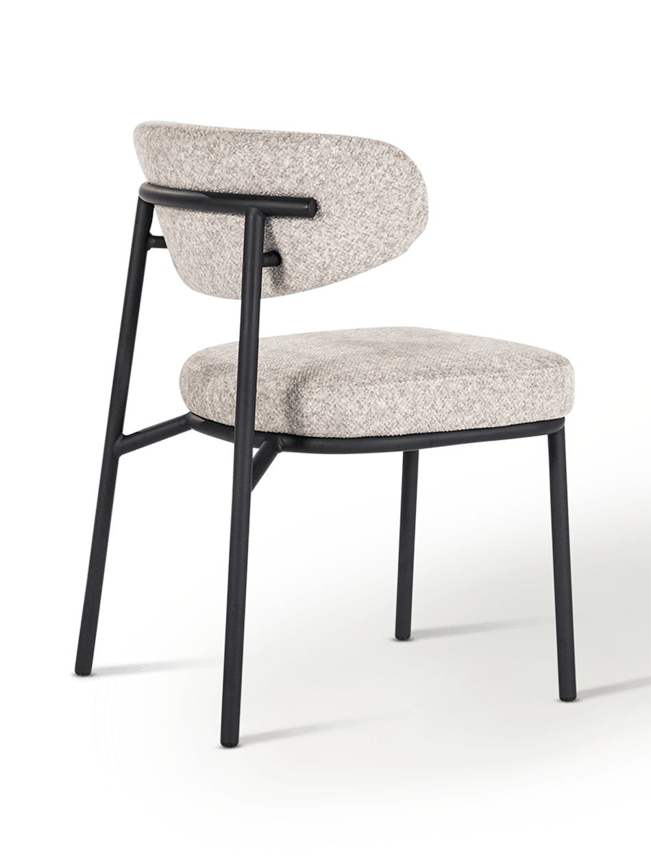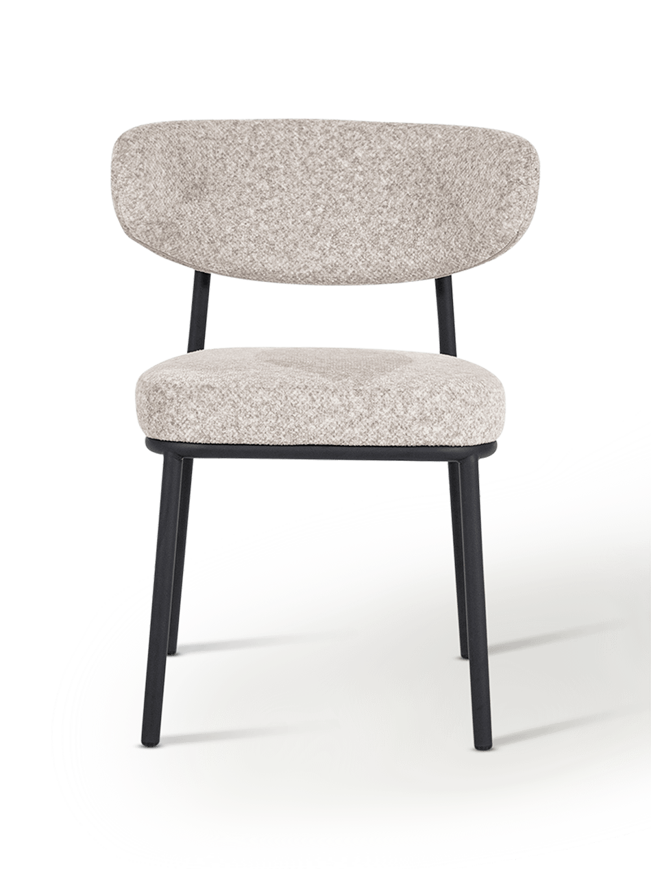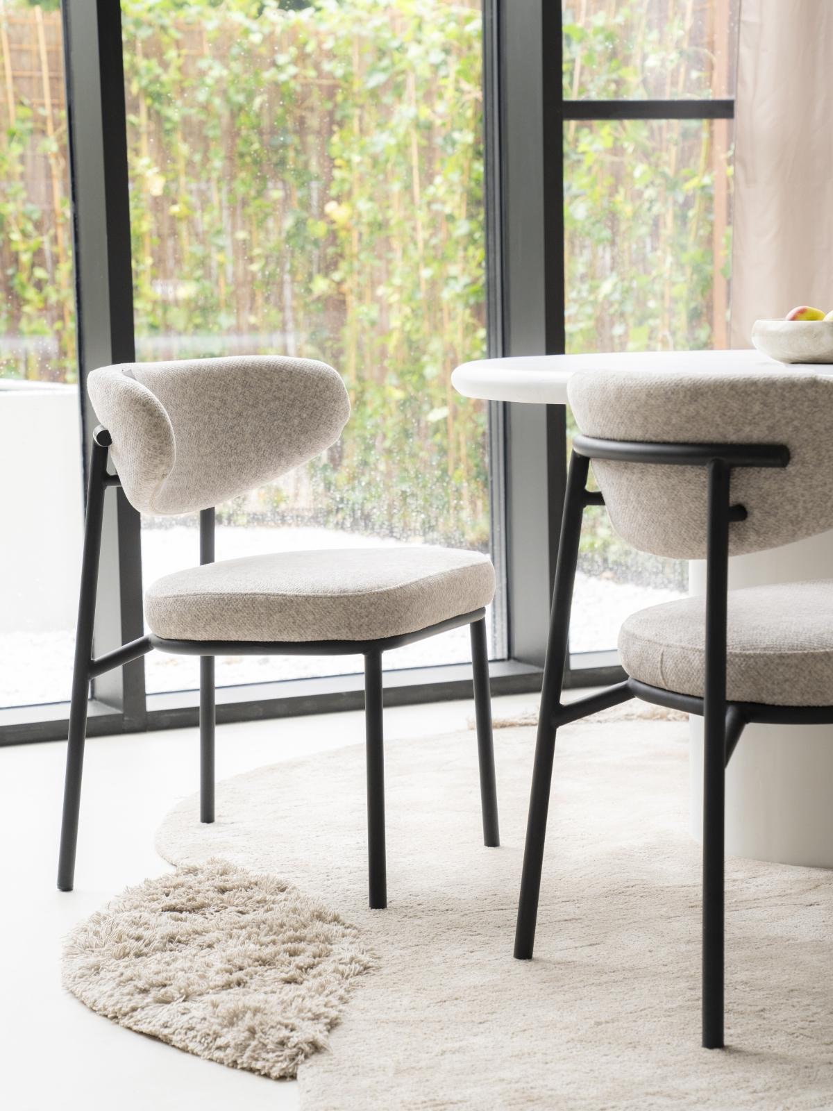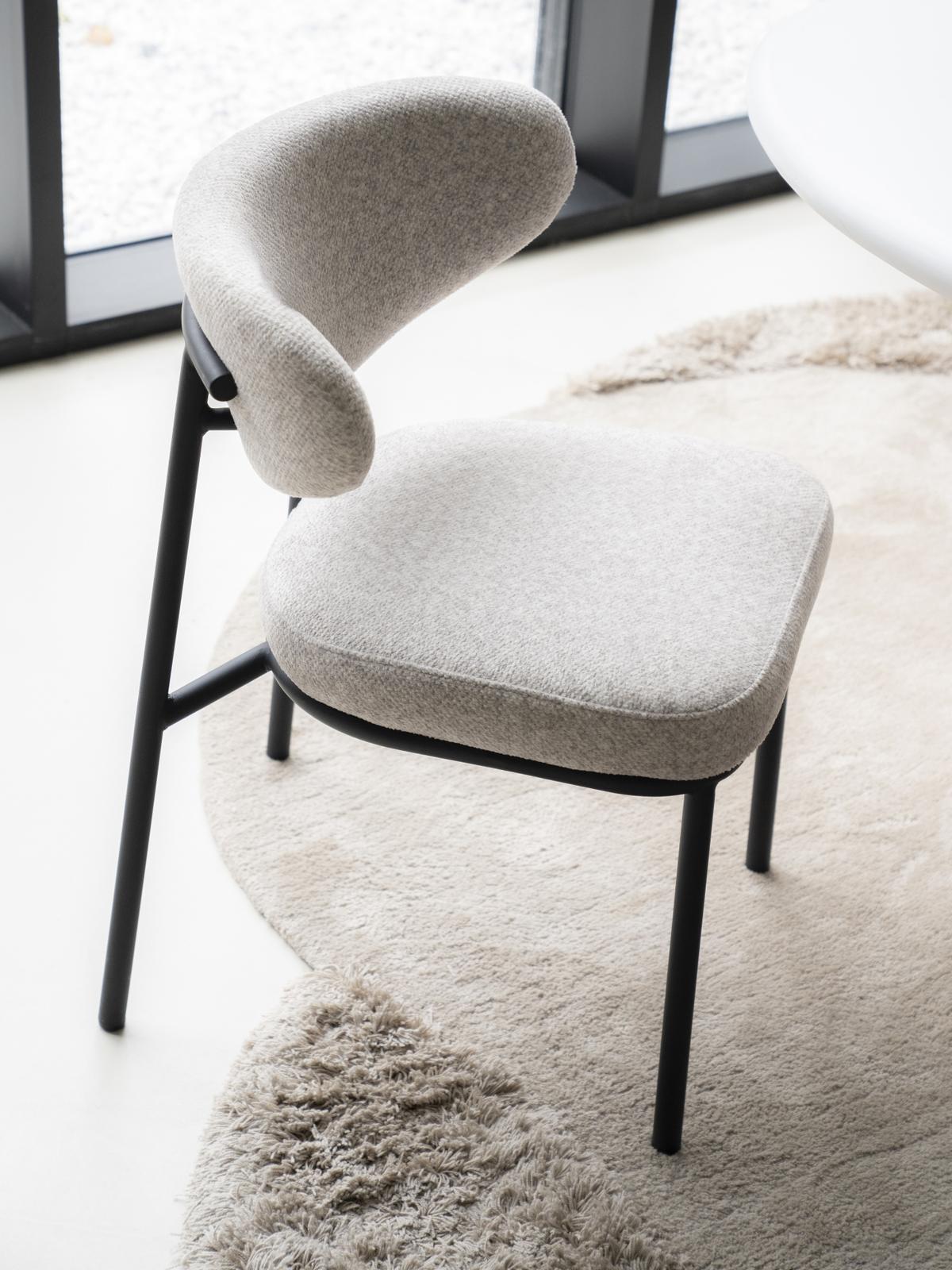 De Jari stoel is een eigentijds ontwerp dat moeiteloos balans vindt tussen strak metaal en zachte stoffering. De ronde vormen van de rugleuning en zitting contrasteren mooi met het ranke, zwarte metalen frame, waardoor de stoel een moderne maar warme uitstraling krijgt. De beige bekleding zorgt voor een lichte, natuurlijke toon die past binnen elk interieur — van Scandinavisch tot urban chic.