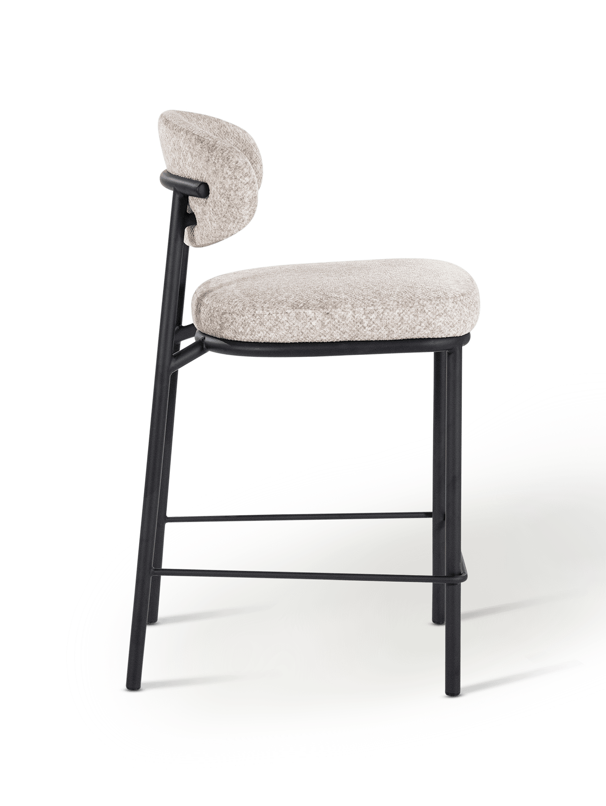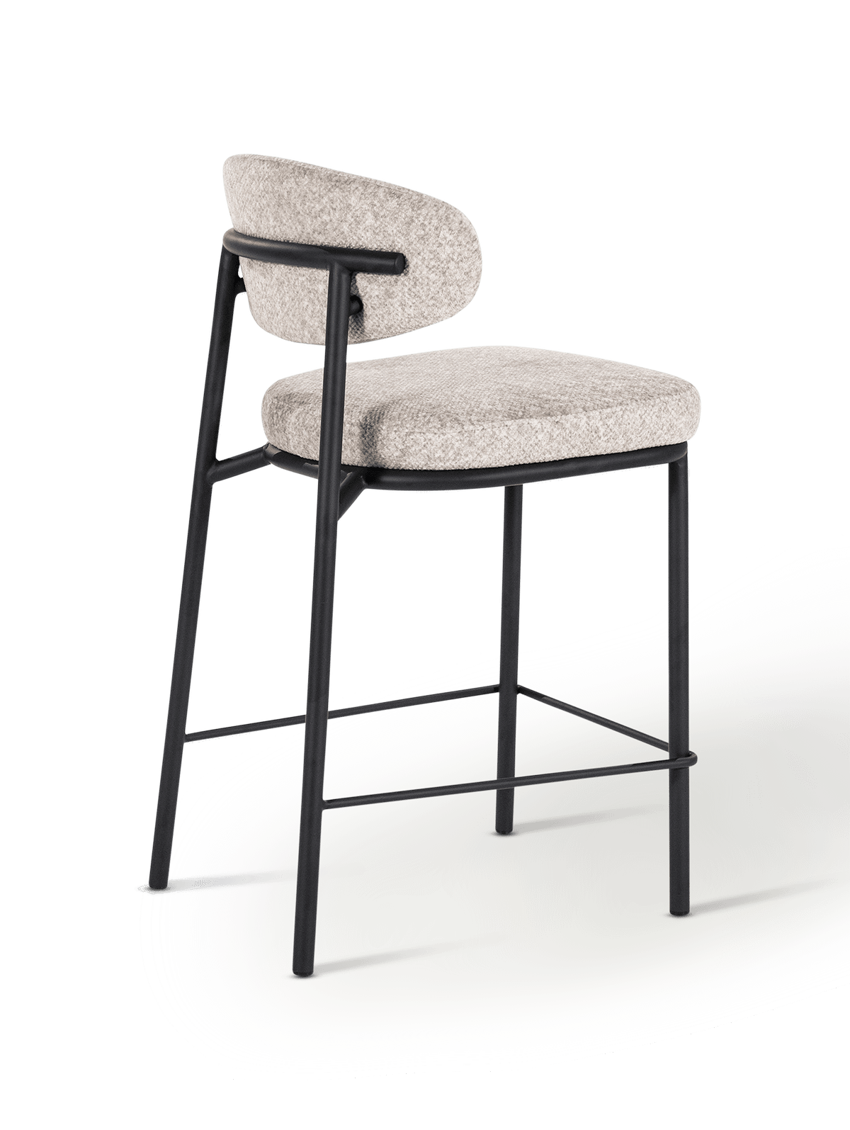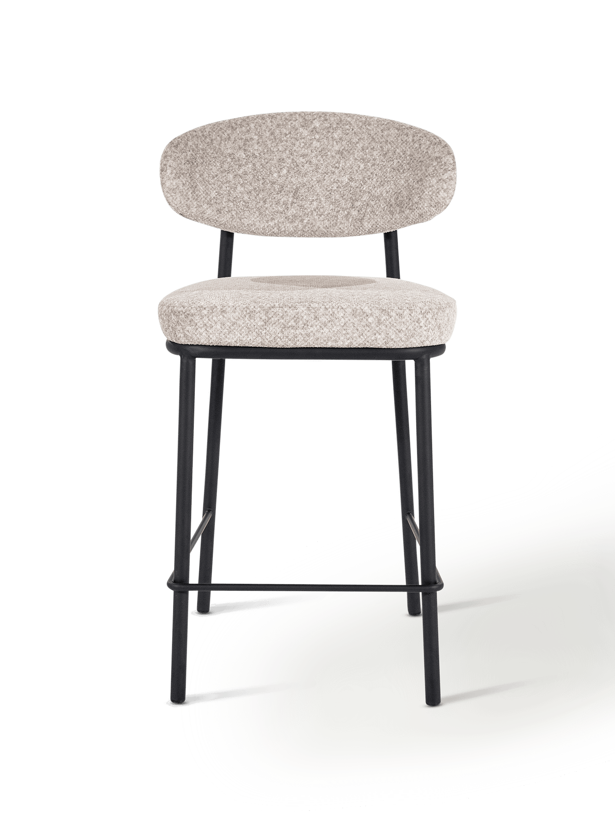 De Jari barstoel van By-boo met zijn afgeronde rugleuning en volle zitting biedt hij hetzelfde comfort en karakter als de Jari eetstoel. De lichte beige bekleding contrasteert met het zwarte metalen onderstel en brengt rust en verfijning in elke keuken- of baromgeving.