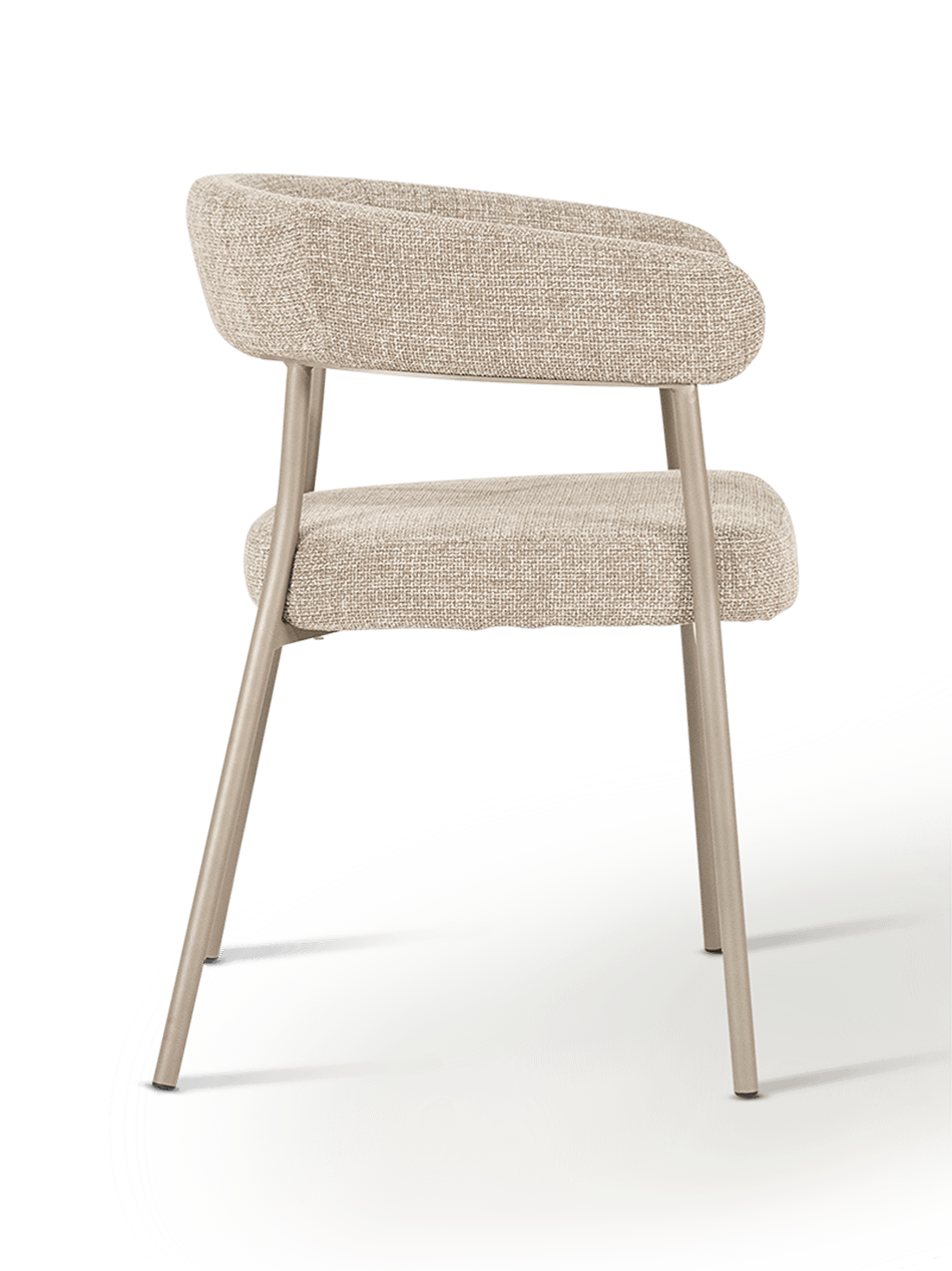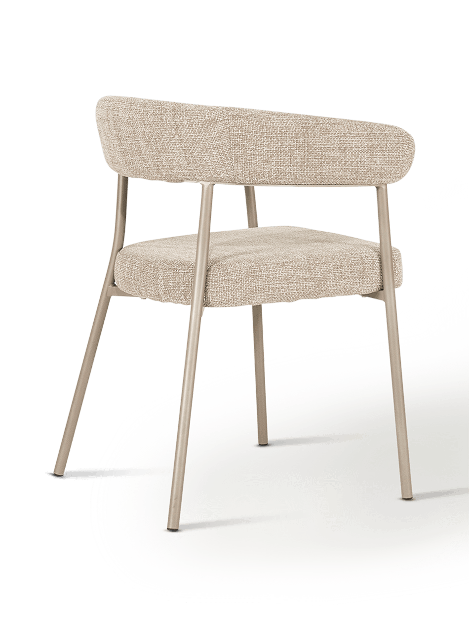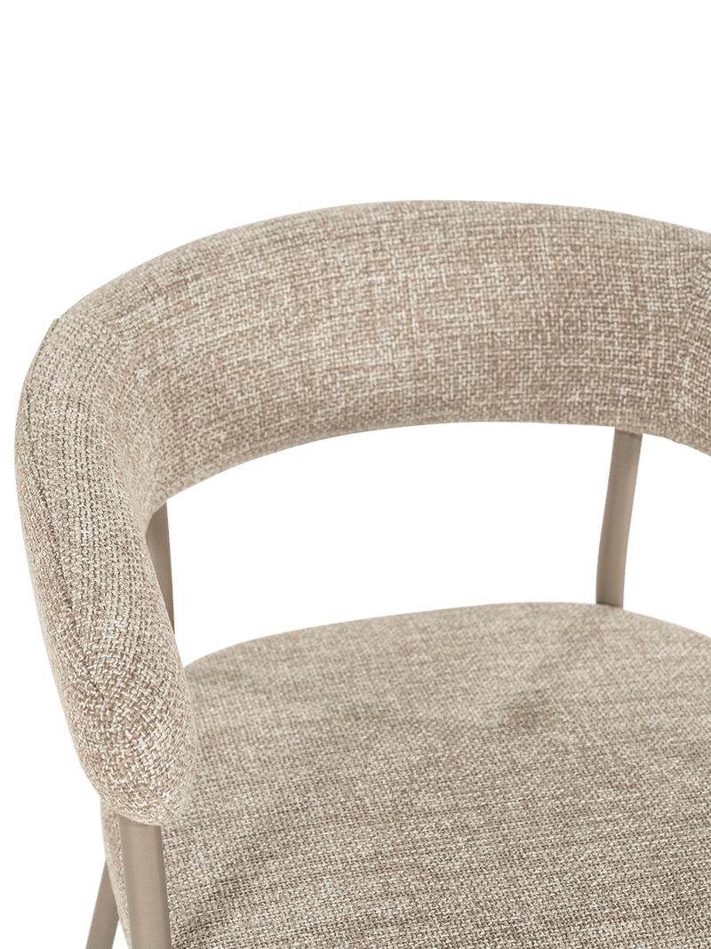 De Yovi stoel van By-boo combineert modern design met een warme, huiselijke uitstraling. De zachte taupekleurige bekleding en de metalen poten in bijpassende tint vormen samen een harmonieuze look die perfect past in zowel moderne als natuurlijke interieurs. De afgeronde rugleuning en zitting zorgen voor optimaal comfort, terwijl het luchtige ontwerp een gevoel van ruimte behoudt.