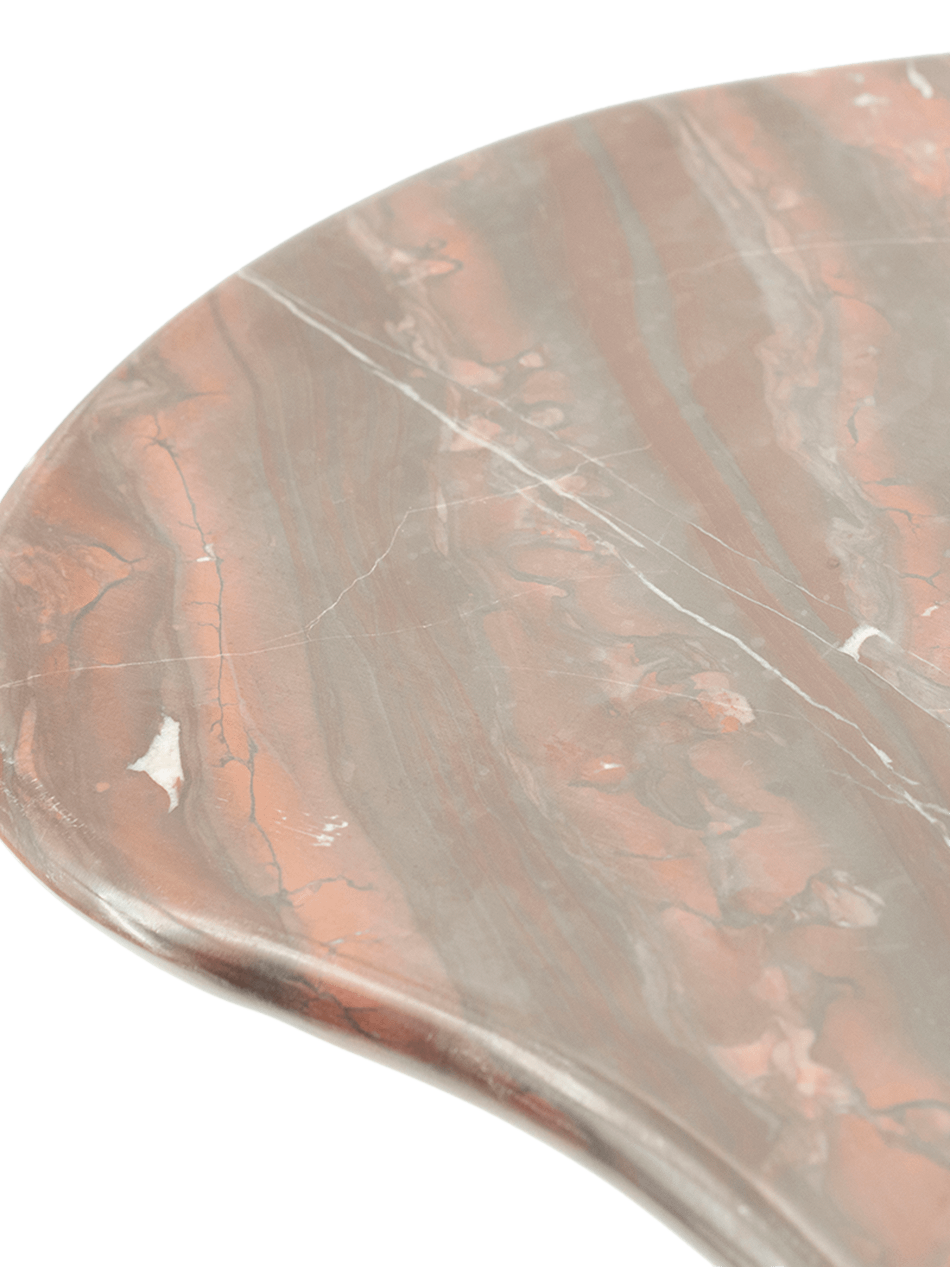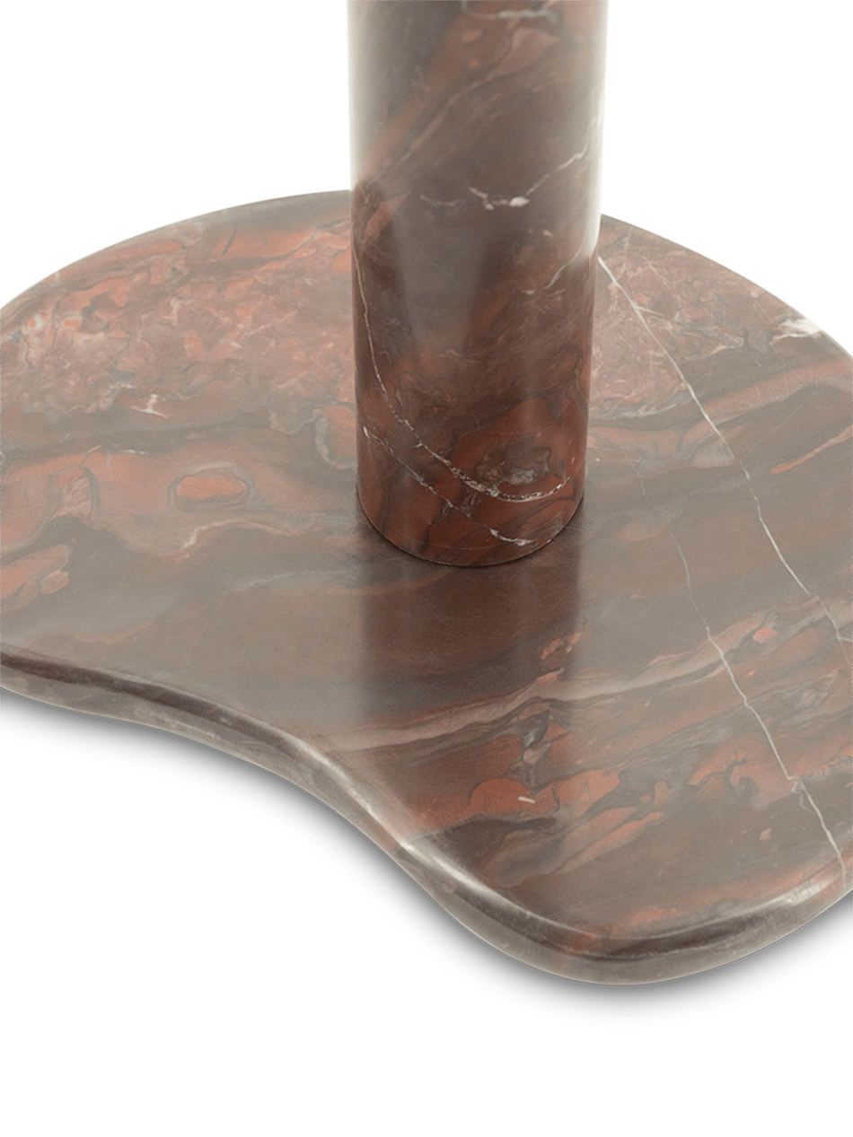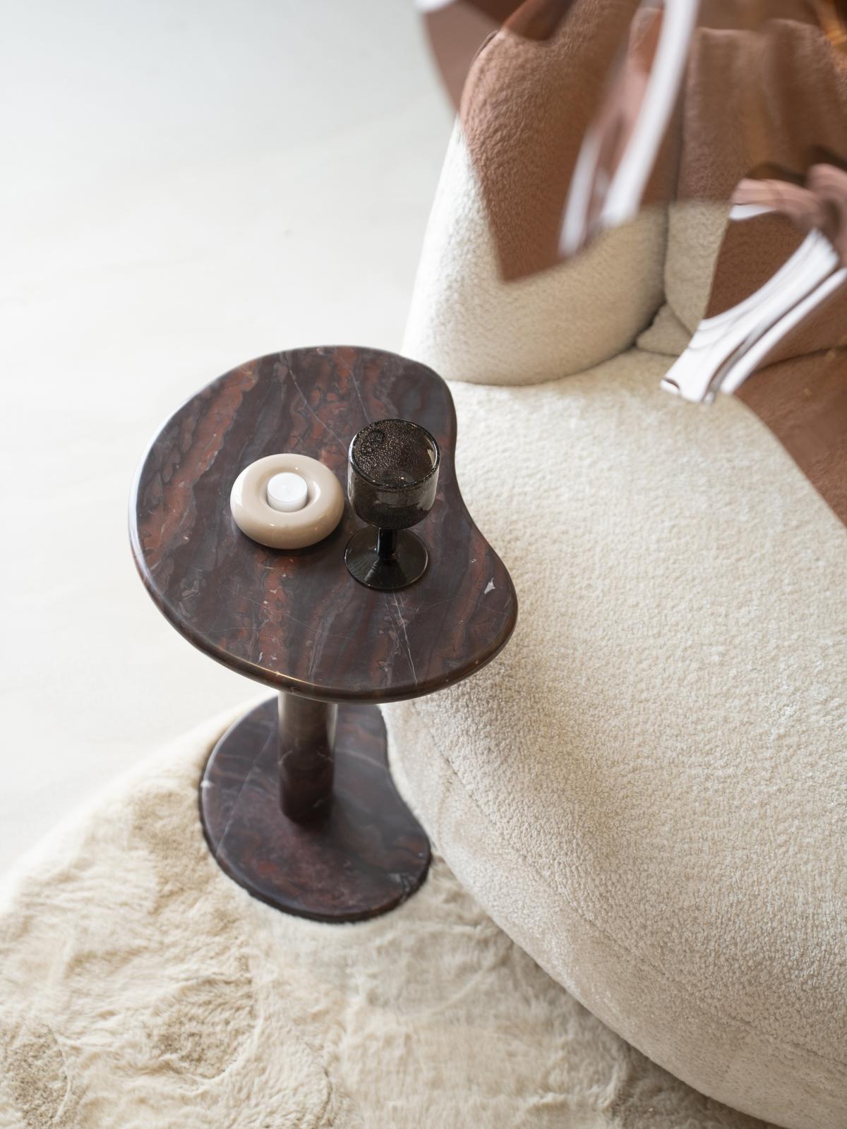 Met zijn zachte, organische vormen en glad gepolijst oppervlak oogt Rosso even sculpturaal als functioneel. De bijzettafel Rosse komt zowel naast een zetel als op zichzelf in een leeshoek of slaapkamer perfect tot zijn recht. Het diepe roodbruine marmer toont subtiele aders in grijze en witte nuances, waardoor de bijzettafel zich mooi laat combineren met warme houtsoorten, zachte stoffen en aardse tinten.