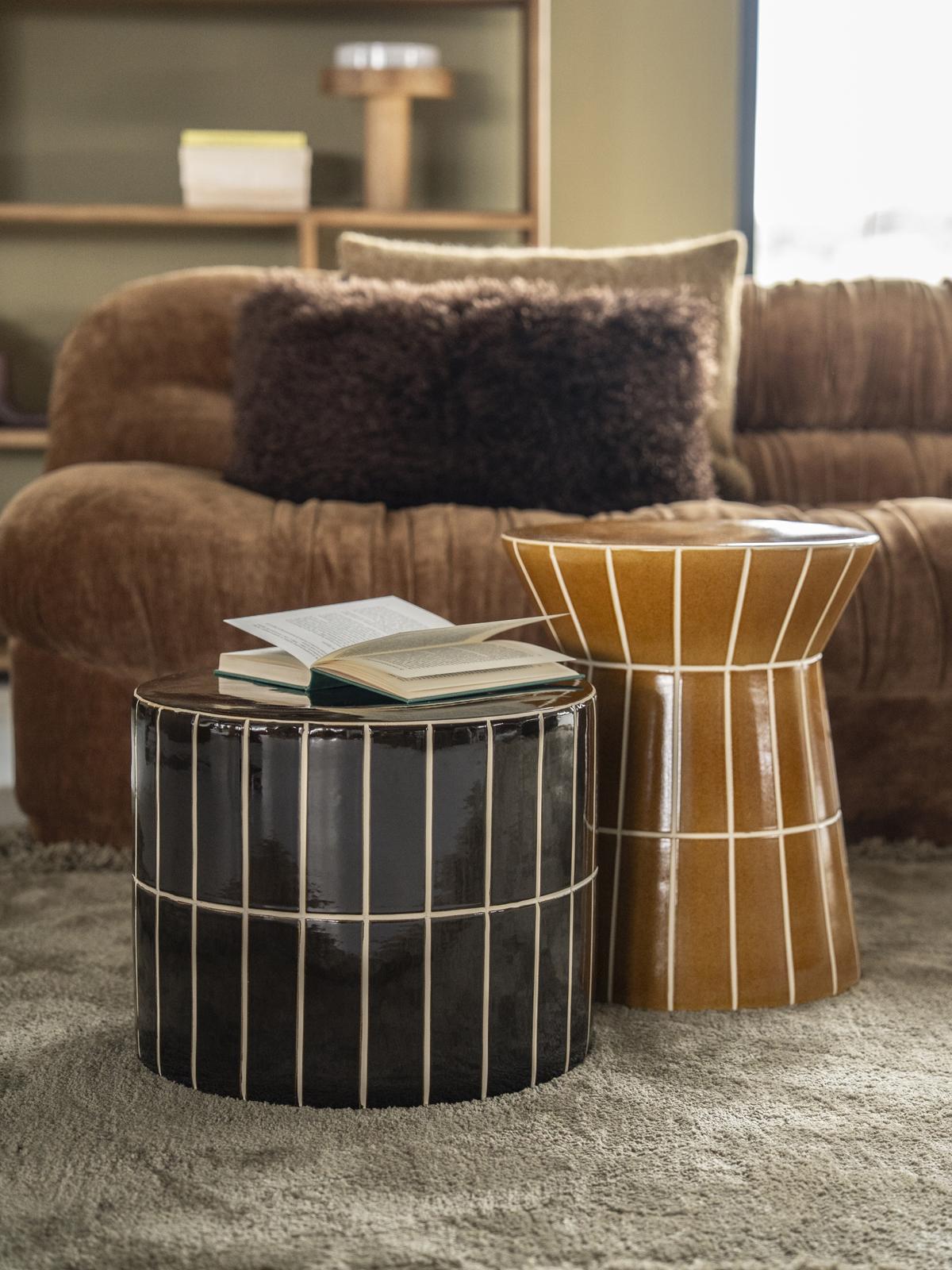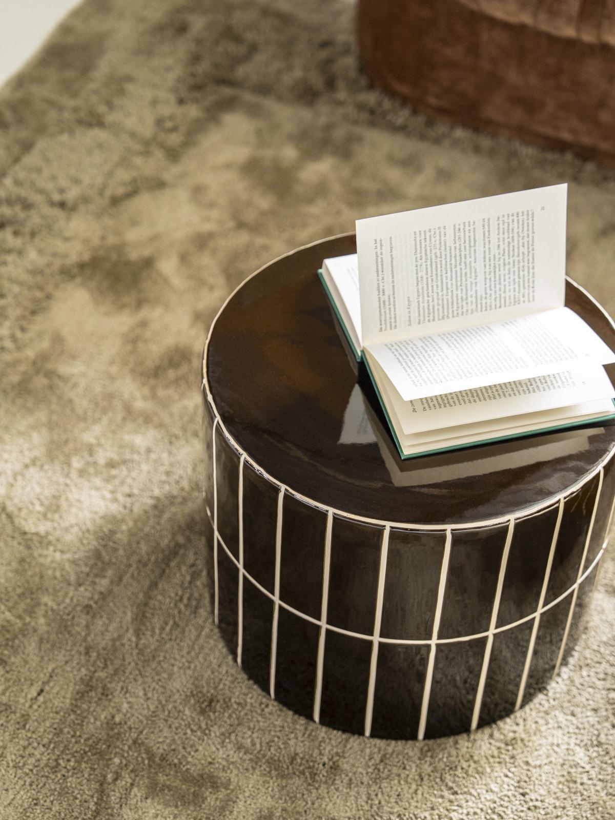 De Tiletastic bijzettafel van By-Boo in donkerbruin geglazuurd aardewerk straalt een rustige luxe uit. Het glanzende oppervlak en de contrasterende lichte lijnen zorgen voor een verfijnde structuur die subtiel speelt met licht en schaduw. Het cilindervormige ontwerp maakt van Tiletastic een tijdloos object dat zowel modern als warm aanvoelt.