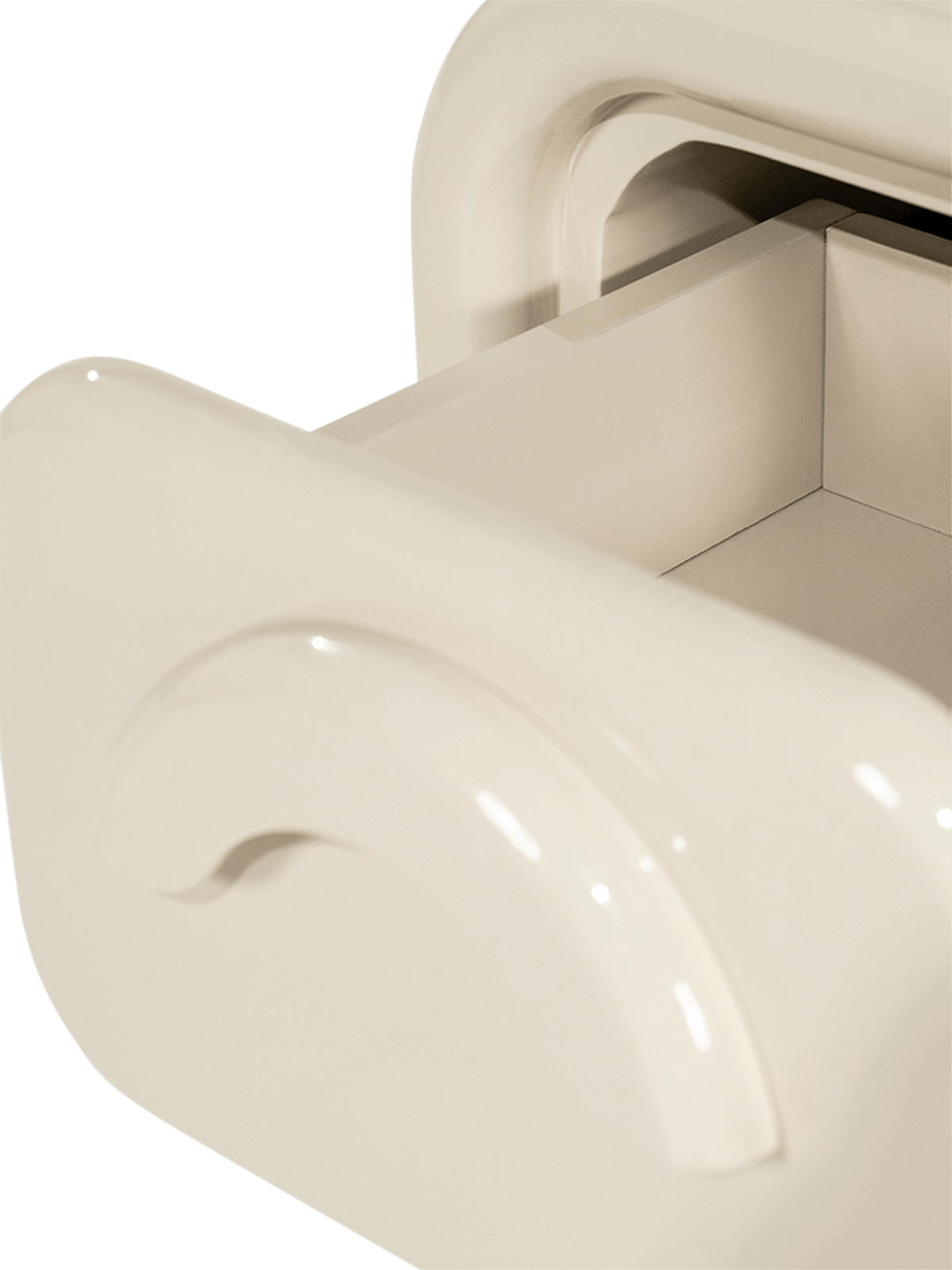 De twee lades met geïntegreerde handgrepen zijn niet alleen praktisch, maar versterken ook het karakteristieke design. Perfect als nachtkastje, bijzetkast of opbergmeubel in een modern of vintage geïnspireerd interieur.