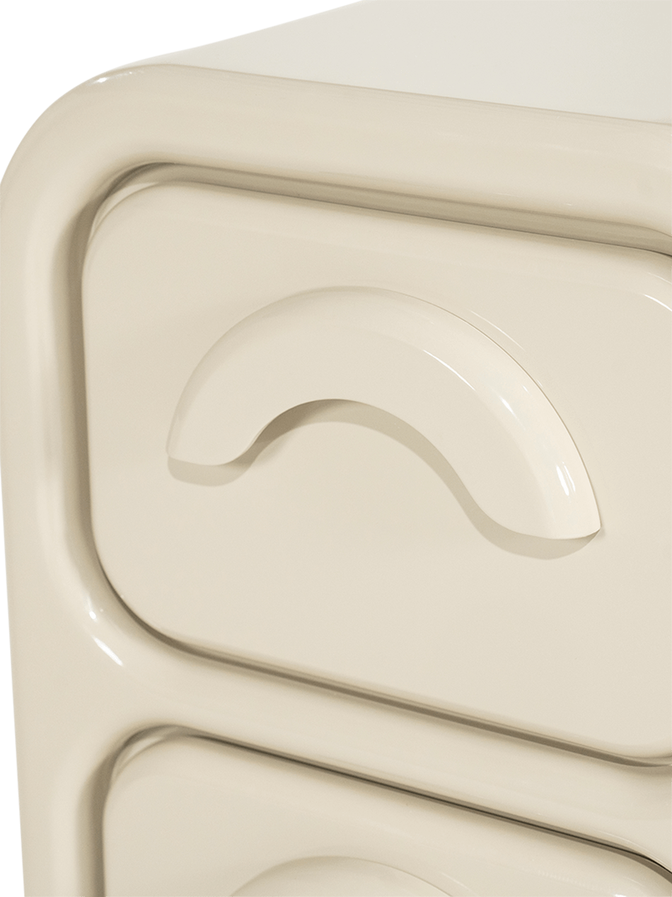 Het Gubby kastje van By-Boo brengt een speels vleugje retro in je interieur, met zijn afgeronde vormen en glanzende afwerking. De kast is uitgevoerd in beige MDF met een hoogglans coating, wat zorgt voor een frisse, eigentijdse look die zowel opvalt als harmonieus blendt met verschillende stijlen.