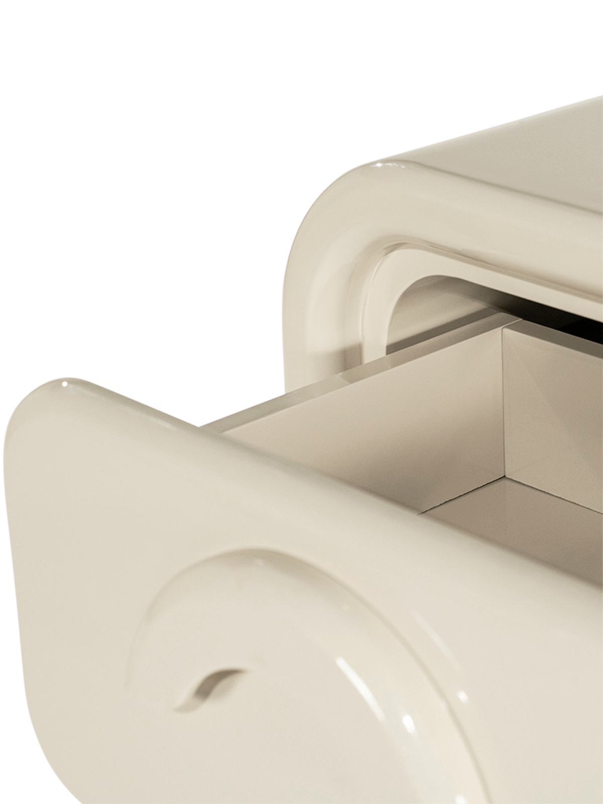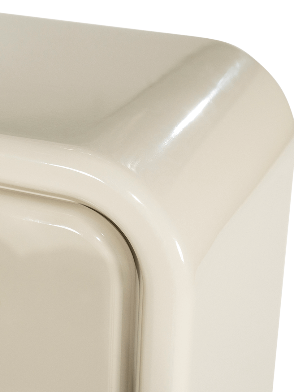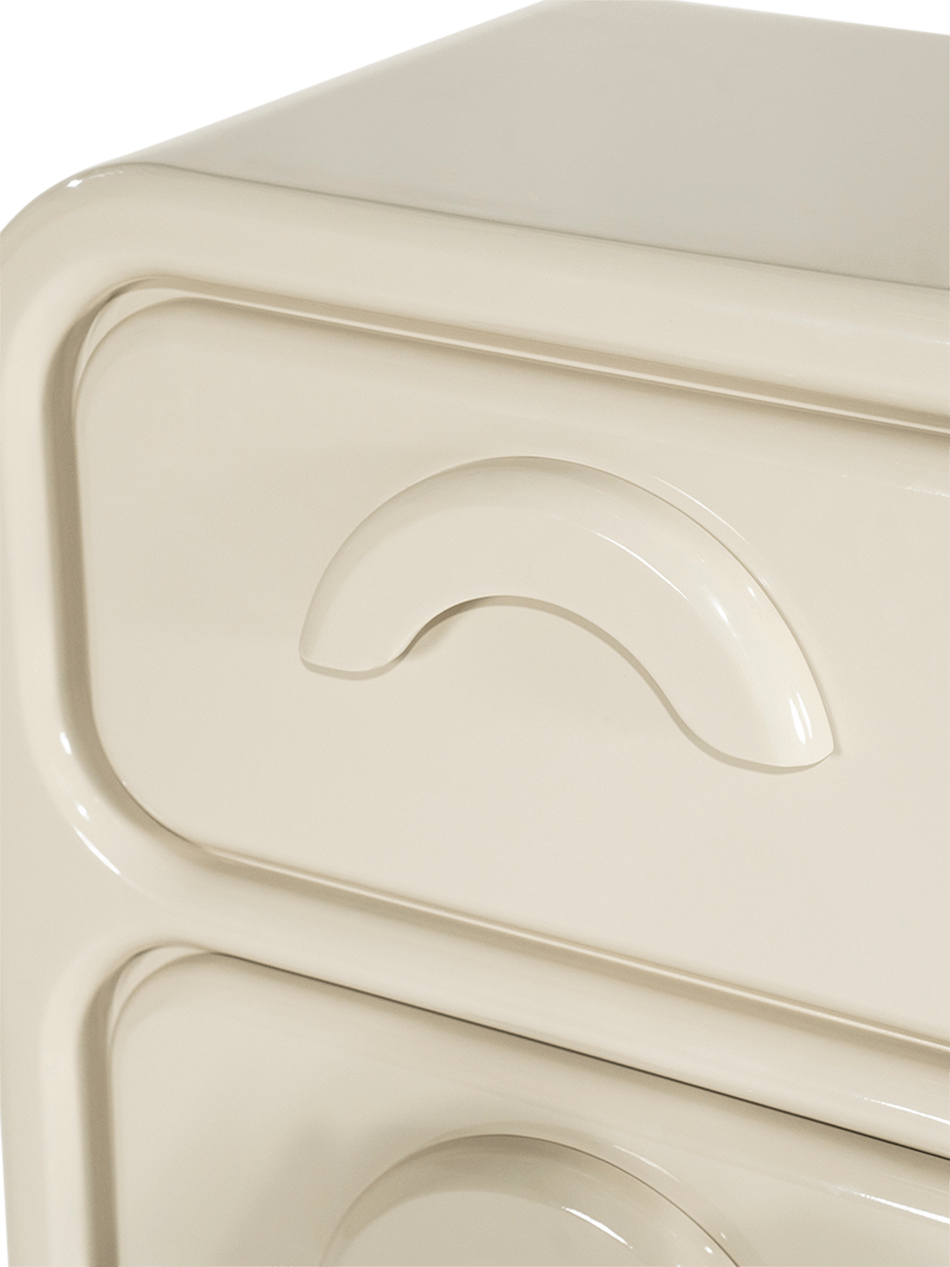 De Gubby ladekast van By-Boo combineert retro charme met een eigentijdse uitstraling. De afgeronde vormen, geïntegreerde handgrepen en glanzend gelakte afwerking in beige geven deze kast een stijlvolle, retro look.