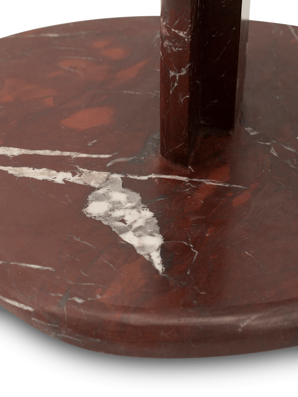 De Lior bijzettafel van By-Boo springt direct in het oog. Vervaardigd uit rood marmer met natuurlijke witte aders, straalt deze tafel pure verfijning en klasse uit. De zachte glans van het marmer en de organische vorm maken van de Lior niet alleen een functioneel meubel, maar ook een decoratief kunstobject.