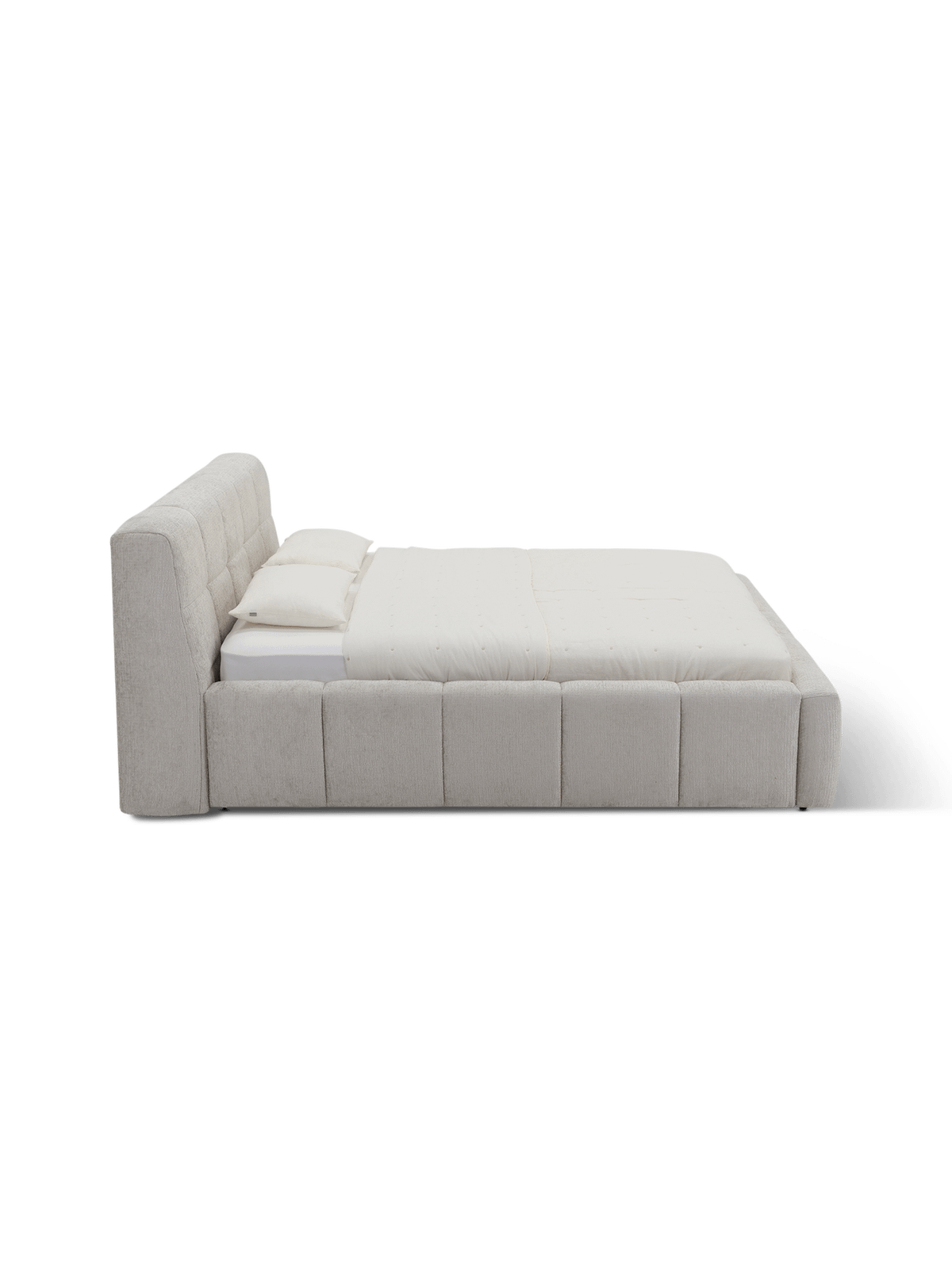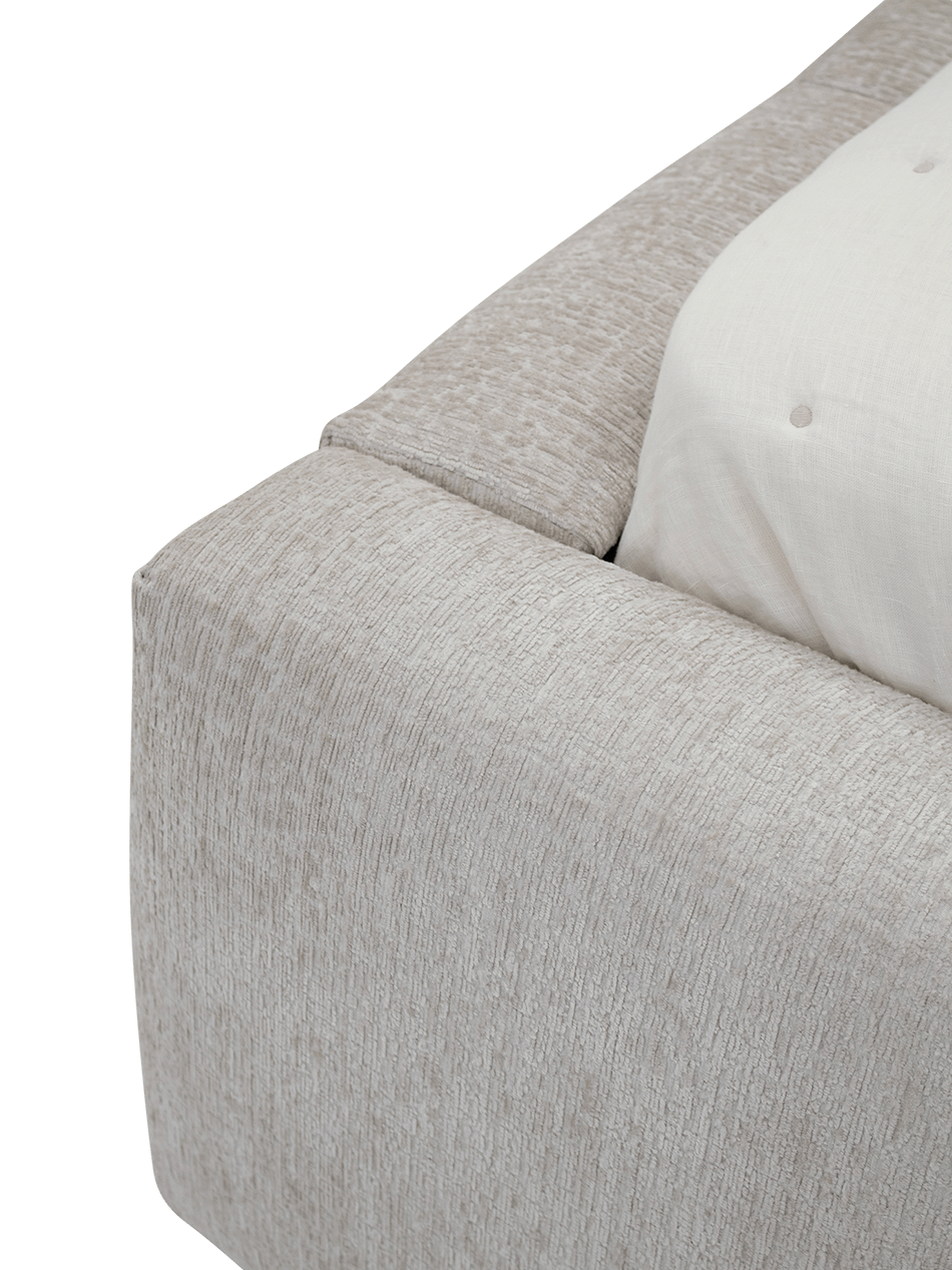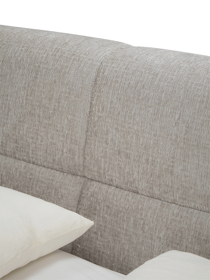 De stof Shell heeft een lichte, zandkleurige nuance en voelt luxueus aan door haar subtiele structuur. Ze is slijtvast, kleurvast en onderhoudsvriendelijk, waardoor het bed zijn frisse, elegante uitstraling behoudt — ook na jarenlang gebruik.