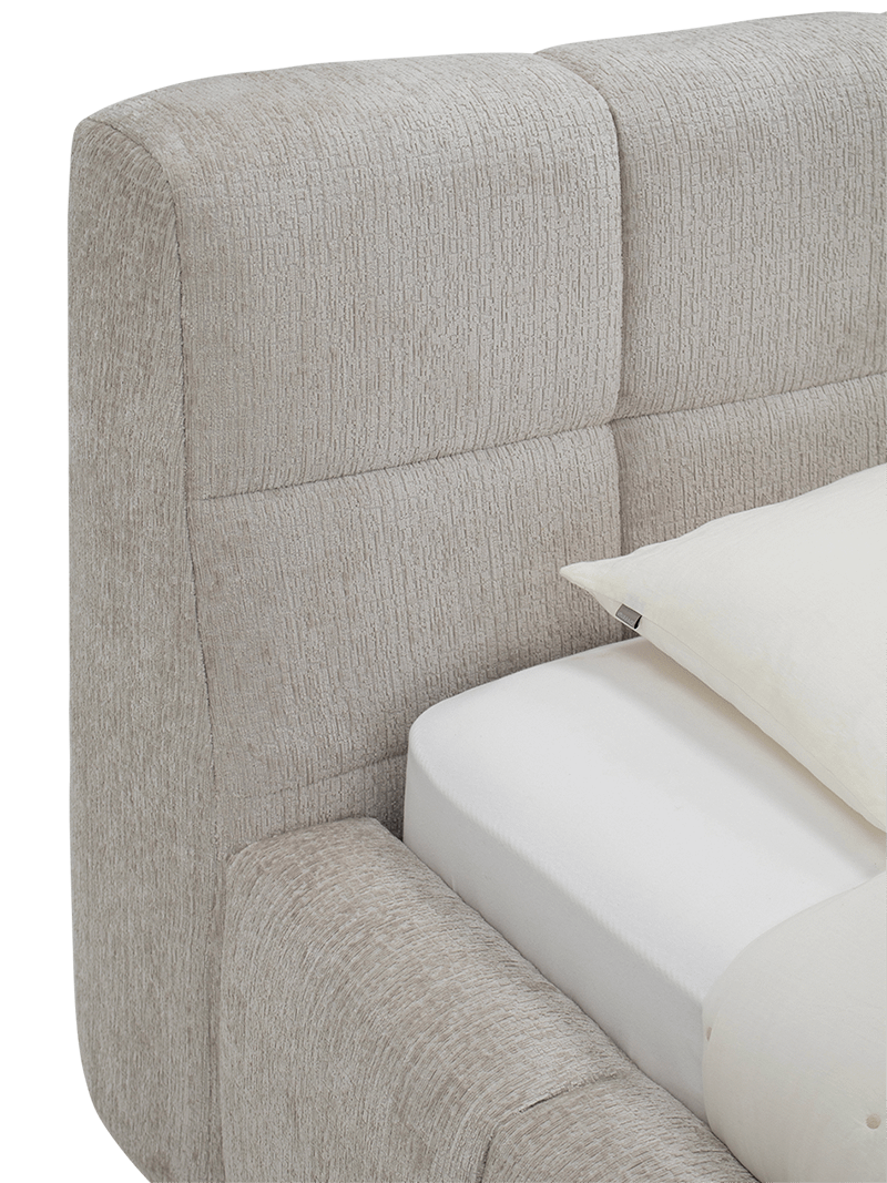 De gestoffeerde omlijsting loopt visueel door in het hoofdbord, dat horizontaal gestikt is voor extra reliëf. De combinatie van zachte rondingen en strakke lijnen maakt het VL 25 tijdloos en tegelijk volledig in lijn met de interieurtendensen van vandaag: natuurlijke materialen, tactiele stoffen en een rustgevende kleurtonaliteit.