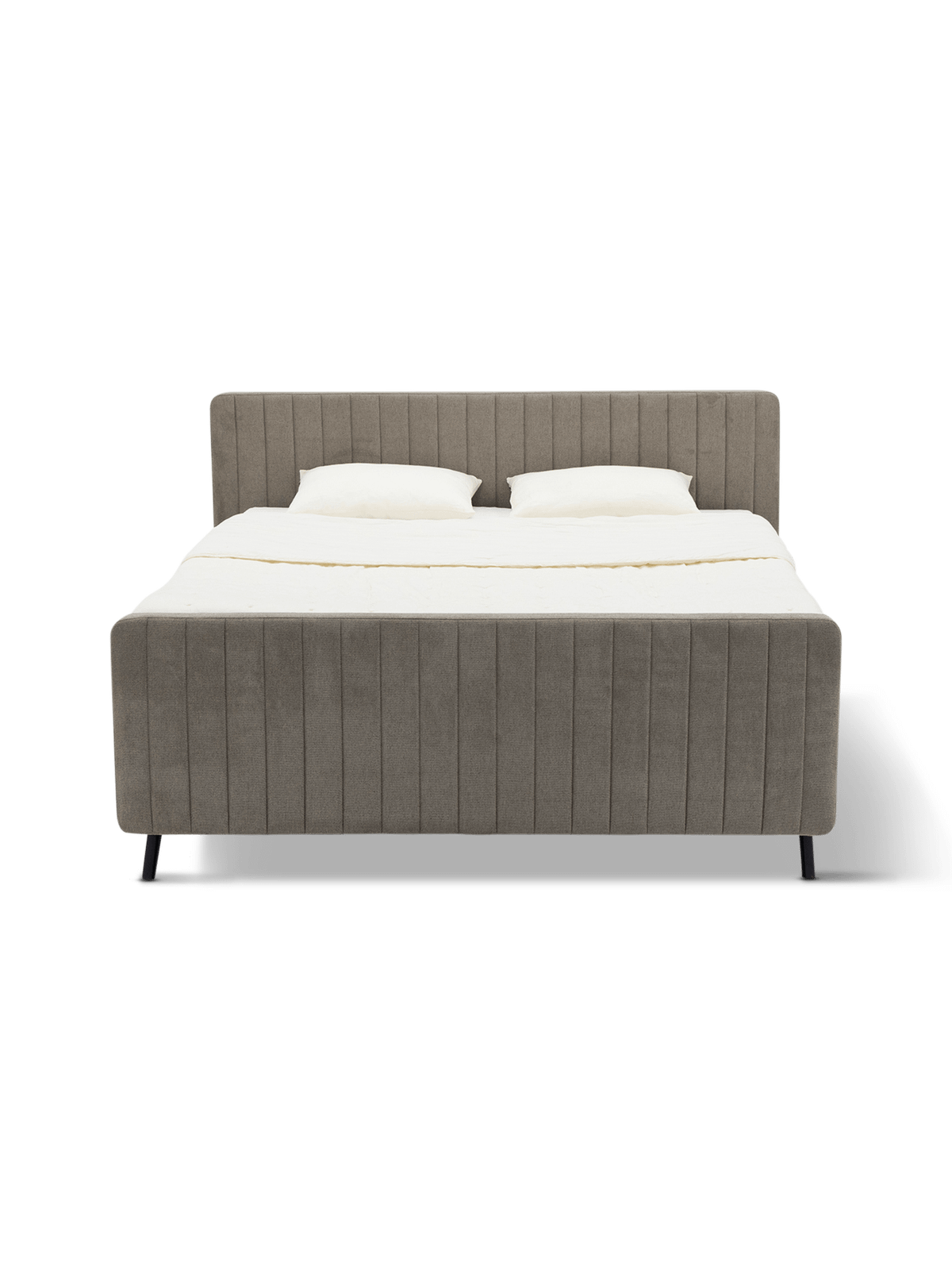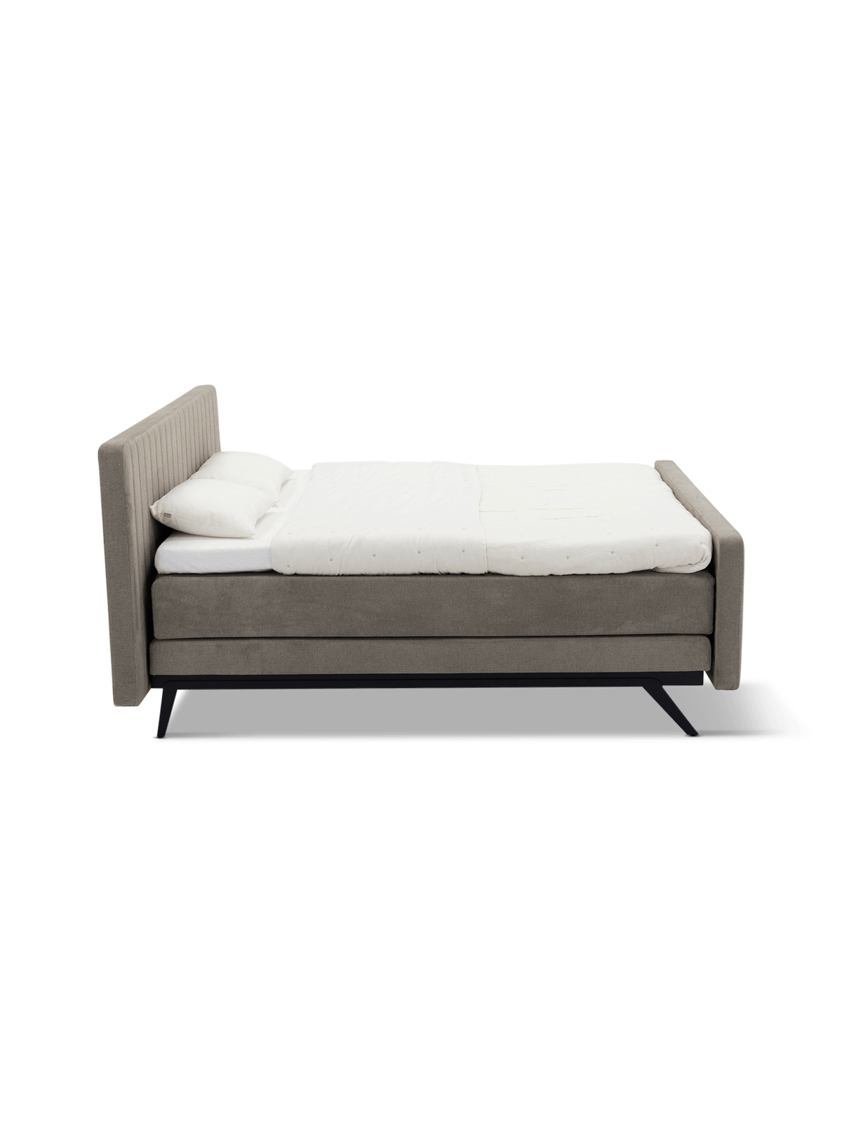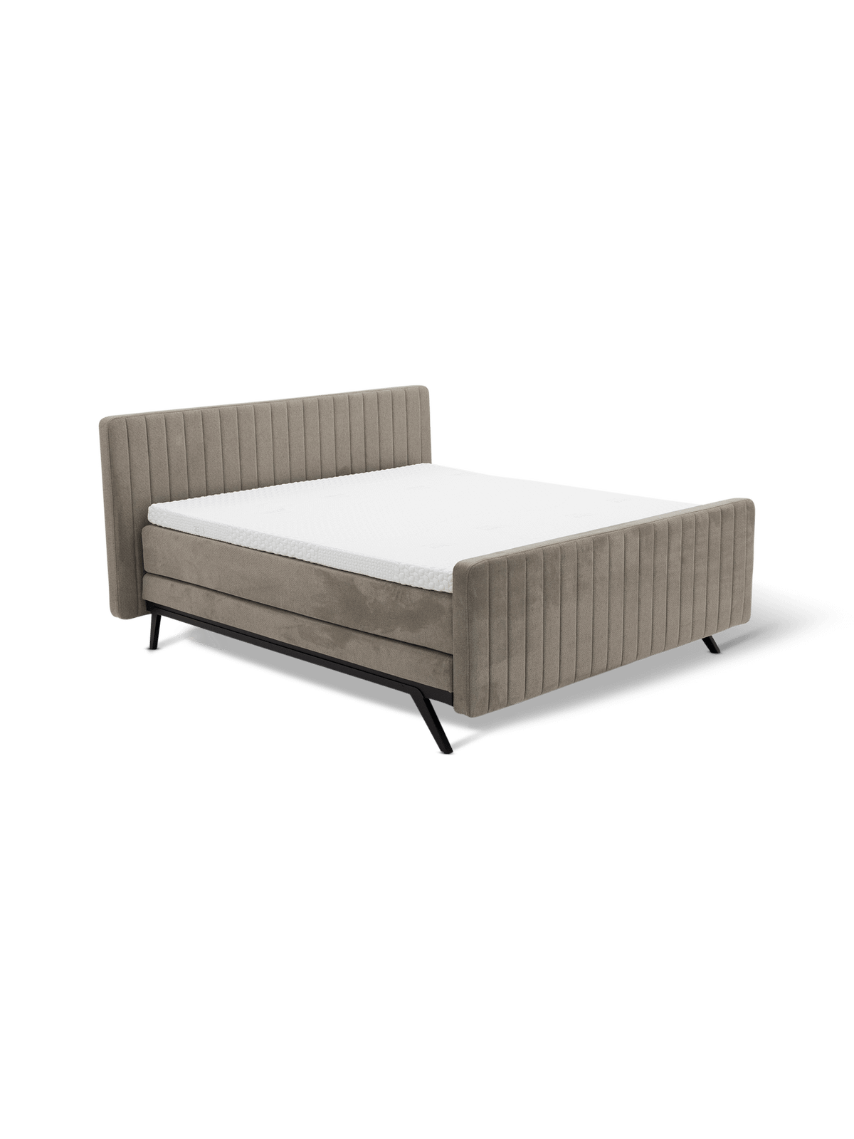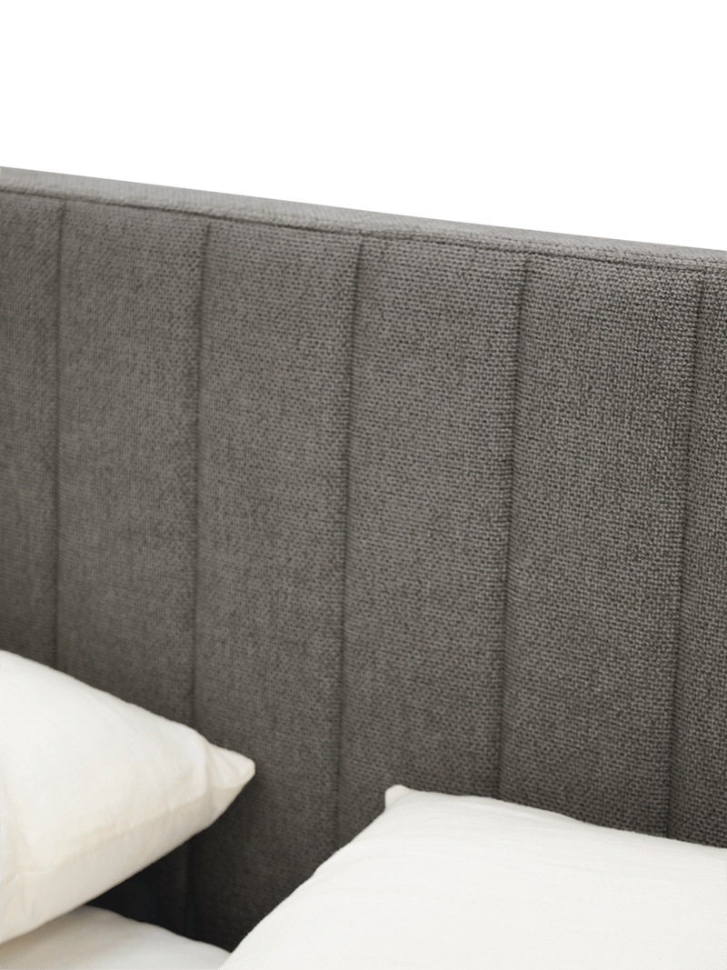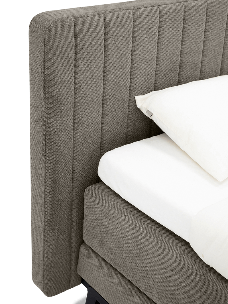 De boxspring Sunday S1 combineert modern design met uitstekend slaapcomfort. Deze uitvoering is afgewerkt in een groengrijze stof, waarbij het subtiele verticale lijnenspel op het hoofd- en voetbord zorgt voor een elegante en hedendaagse uitstraling. De harmonieuze vormgeving en verfijnde afwerking maken van de Sunday S1 een echte blikvanger in elke slaapkamer.