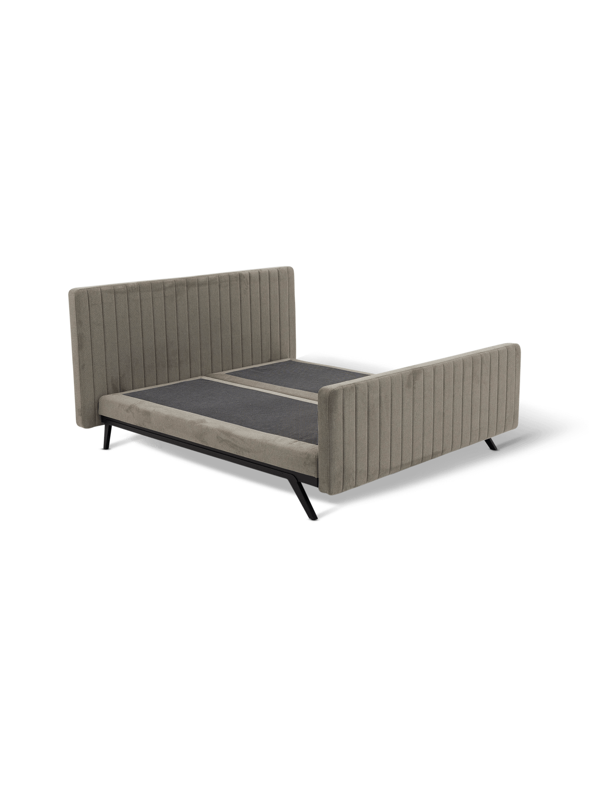 - Stof: groengrijs, met subtiel lijnenspel op hoofd- en voetbord