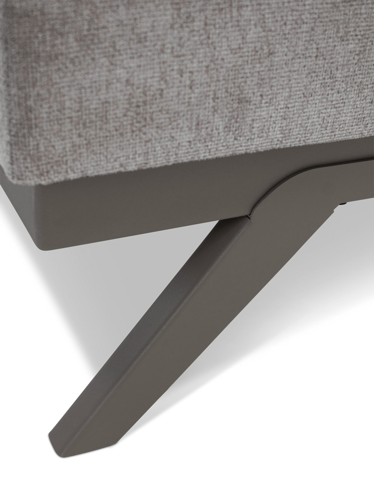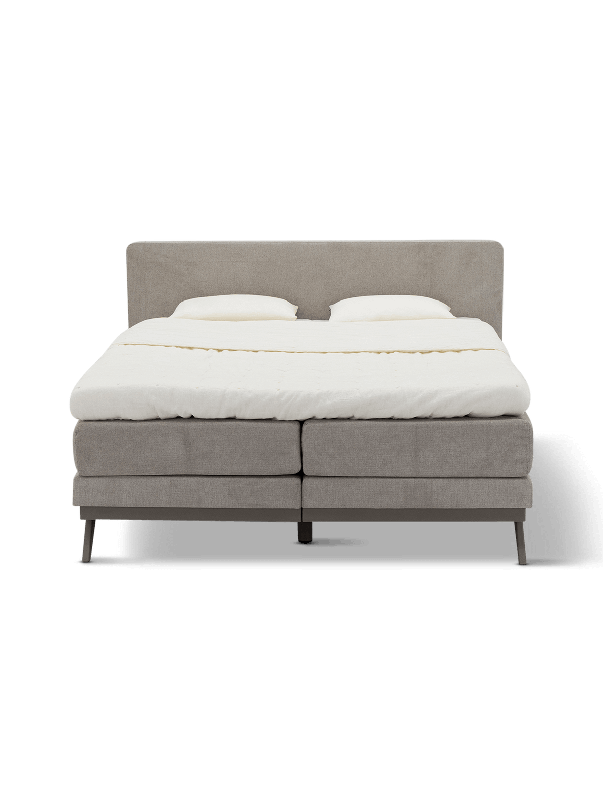 De Sunday boxspring is gestoffeerd in een warme grijze stof, wat een neutrale en rustige uitstraling geeft — perfect passend bij een modern of tijdloos slaapkamerinterieur. De ton-sur-ton pootjes versterken het zachte, stijlvolle totaalbeeld en maken dat het bed als één harmonieus meubel oogt.