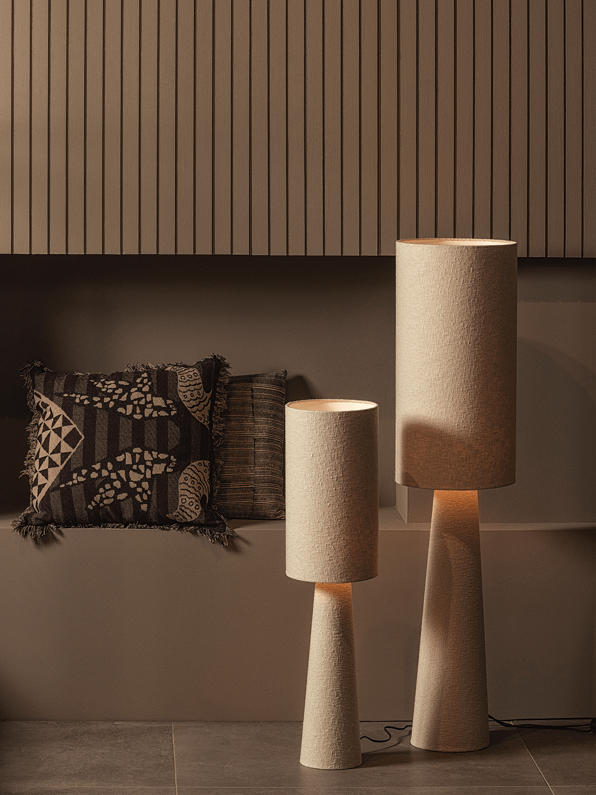De vloerlamp Loft XL van Woood brengt warmte en elegantie in je interieur. Met haar hoge, slanke silhouet en zachte bouclé bekleding straalt deze vloerlamp klasse uit. De natuurlijke textuur van de bouclé zorgt voor een subtiele zachtheid, terwijl de cilindervormige kap het licht mooi verspreidt voor een sfeervolle gloed.
