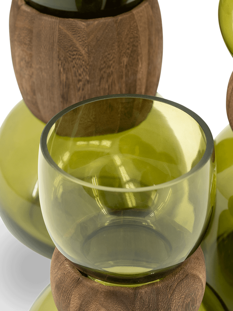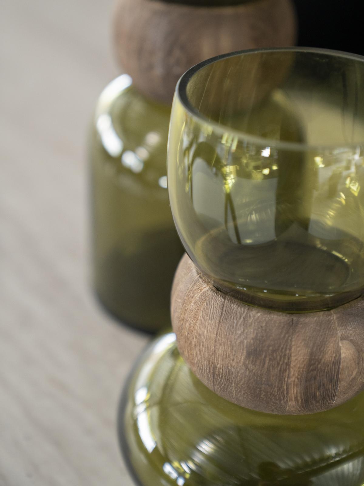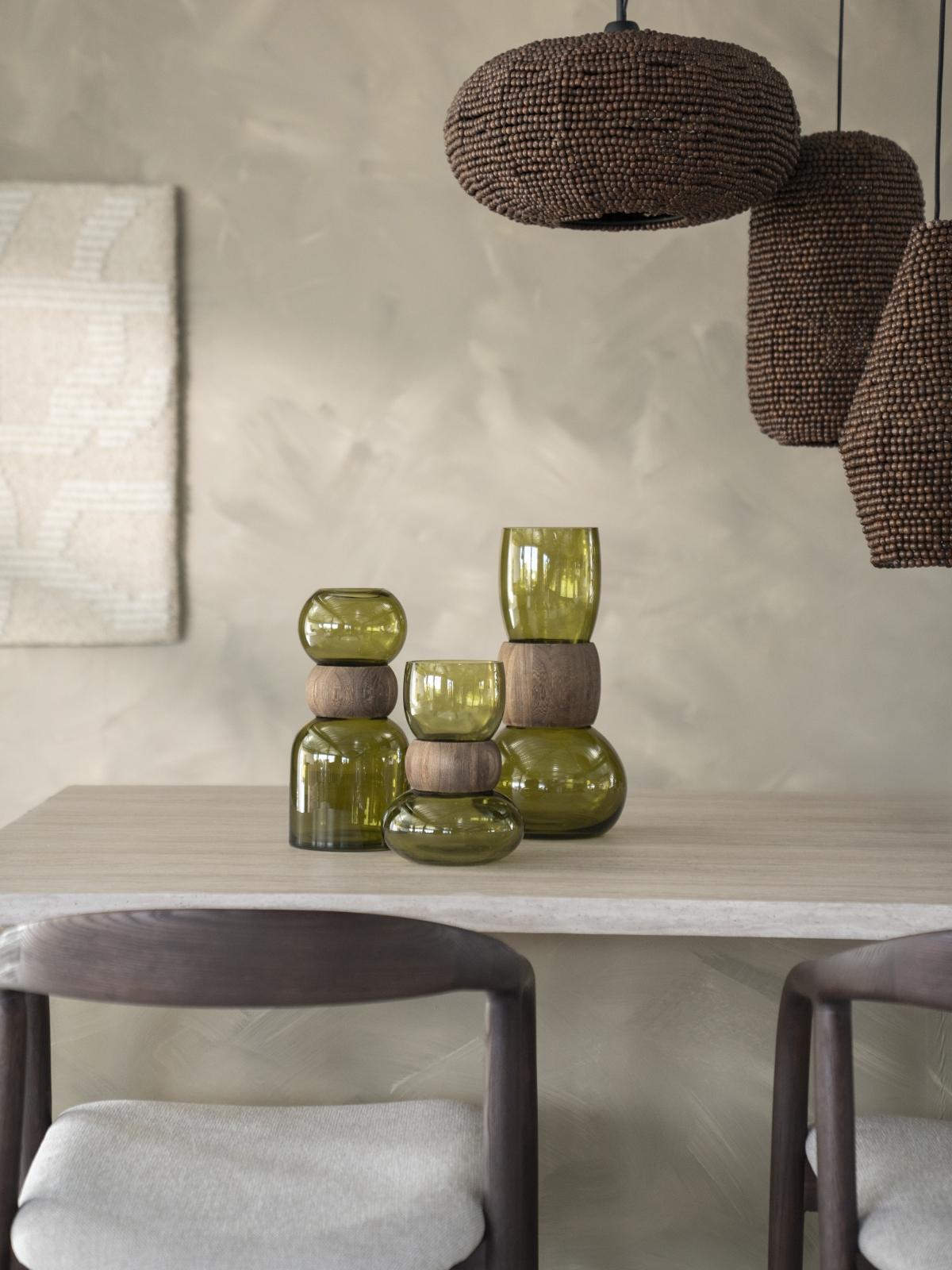 De Vaas Verra S van het toonaangevende merk By-Boo is een uniek decoratief object, perfect voor iedereen die op zoek is naar een blikvanger met een natuurlijke esthetiek. Deze vaas combineert op twee contrasterende materialen: groen glas en hout. Het design is zowel modern als tijdloos en voegt direct warmte en een eigentijdse sfeer toe aan je interieur.
