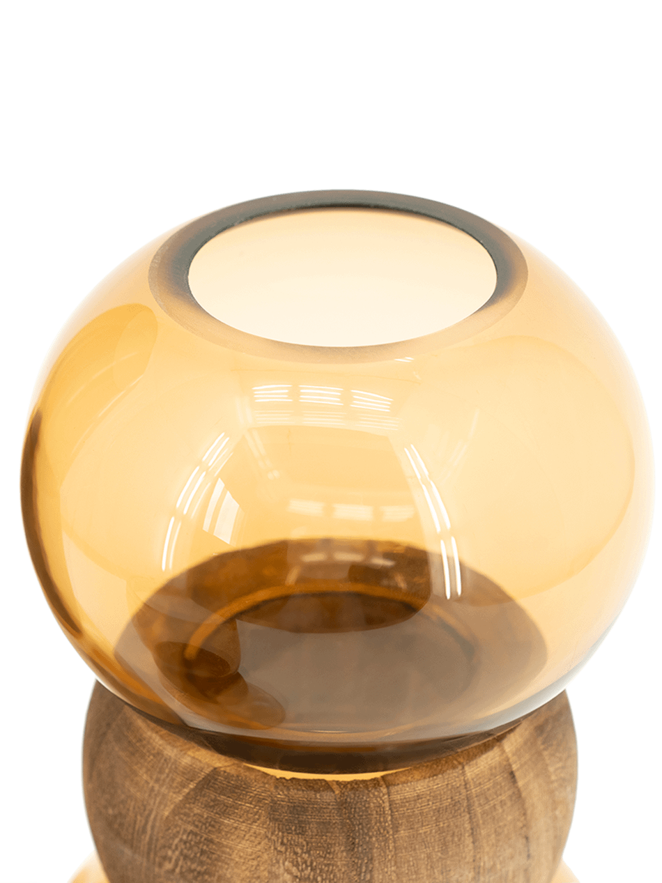 De vaas Verra M van By-Boo is perfect voor iedereen die op zoek is naar een blikvanger met een natuurlijke esthetiek. Deze vaas combineert op harmonieuze wijze twee contrasterende materialen: bruin glas en hout. Het design, waarbij de elementen op elkaar gestapeld lijken, is zowel modern als tijdloos.