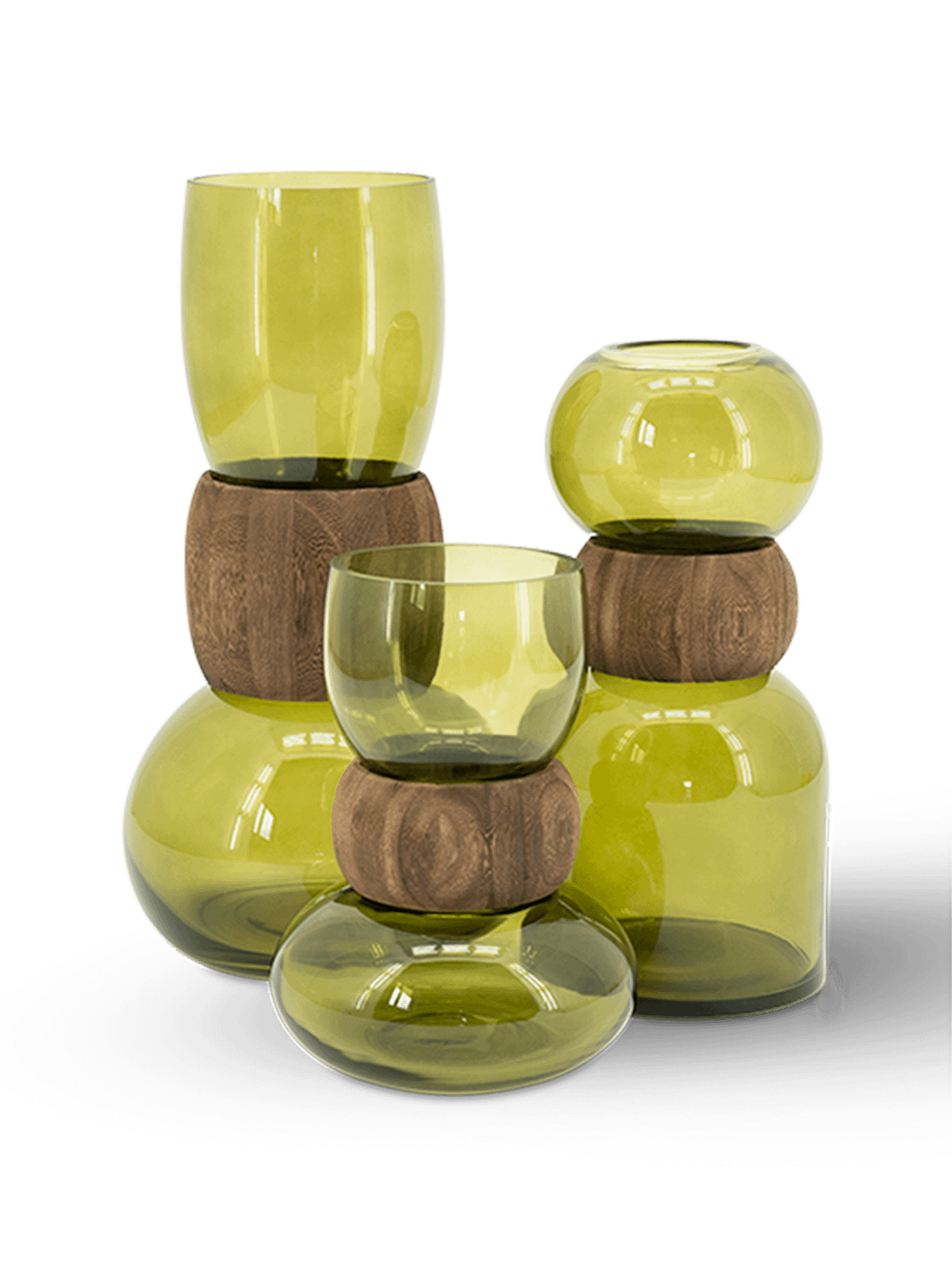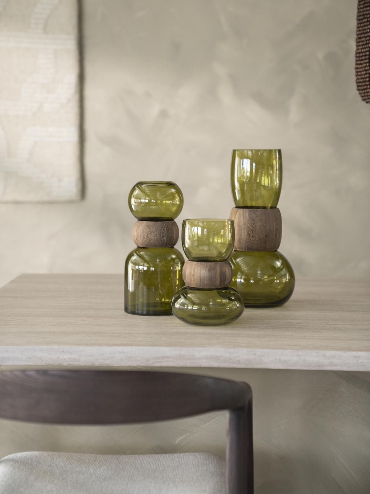 De Vaas Verra L van By-Boo is perfect voor iedereen die op zoek is naar een statement piece met een natuurlijke esthetiek. Deze grote vaas combineert twee contrasterende materialen: groen glas en hout. Het gestapelde design is zowel modern als tijdloos.