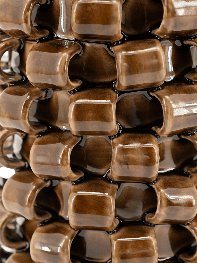 Gebruik de vaas met verse bloemen, droogtakken of pluimen, of laat haar solo schitteren als sculpturaal accent. De bruine tint zorgt voor diepte en warmte, en past moeiteloos binnen verschillende kleurpaletten – van zachte neutrale tinten tot donkere houtsoorten.