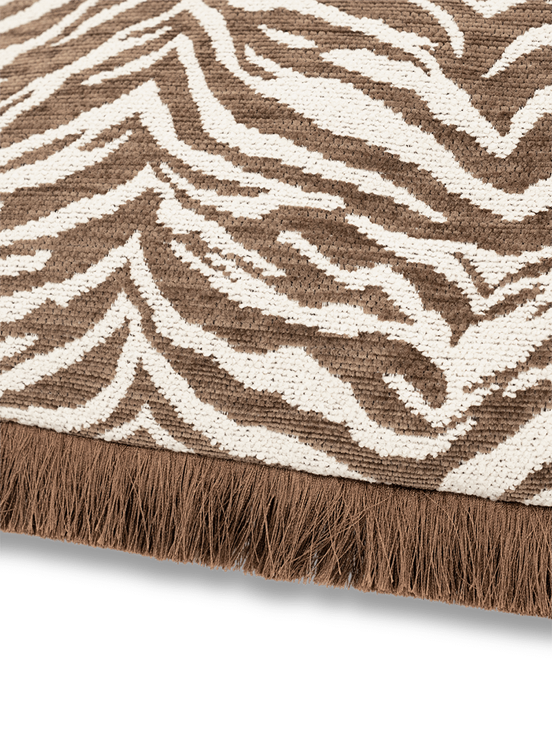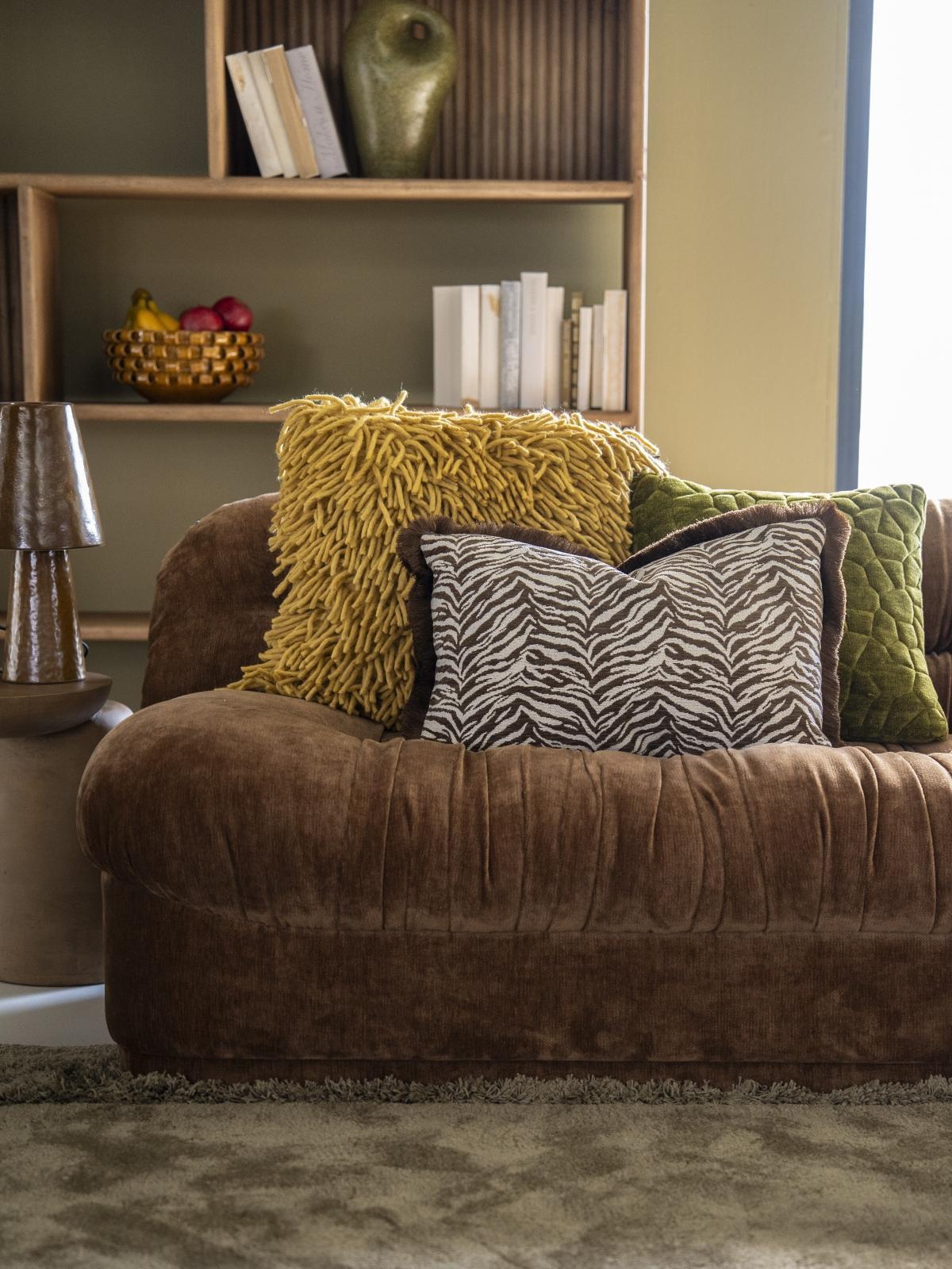Het Tigra kussen van By-Boo in bruin en wit brengt warmte in elk interieur. De speelse dierenprint krijgt extra karakter dankzij de decoratieve franjes langs de randen – een subtiel detail dat zorgt voor een gezellige uitstraling.