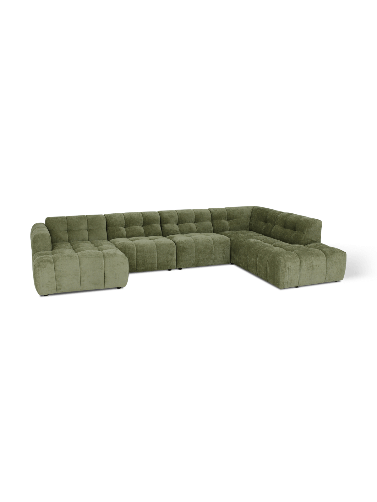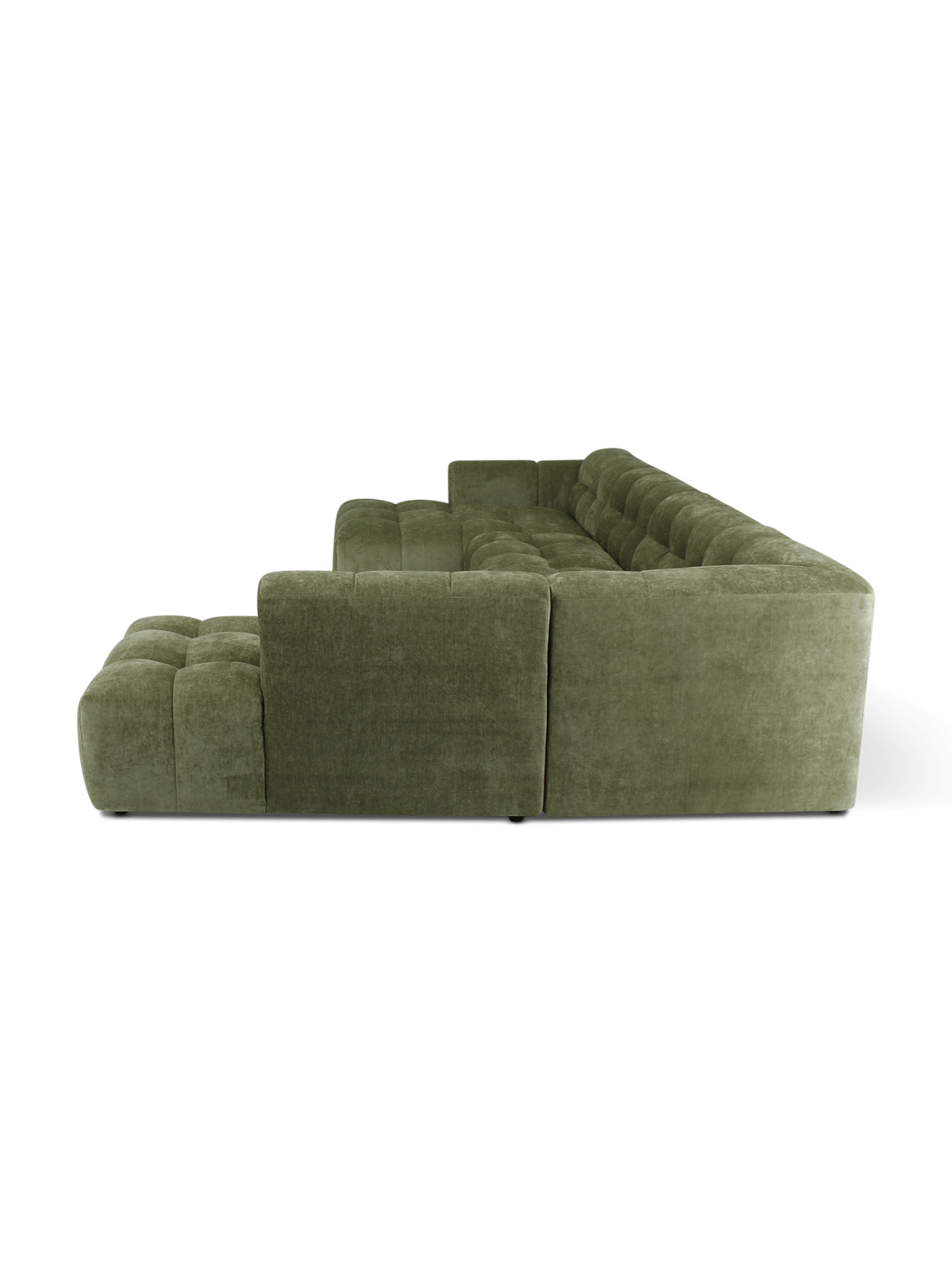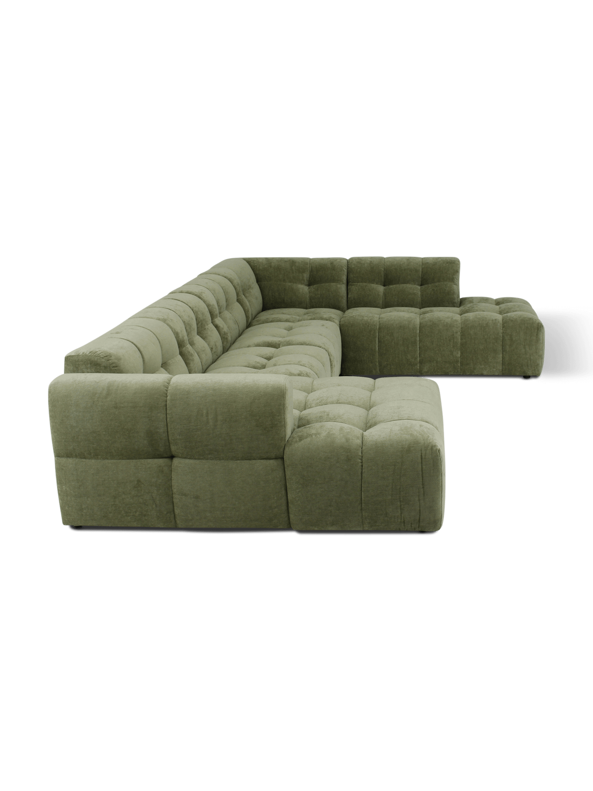 Hoeksalon Gusta brengt zachtheid en volume samen in een hedendaags ontwerp dat rust uitstraalt. De afmetingen (241 x 381 x 76 x 165 cm) maken van dit model het perfecte middelpunt van de leefruimte. Bekleed met een groene veloursachtige stof voelt Gusta niet alleen luxueus aan, maar geeft hij de kamer ook een warme, verfijnde uitstraling. De stof vangt het licht op een subtiele manier en zorgt voor diepte en nuance in kleur.