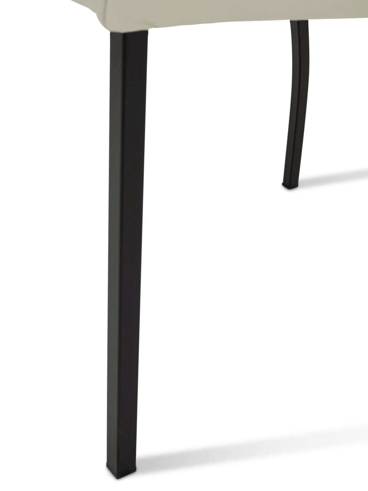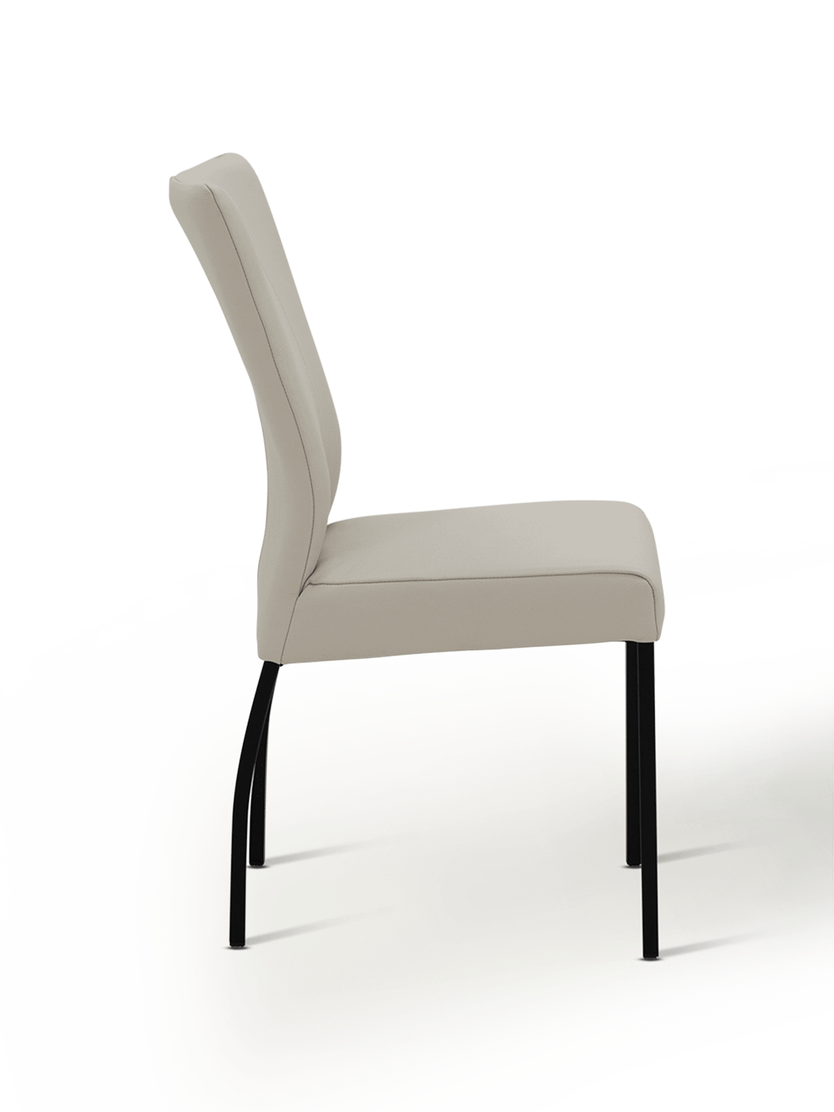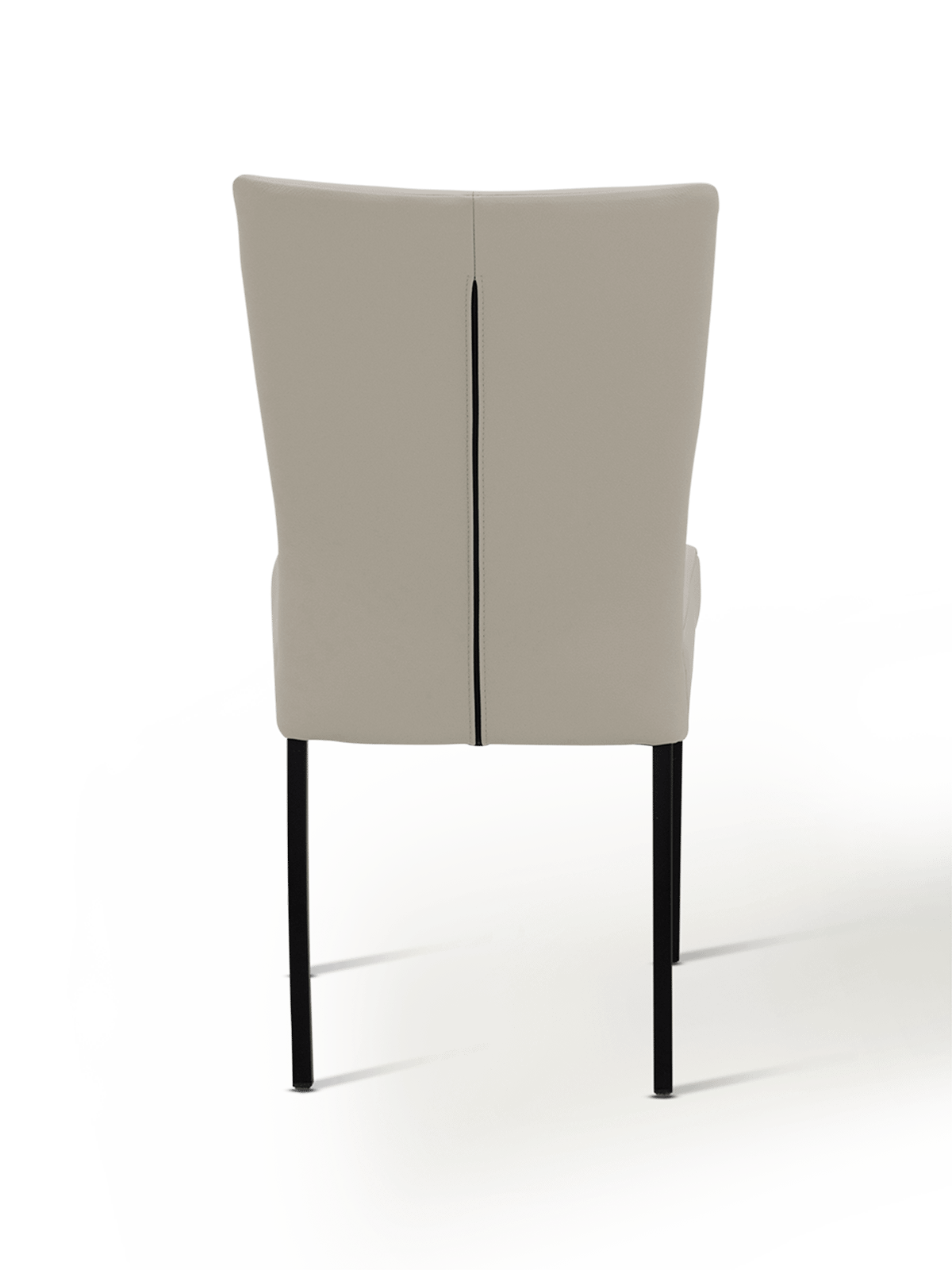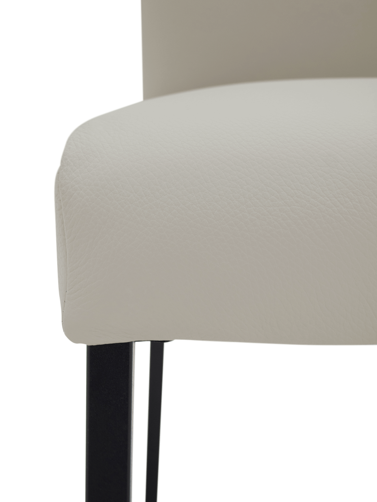 De stoel Riley brengt een moderne elegantie in elke eetruimte. De uitvoering in Toledo Nebbia – een zachte, onderhoudsvriendelijke microlederlook – zorgt voor een verfijnde uitstraling met een warme toets. De zwarte metalen poten geven de stoel een strak en tijdloos karakter, waardoor hij moeiteloos combineerbaar is met verschillende tafelstijlen.