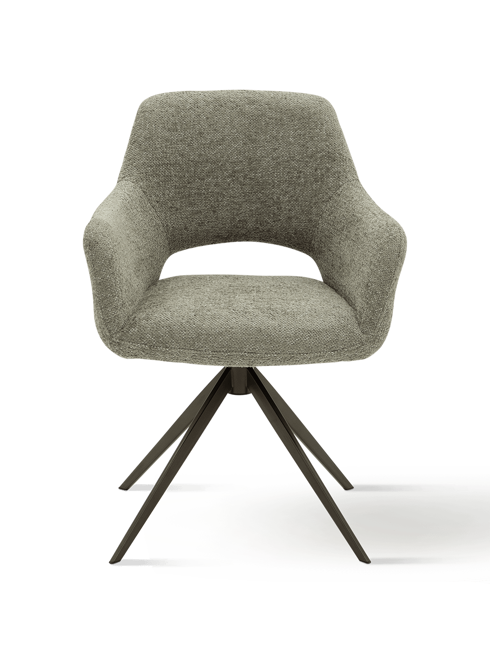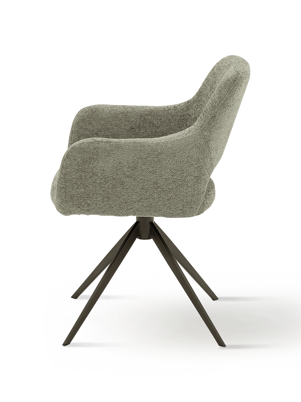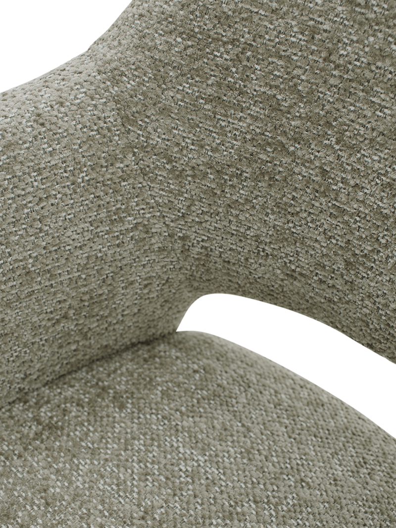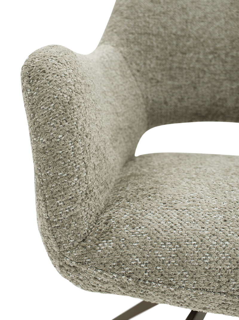 De elegante bronzen sterpoot geeft de stoel een moderne en luxueuze look. Het slanke metalen onderstel zorgt voor een luchtige uitstraling, terwijl het tegelijk stevig en stabiel blijft in dagelijks gebruik. In combinatie met de Misty Green bekleding ontstaat een mooi evenwicht tussen warmte, stijl en modern design.
