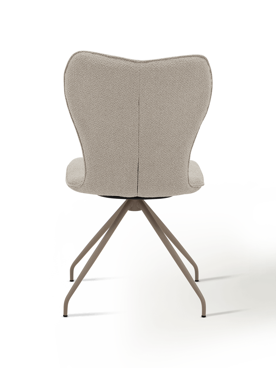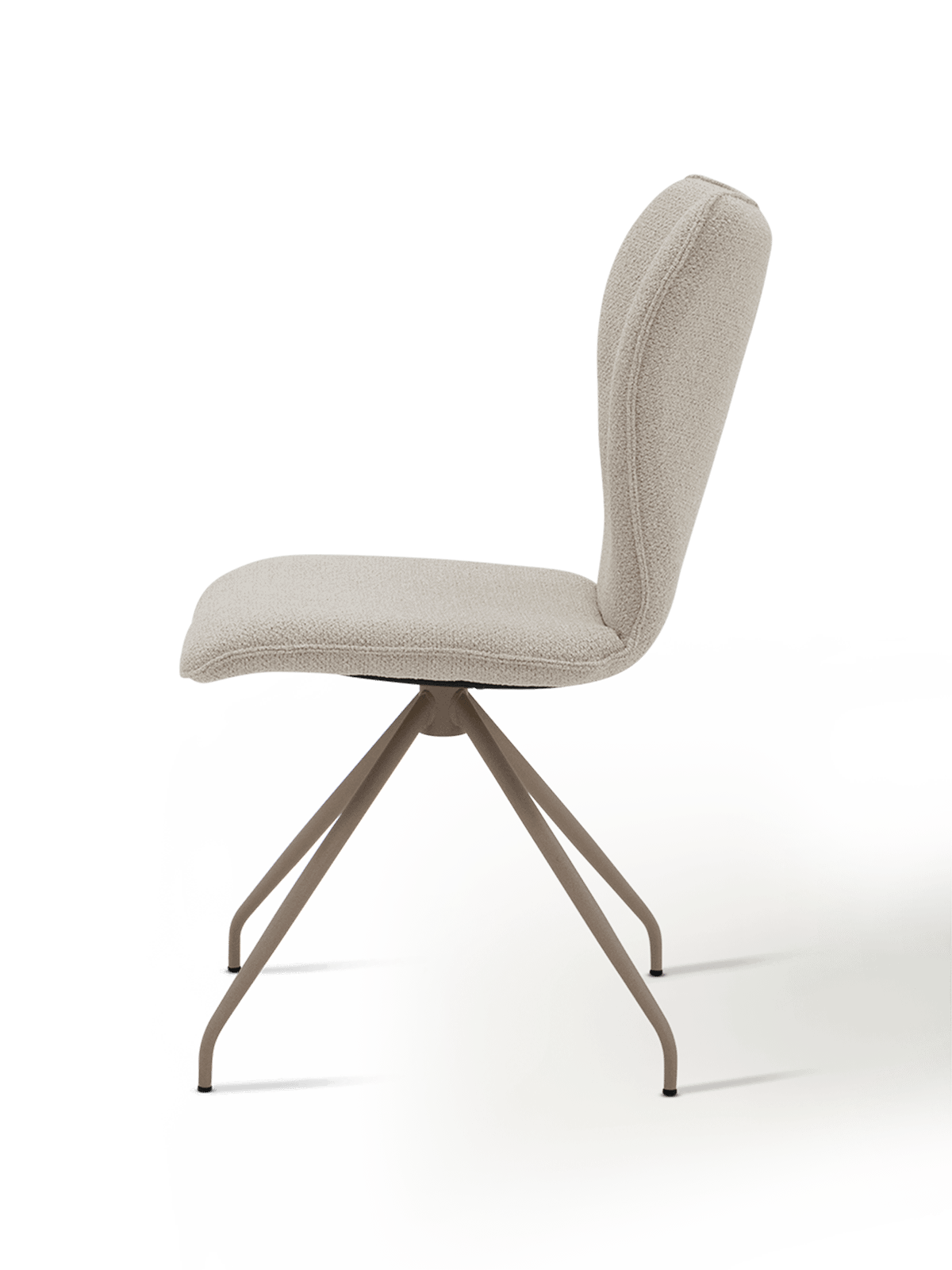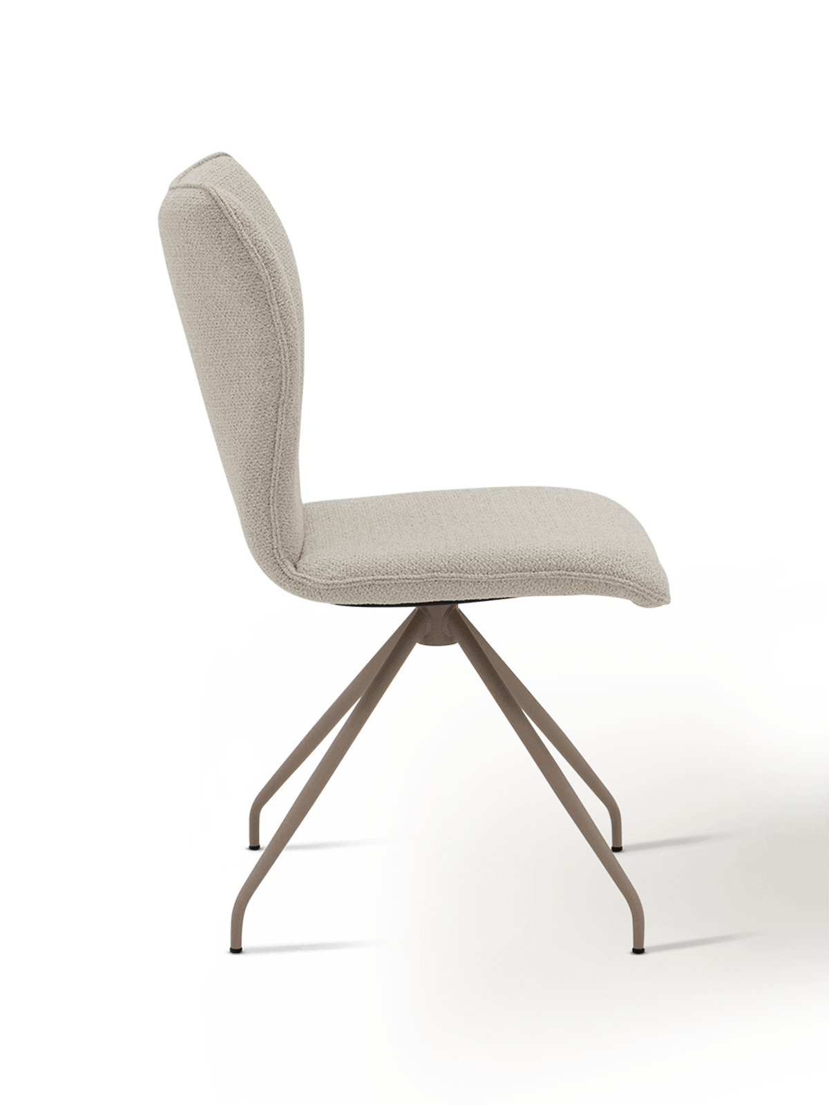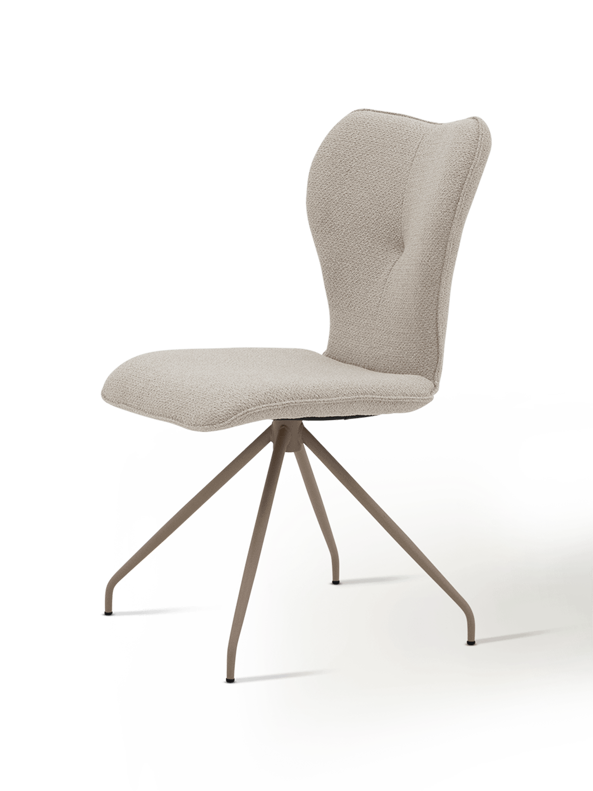 Naast deze versie met beige stof en draaivoet is de Tuka verkrijgbaar in een ruime keuze aan stoffen, kleuren en onderstellen. Ook armleuningen behoren tot de opties, waardoor je de stoel volledig kunt afstemmen op jouw interieurstijl – van modern minimalistisch tot sfeervol klassiek.