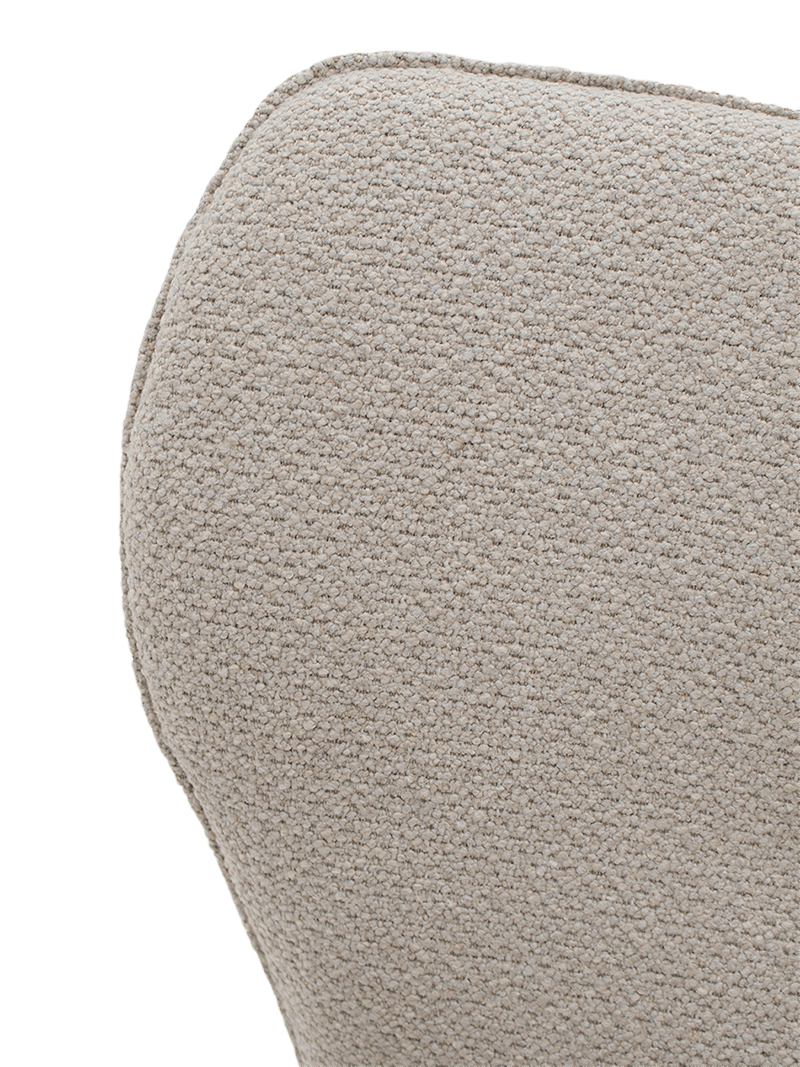 Met zijn afmetingen van B56 × D64 × H90 cm is Tuka compact, maar visueel elegant. De fijne poten in beige metaal zorgen voor een luchtige uitstraling, terwijl de bekleding in zachte stof textuur en warmte toevoegt. Perfect te combineren met lichte houtsoorten, keramiek of marmer voor een luxueuze maar toegankelijke look.