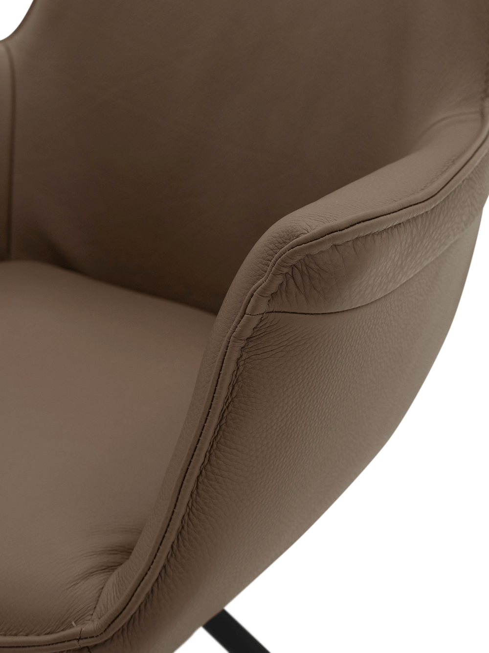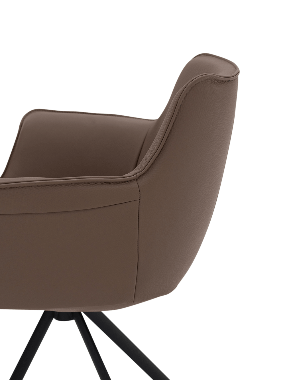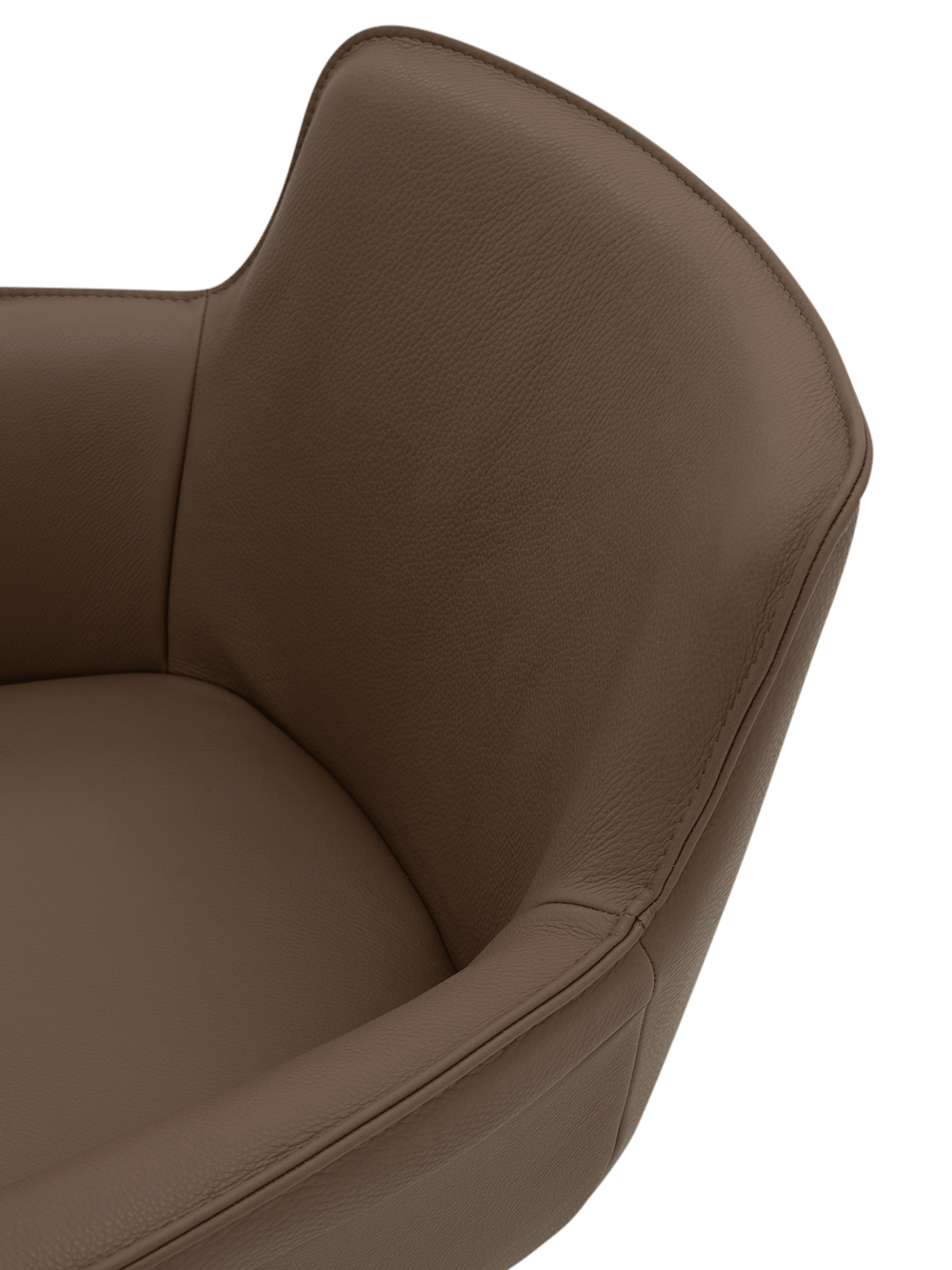 De kuip is afgewerkt in hoogwaardig leder in een diepe chocoladekleur, wat de stoel een luxueuze en tijdloze uitstraling geeft. De elegante ellipsvormige draaivoet in metaal voegt niet alleen een subtiel designaccent toe, maar verhoogt ook het gebruiksgemak rond de eettafel.