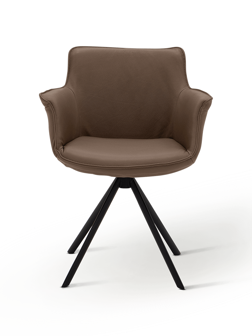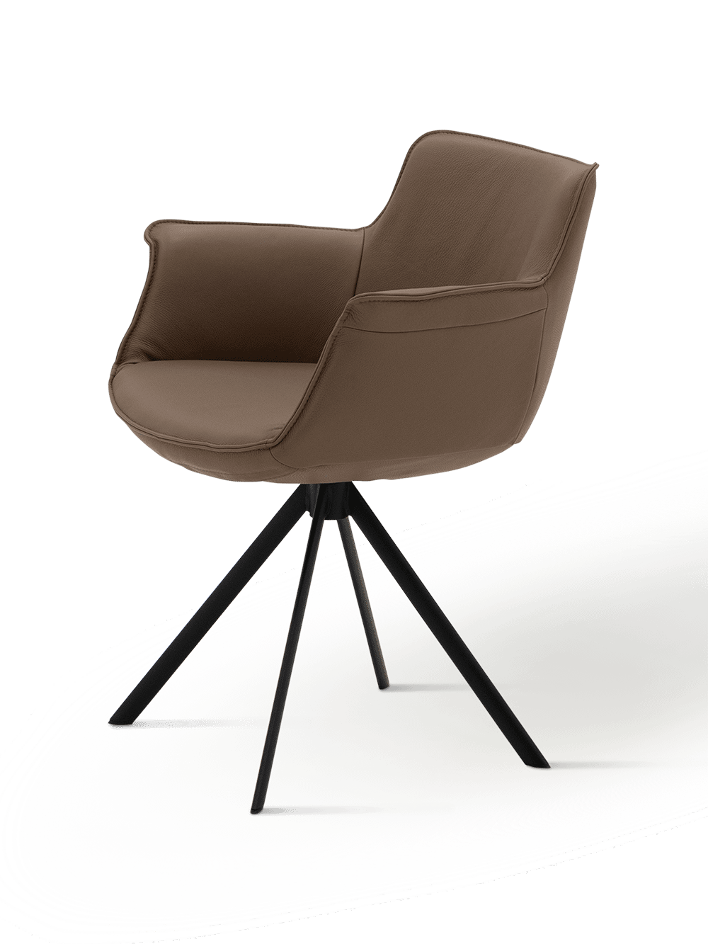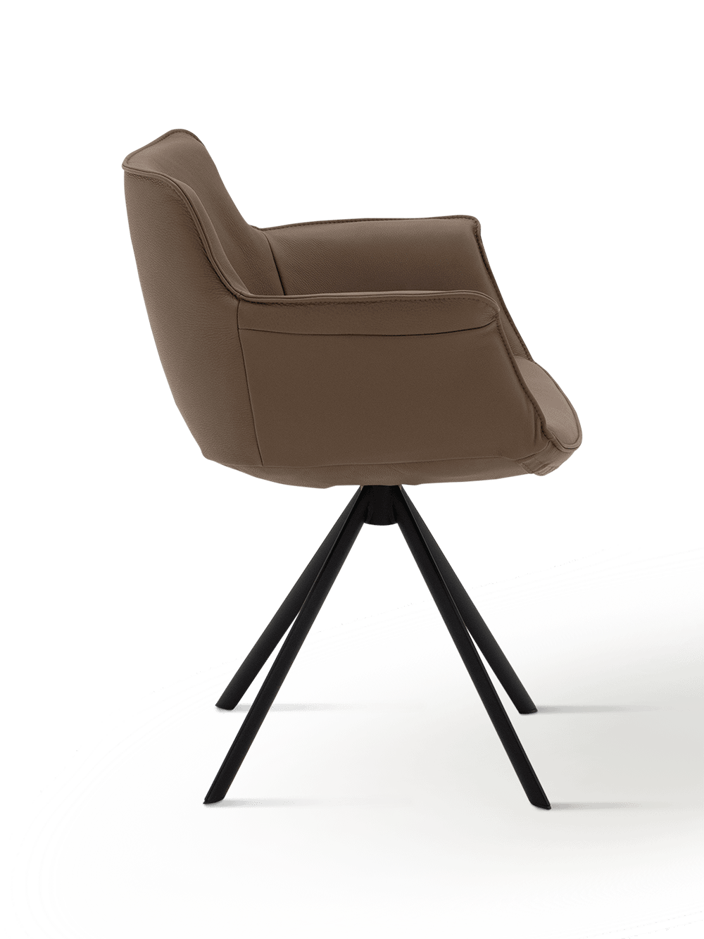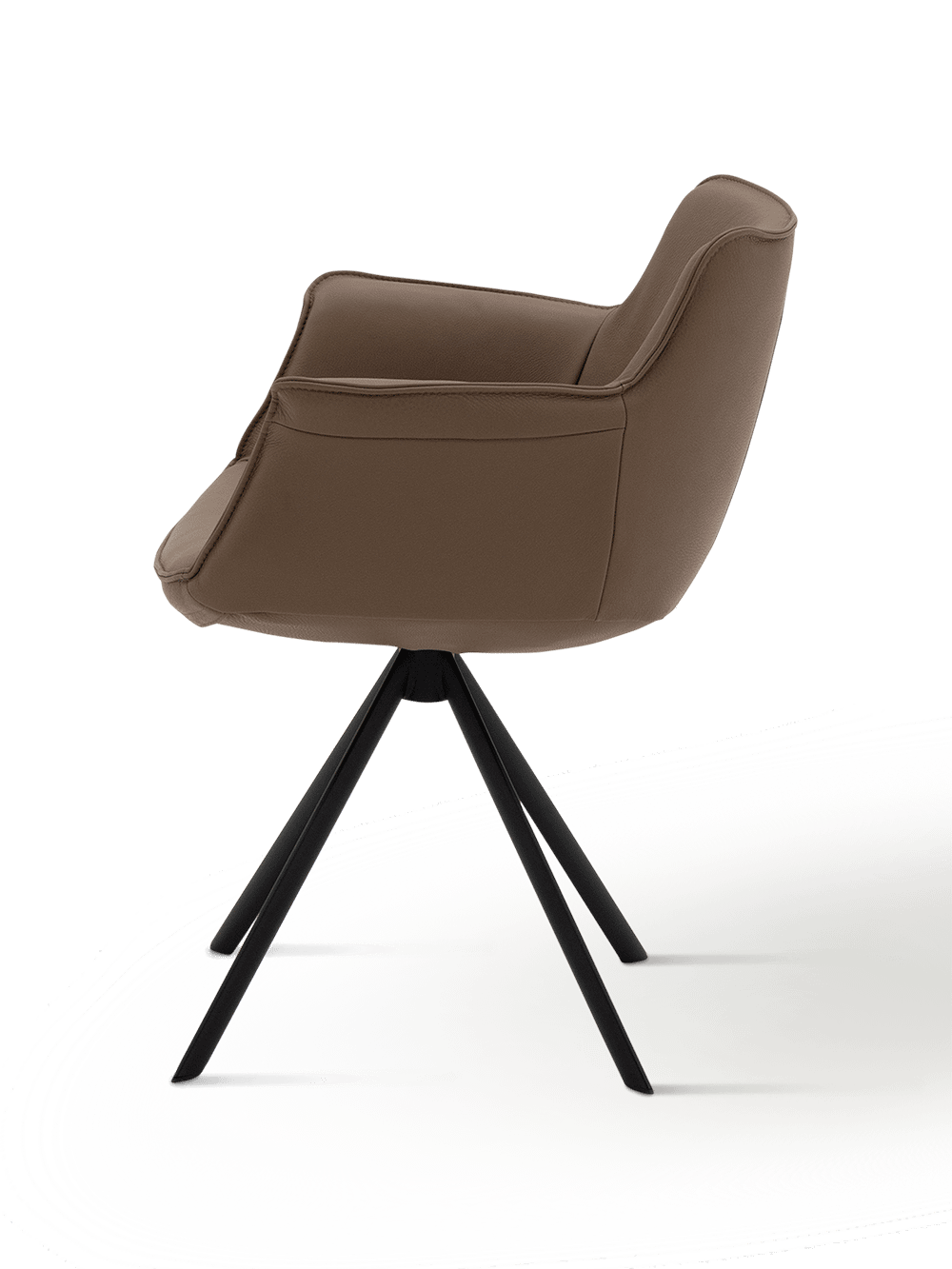 De kuip is afgewerkt in hoogwaardig leder in een diepe chocoladekleur, wat de stoel een luxueuze en tijdloze uitstraling geeft. De elegante ellipsvormige draaivoet in metaal voegt niet alleen een subtiel designaccent toe, maar verhoogt ook het gebruiksgemak rond de eettafel.