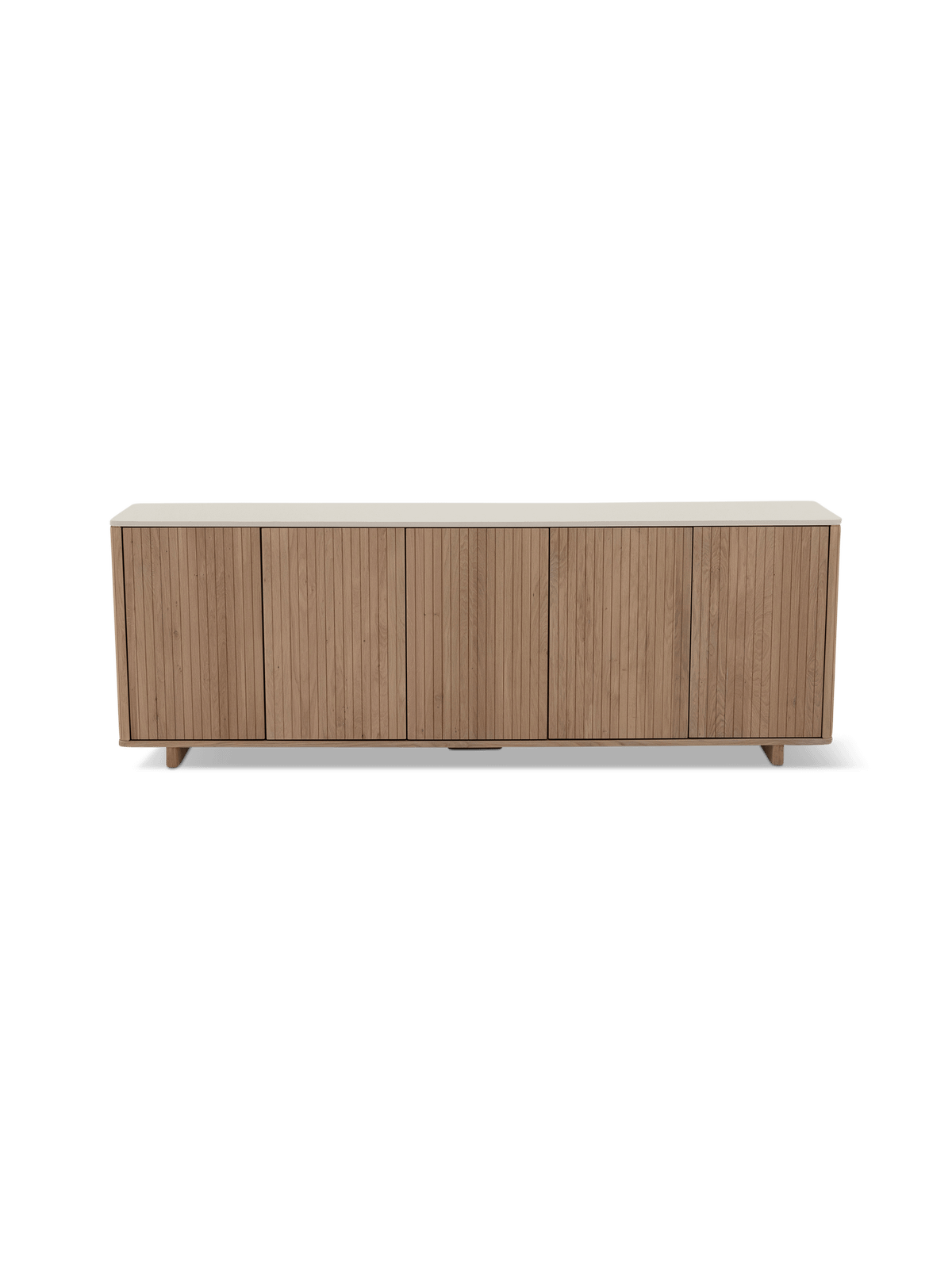 De fijne groefstructuur in de deuren geeft het dressoir extra diepte en karakter. Deze subtiele detaillering zorgt voor een speelse toets zonder afbreuk te doen aan de strakke uitstraling van het meubel. In combinatie met het mineraal topblad in champagnekleur ontstaat een harmonieus geheel dat perfect past in een modern interieur.