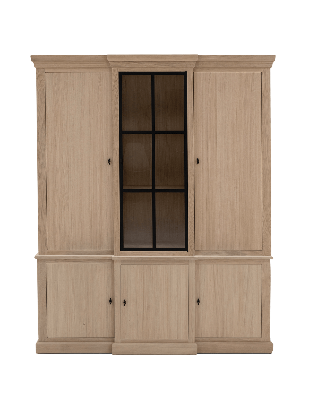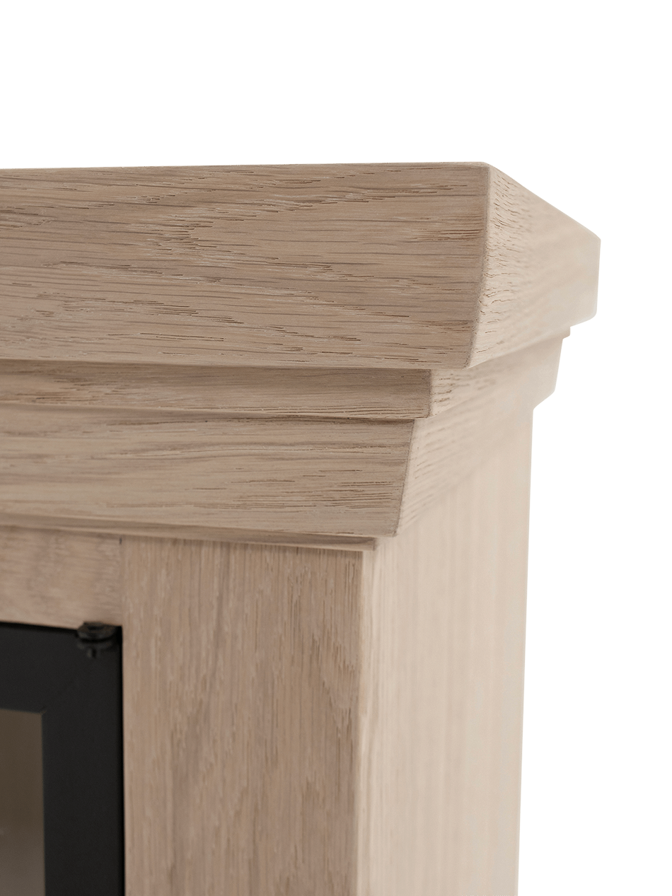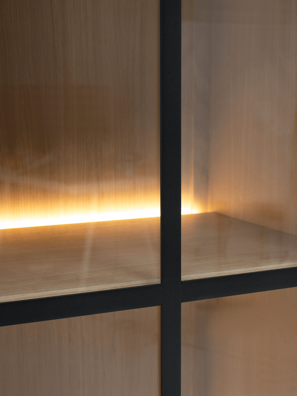 De klassieke sierlijst aan de bovenkant, het massieve onderstel en de sierlijke zwarte grepen zorgen samen voor een tijdloze charme. De kast wordt geleverd exclusief LED-verlichting, zodat je zelf kan kiezen hoe je het interieur wil belichten.
