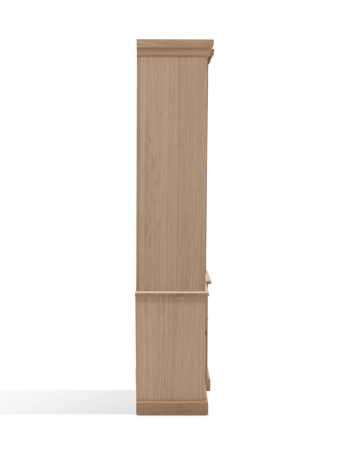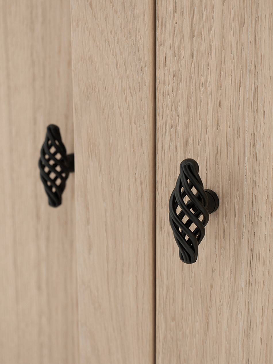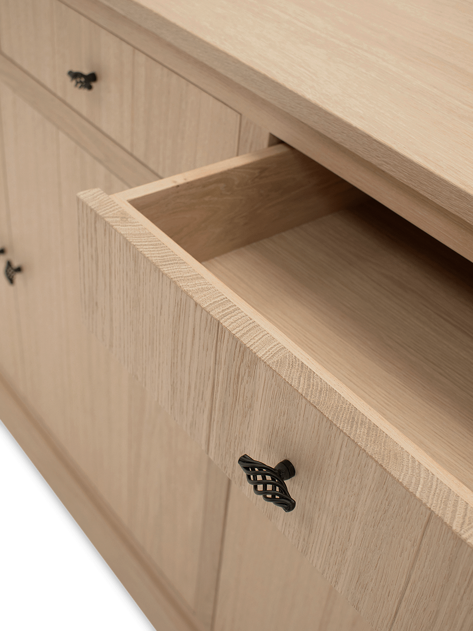 De klassieke sierlijst aan de bovenkant, het massieve onderstel en de sierlijke zwarte grepen zorgen samen voor een tijdloze charme. De kast wordt geleverd exclusief LED-verlichting, zodat je zelf kan kiezen hoe je het interieur wil belichten.