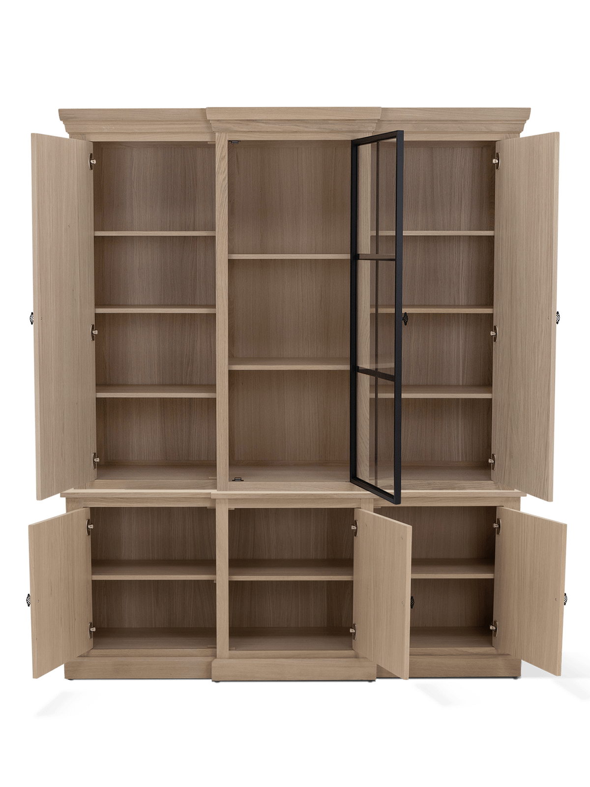 Met een breedte van 194 cm, een hoogte van 235 cm en een diepte van 47,5 cm biedt deze vitrinekast indrukwekkend veel opbergruimte. Achter de zes deuren, waarvan één met glas, vind je ruime compartimenten met verstelbare legplanken — ideaal voor een ordelijk en stijlvol interieur.