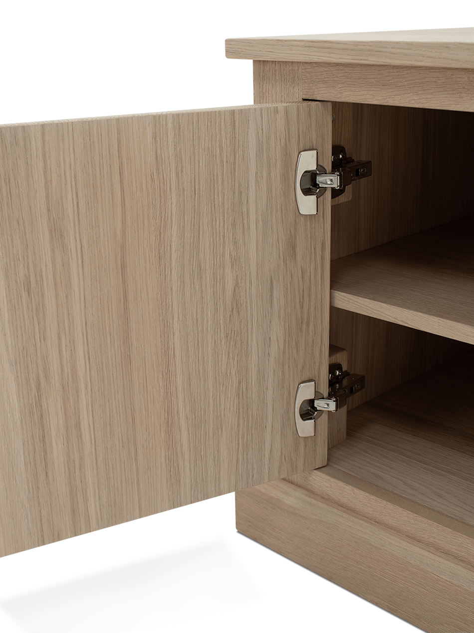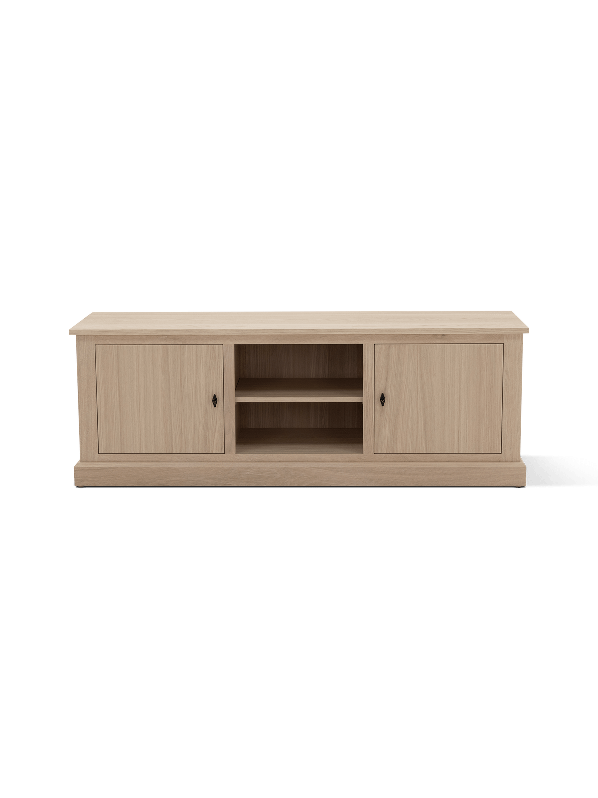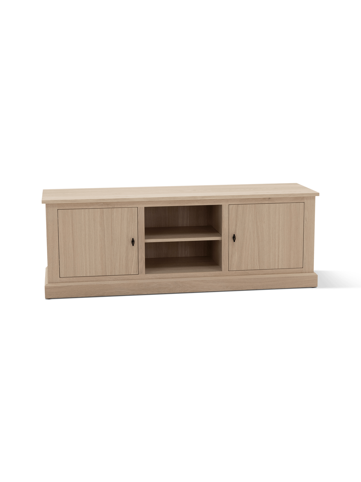 Met een breedte van 170 cm, hoogte van 60 cm en diepte van 50 cm, biedt dit meubel zowel ruimte als verfijning. De twee deuren verbergen handige opbergvakken voor kabels of accessoires, terwijl de twee open nissen perfect zijn voor mediatoestellen of decoratieve objecten. Alles wat je nodig hebt, netjes georganiseerd binnen handbereik.