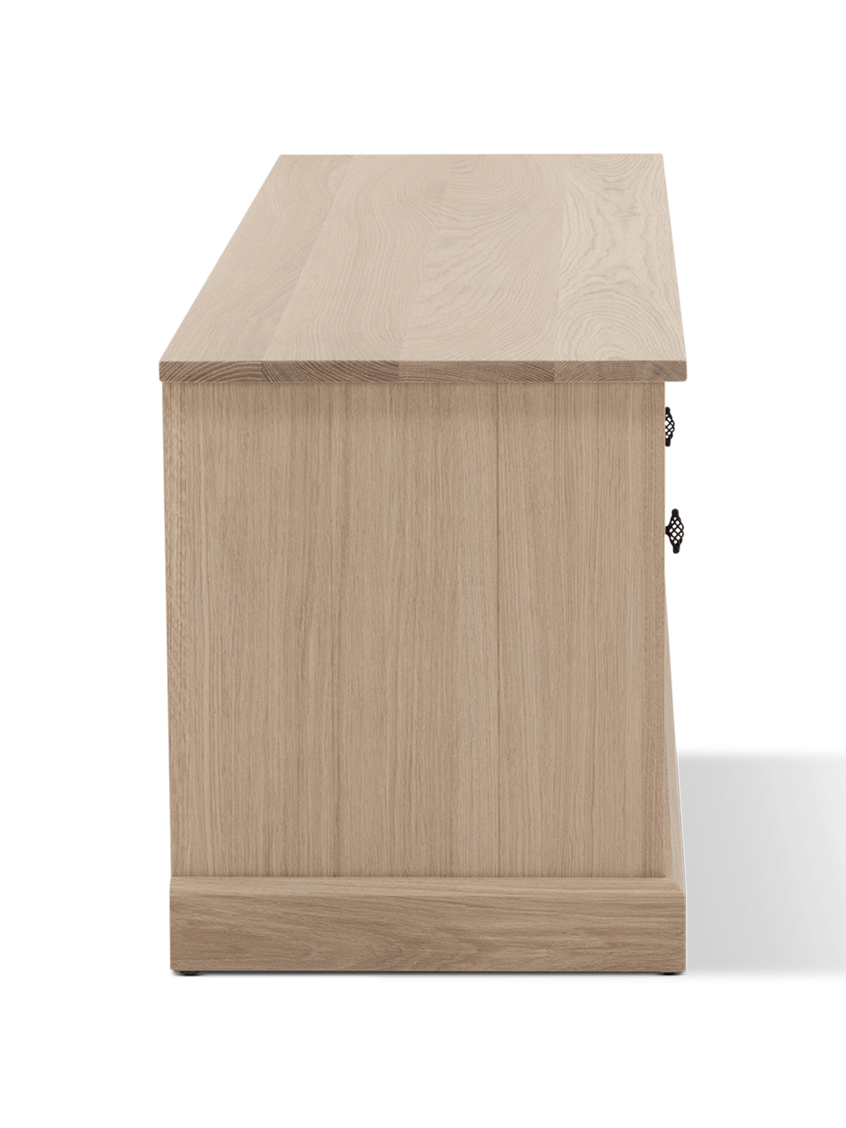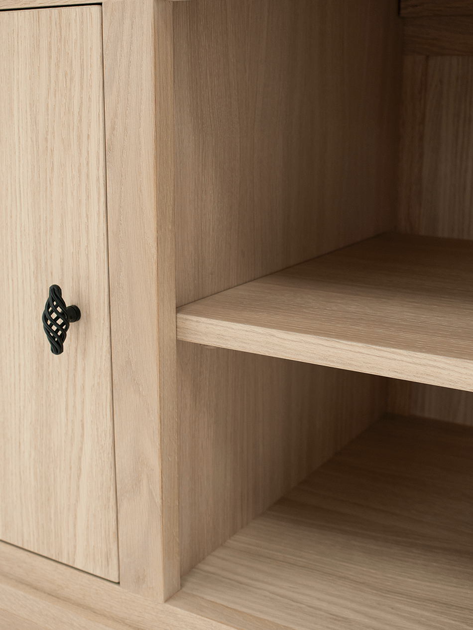 Het TV-meubel Amadora brengt rust en elegantie in je woonkamer. Uitgevoerd in geborsteld hout, straalt het meubel een natuurlijke charme uit die perfect past binnen een landelijk-modern interieur. De zwarte metalen grepen zorgen voor een eigentijds contrast en versterken het stijlvolle karakter van de collectie.