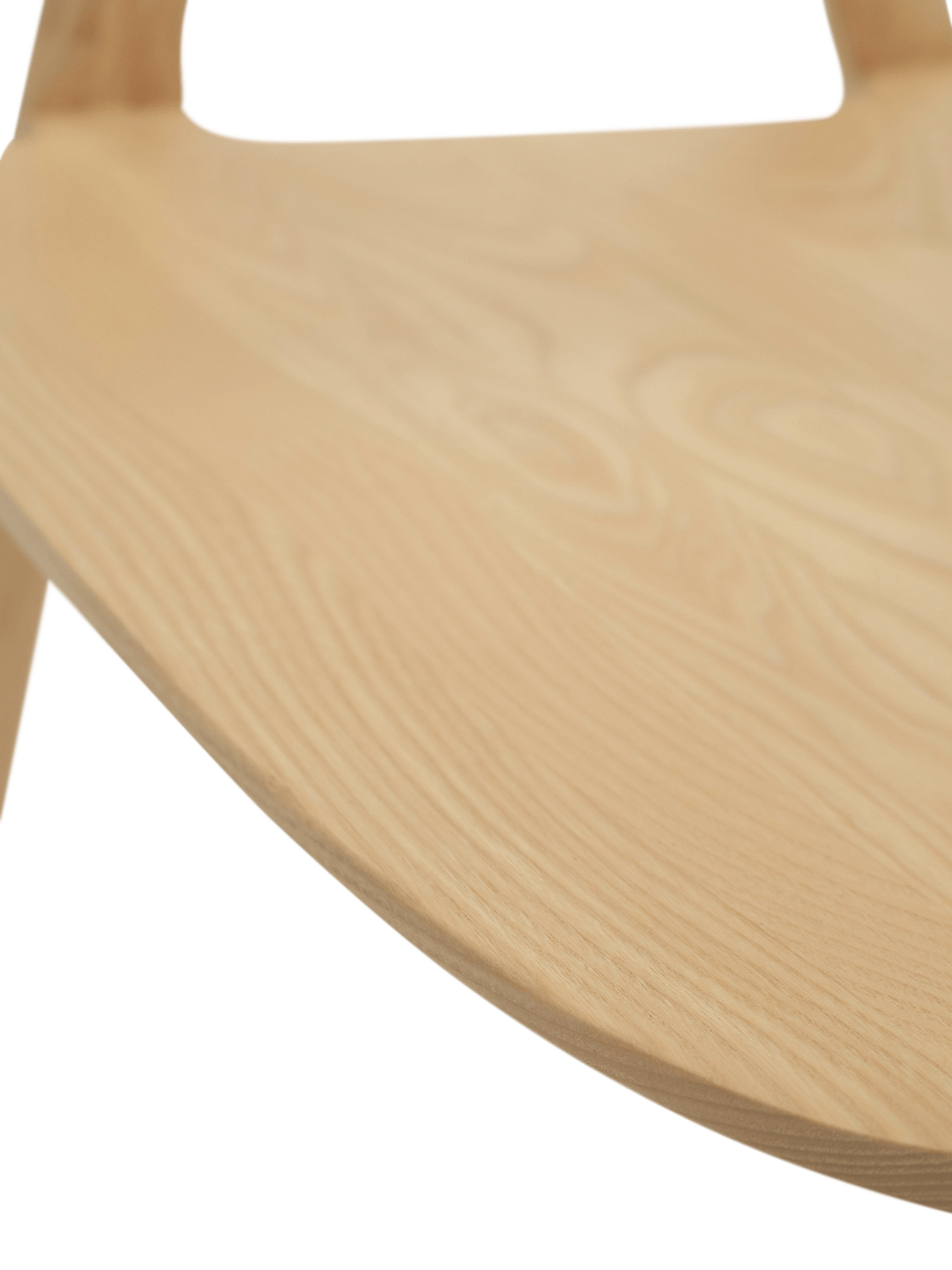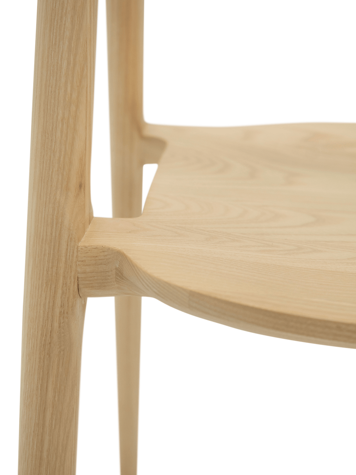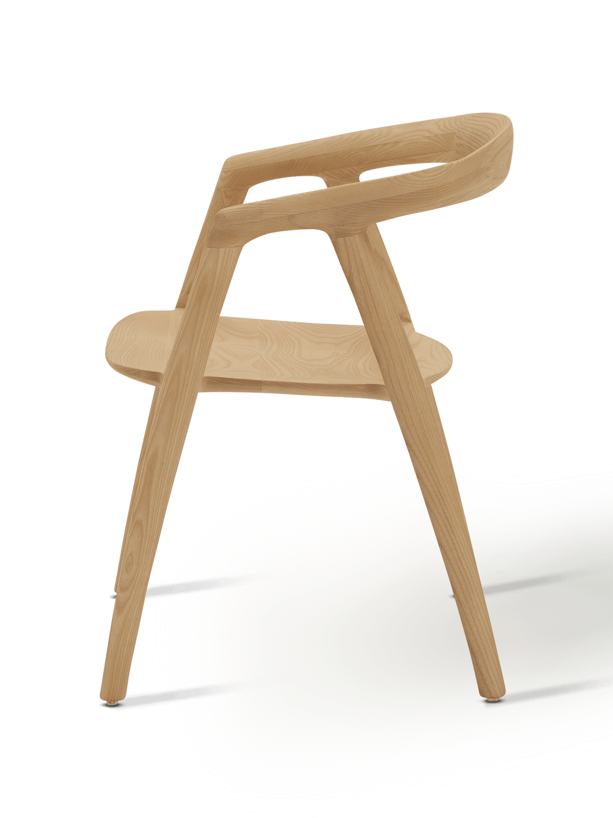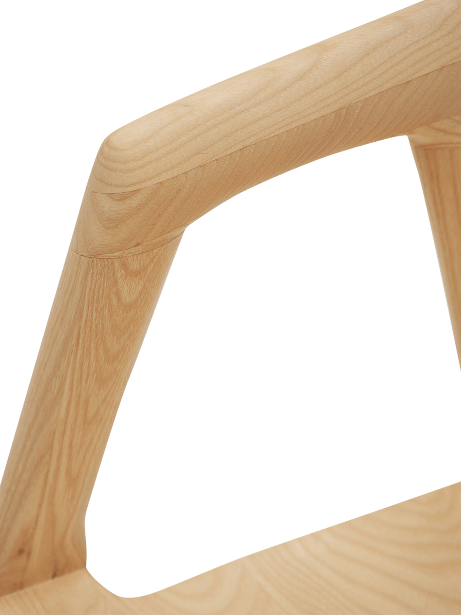 De YUKO is volledig uit hout vervaardigd, waarbij de verbindingen bijna onzichtbaar in elkaar overvloeien. De zitting is ergonomisch voorgevormd en biedt verrassend comfort, terwijl de afgeronde rugleuning en armsteunen één vloeiende beweging vormen. De lichte houtkleur accentueert de natuurlijke nerf en geeft het meubelstuk een verfijnde, moderne uitstraling.