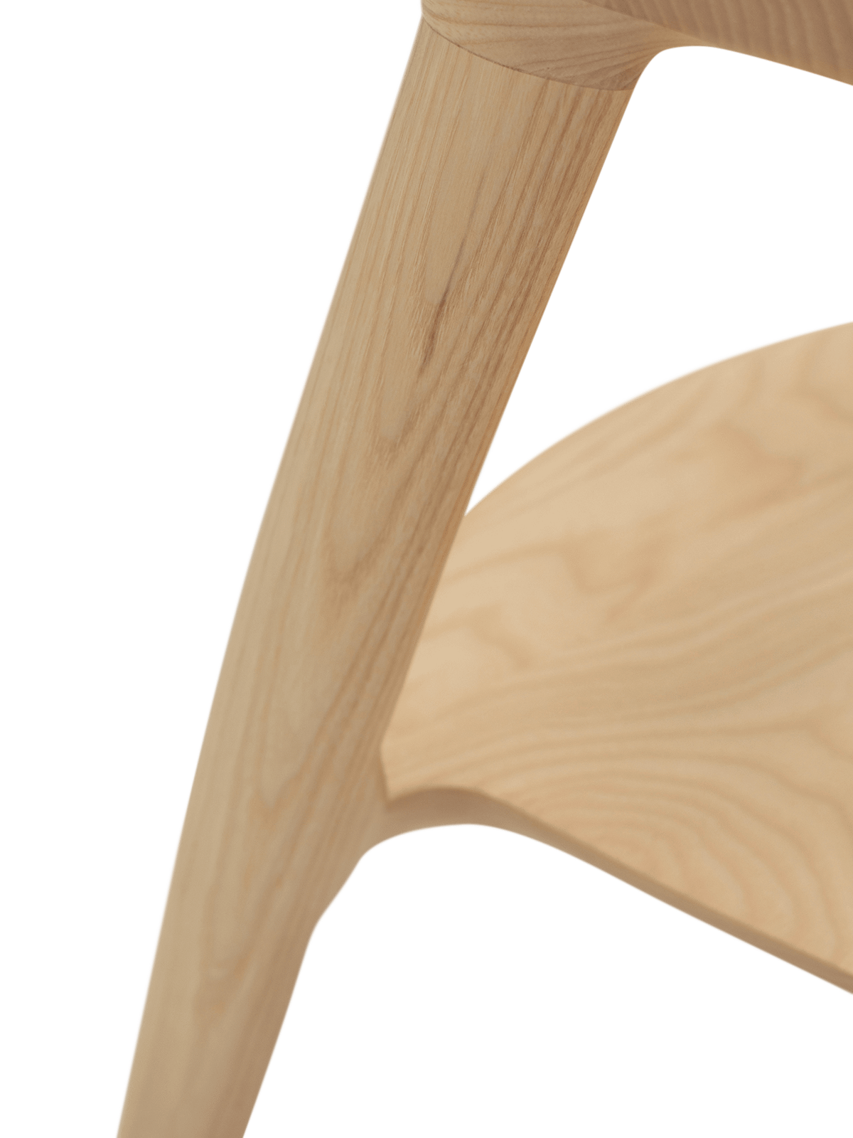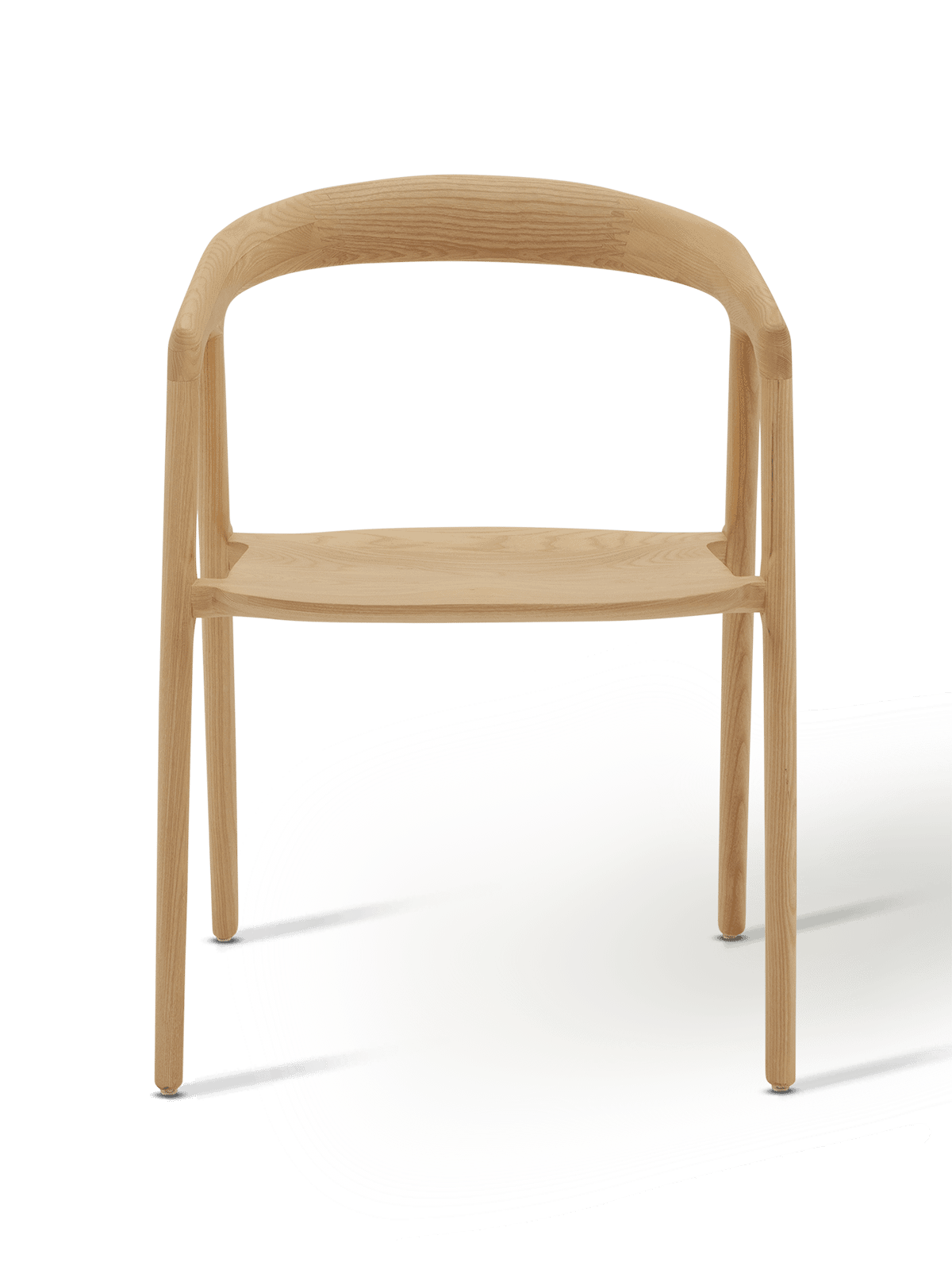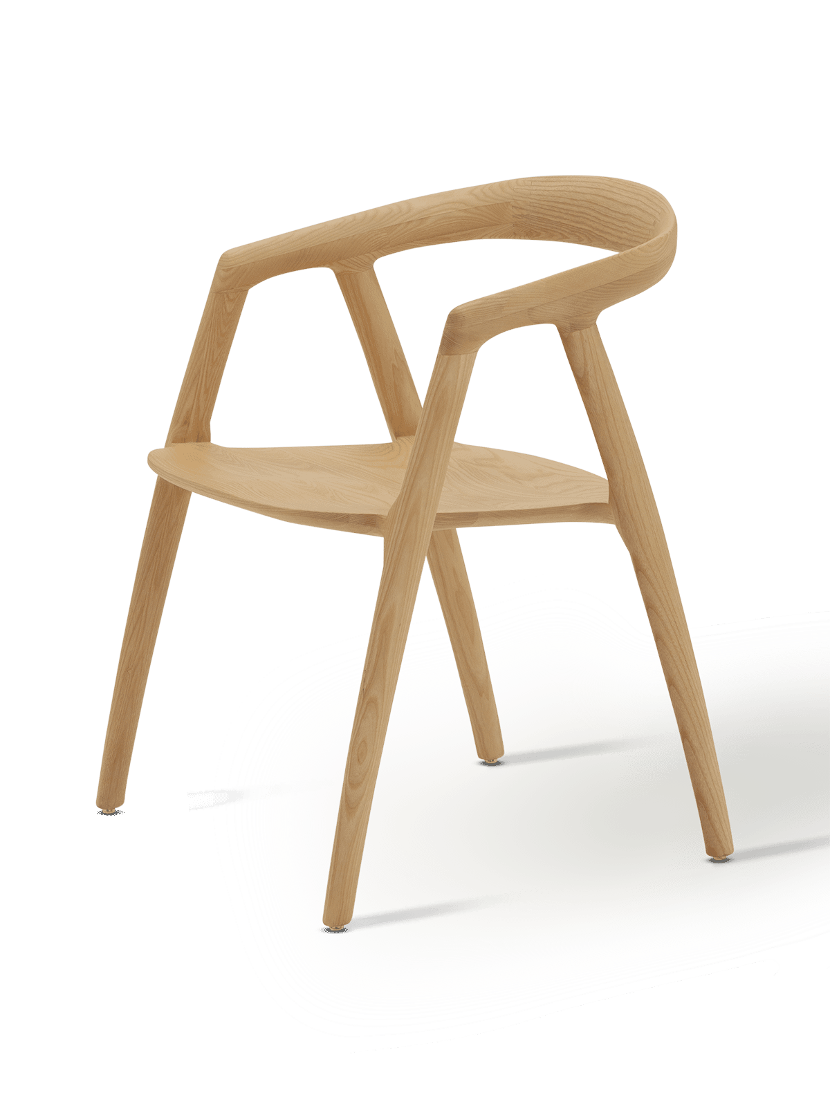 De YUKO is volledig uit hout vervaardigd, waarbij de verbindingen bijna onzichtbaar in elkaar overvloeien. De zitting is ergonomisch voorgevormd en biedt verrassend comfort, terwijl de afgeronde rugleuning en armsteunen één vloeiende beweging vormen. De lichte houtkleur accentueert de natuurlijke nerf en geeft het meubelstuk een verfijnde, moderne uitstraling.