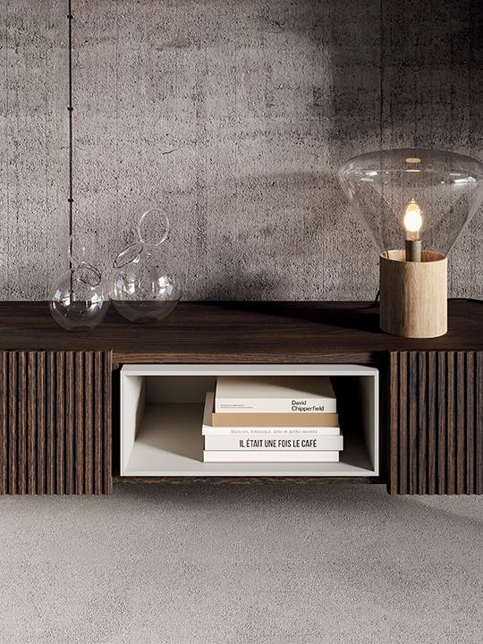 De kenmerkende geribbelde fronten van de Zero.22-collectie creëren een speels ritme van licht en schaduw. Deze verticale belijning geeft de kast een architecturale uitstraling, alsof hij opgaat in het lijnenspel van de ruimte zelf. De slanke metalen poten – in dezelfde champagnekleur als de nis – tillen het meubel visueel op en zorgen voor een gevoel van lichtheid en precisie.