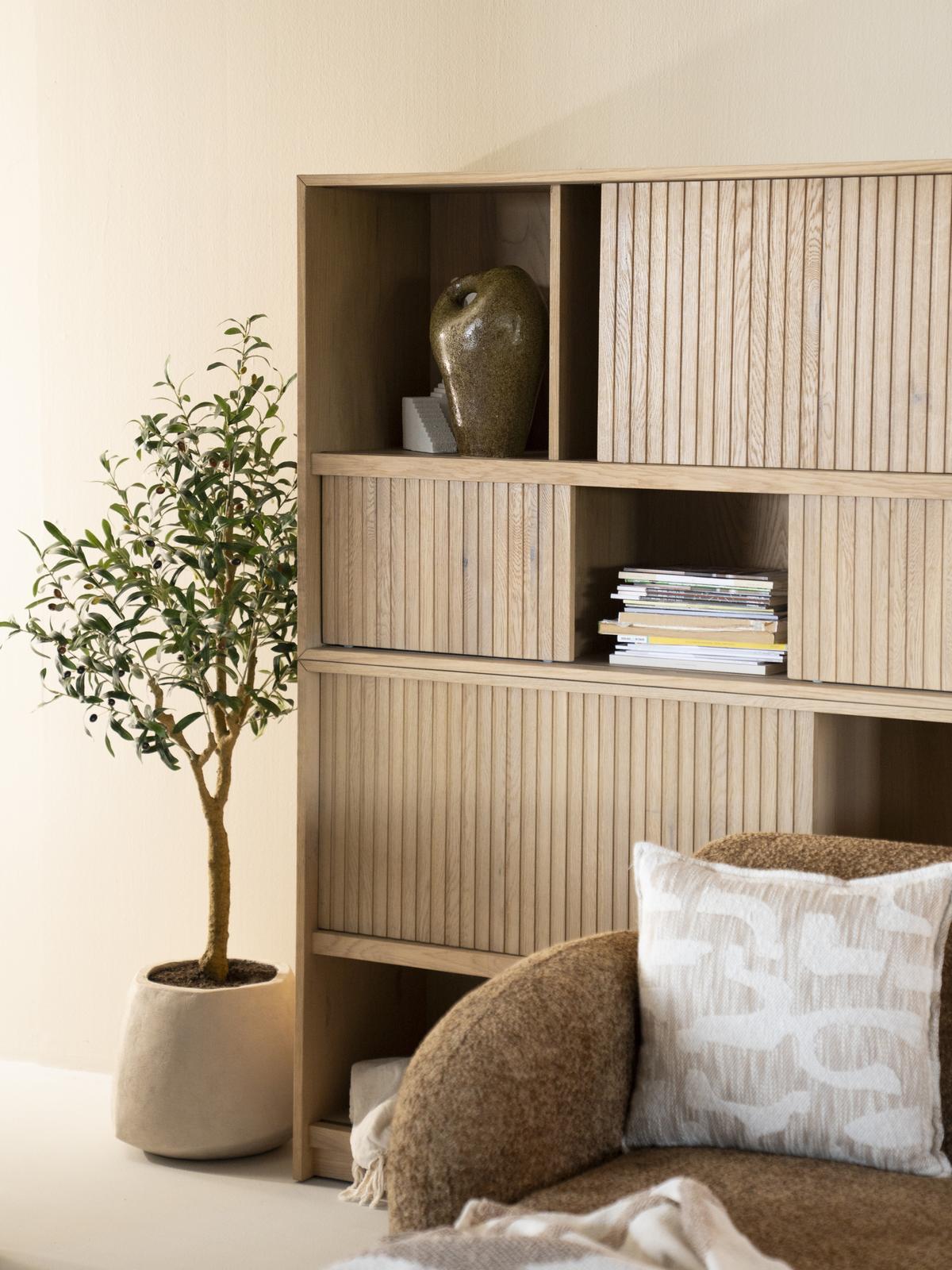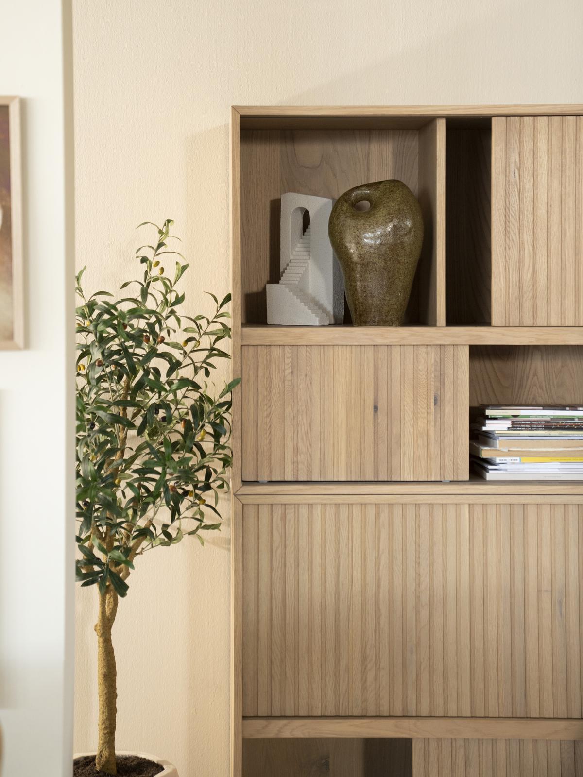 Het asymmetrische lijnenspel geeft Milo een eigen identiteit. Open compartimenten bieden ruimte voor boeken, objecten of kunst, terwijl de schuivende panelen zorgen voor een rustige, opgeruimde look.