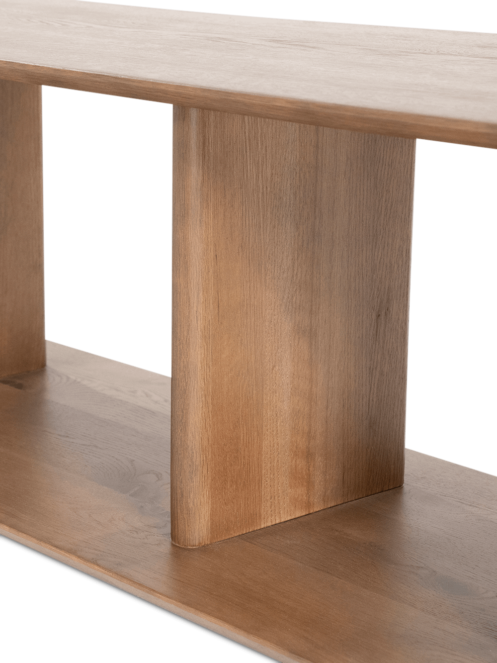 Dankzij de open vakverdeling krijgt dit tv-meubel een luchtige uitstraling en voldoende ruimte voor je media-apparatuur, boeken of decoratie. De stevige staanders zorgen voor stabiliteit, terwijl het gelakte eikenhout extra bescherming biedt tegen dagelijks gebruik.