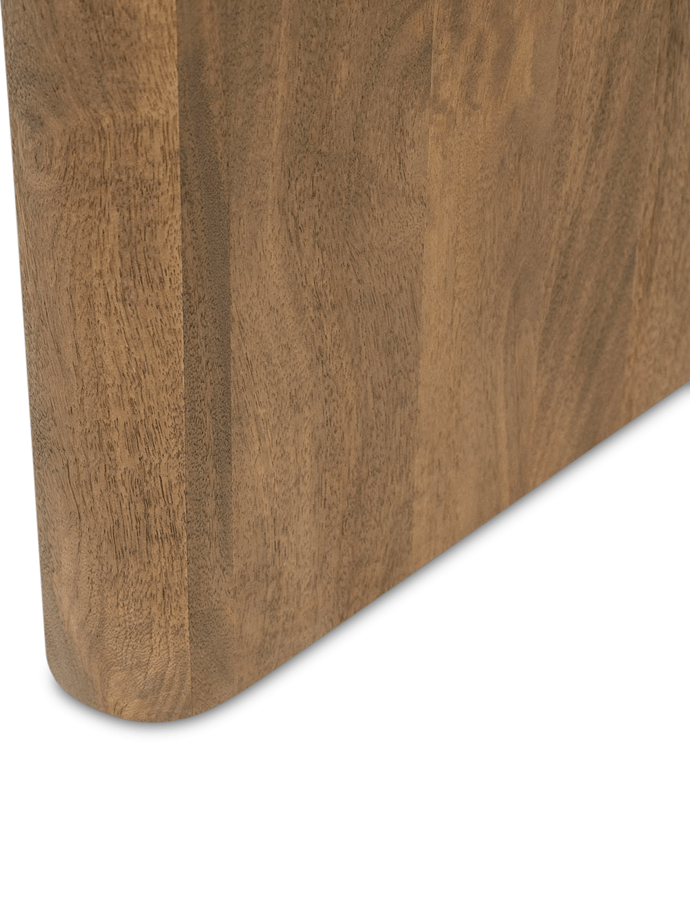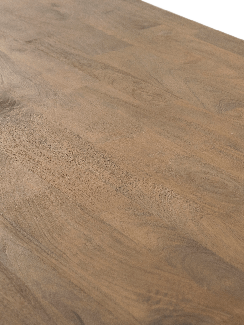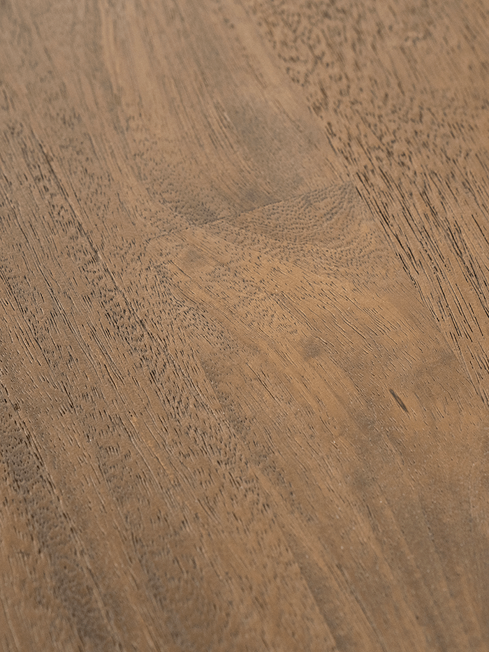 Het warme mangohout toont een tekening met subtiele kleurnuances, waardoor elke tafel een uniek karakter krijgt. De brede poten en het solide blad zorgen voor een evenwichtige, sculpturale uitstraling die zowel modern als tijdloos aanvoelt.