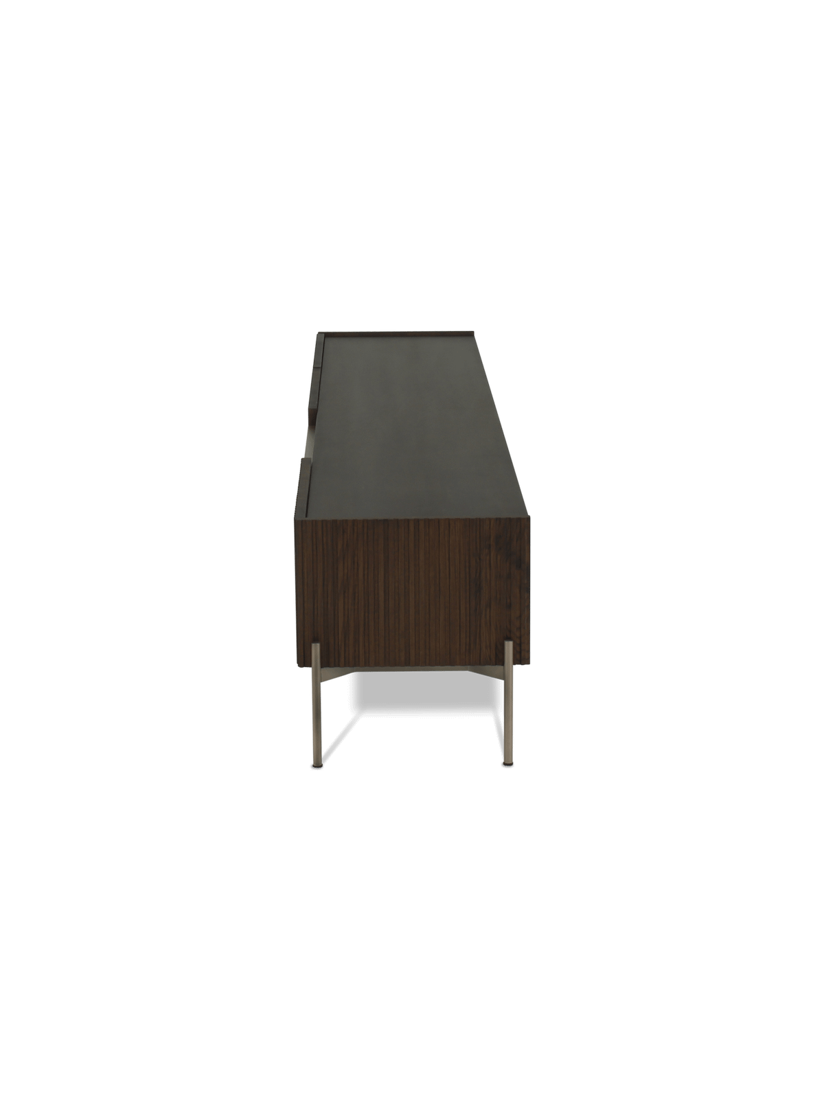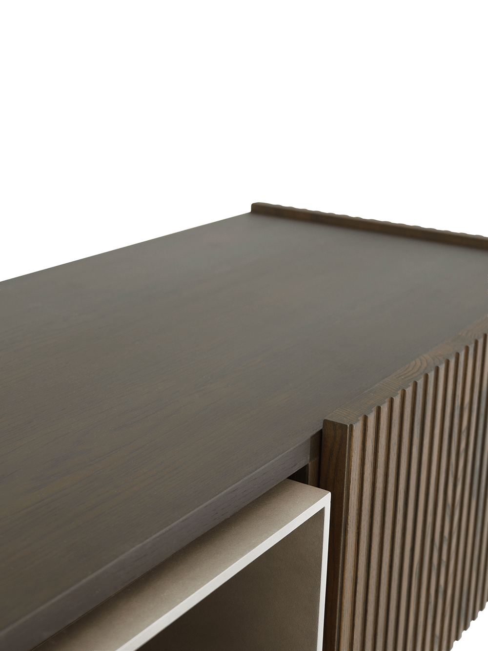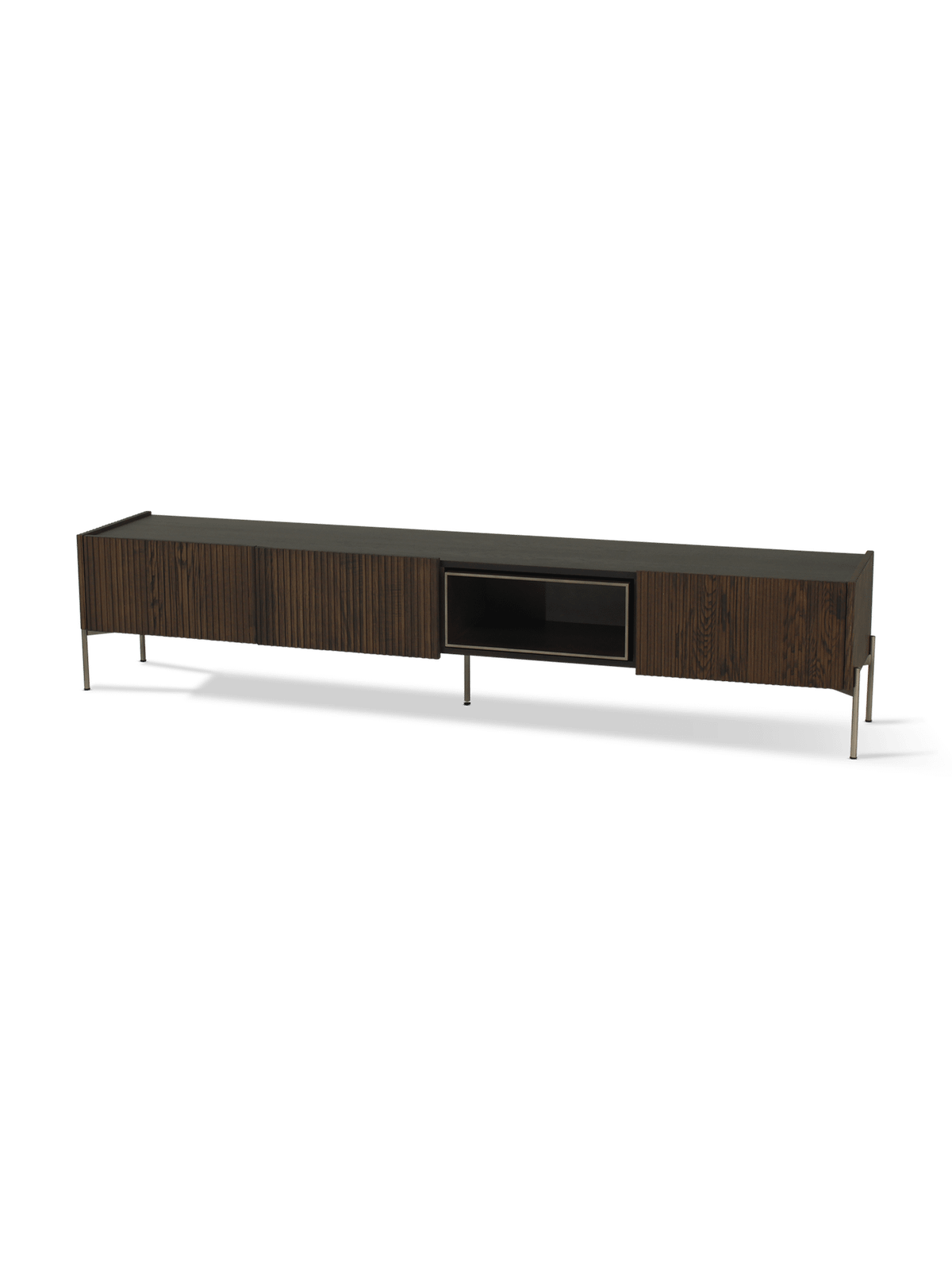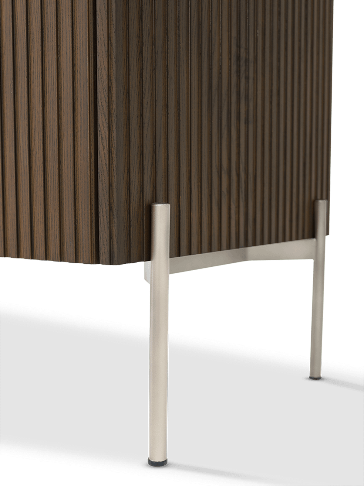 De kenmerkende geribbelde fronten van de Zero.22-collectie creëren een speels ritme van licht en schaduw. Deze verticale belijning geeft de kast een architecturale uitstraling, alsof hij opgaat in het lijnenspel van de ruimte zelf. De slanke metalen poten – in dezelfde champagnekleur als de nis – tillen het meubel visueel op en zorgen voor een gevoel van lichtheid en precisie.