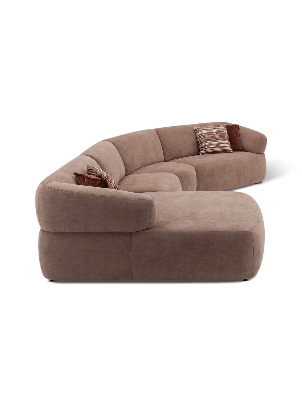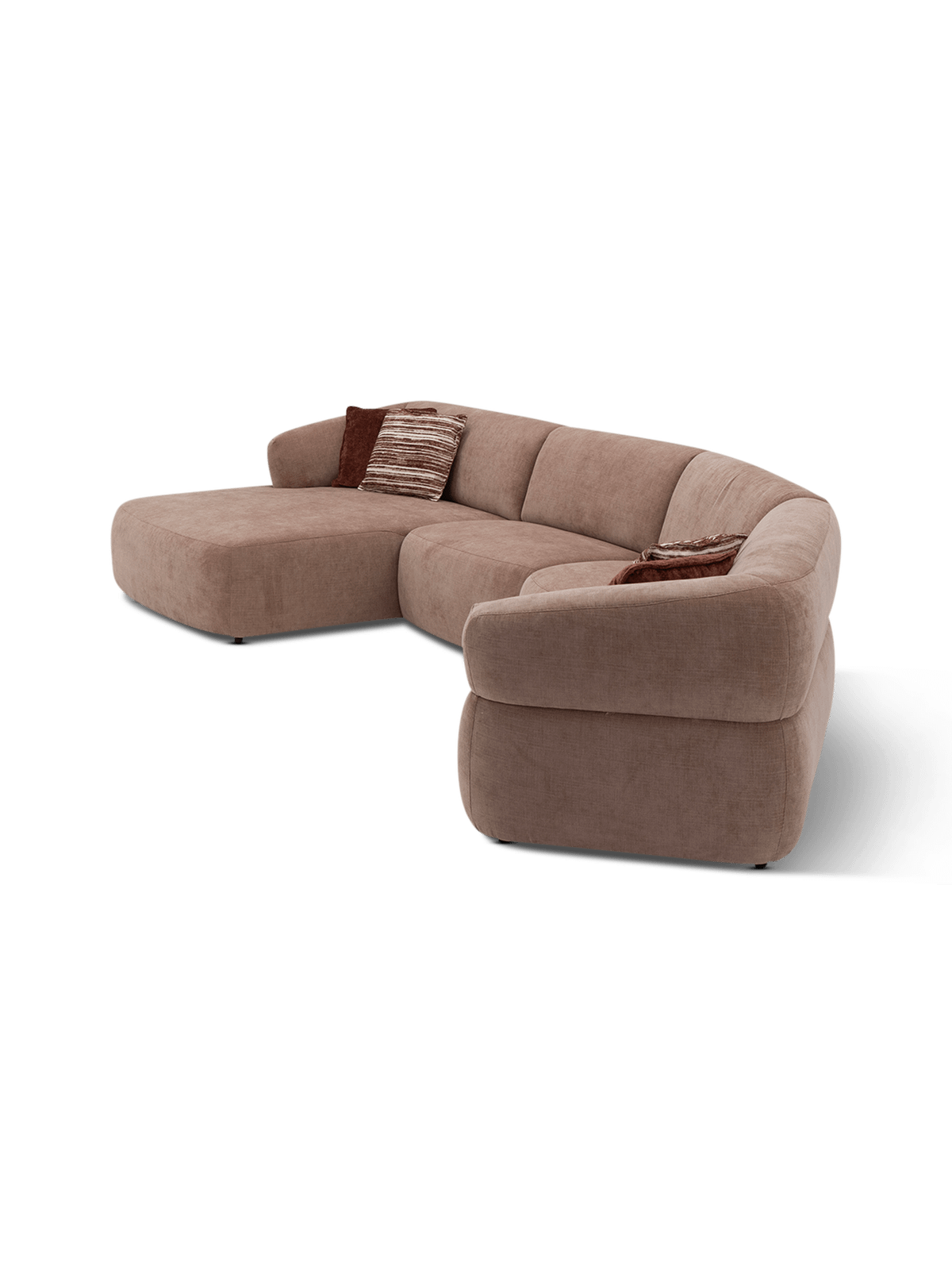 Hoeksalon Bodago is een opvallend stijlvolle sofa die verfijning en comfort moeiteloos combineert. De luxueuze bekleding in een warme Old Pink tint geeft het geheel een zachte, elegante uitstraling met een moderne toets. De afgeronde vormen zorgen voor een vloeiend lijnenspel dat zich perfect integreert in zowel hedendaagse als warme interieurs. De subtiel contrasterende sierkussens voegen een speels accent toe en versterken de cosy uitstraling van deze prachtige sofa.