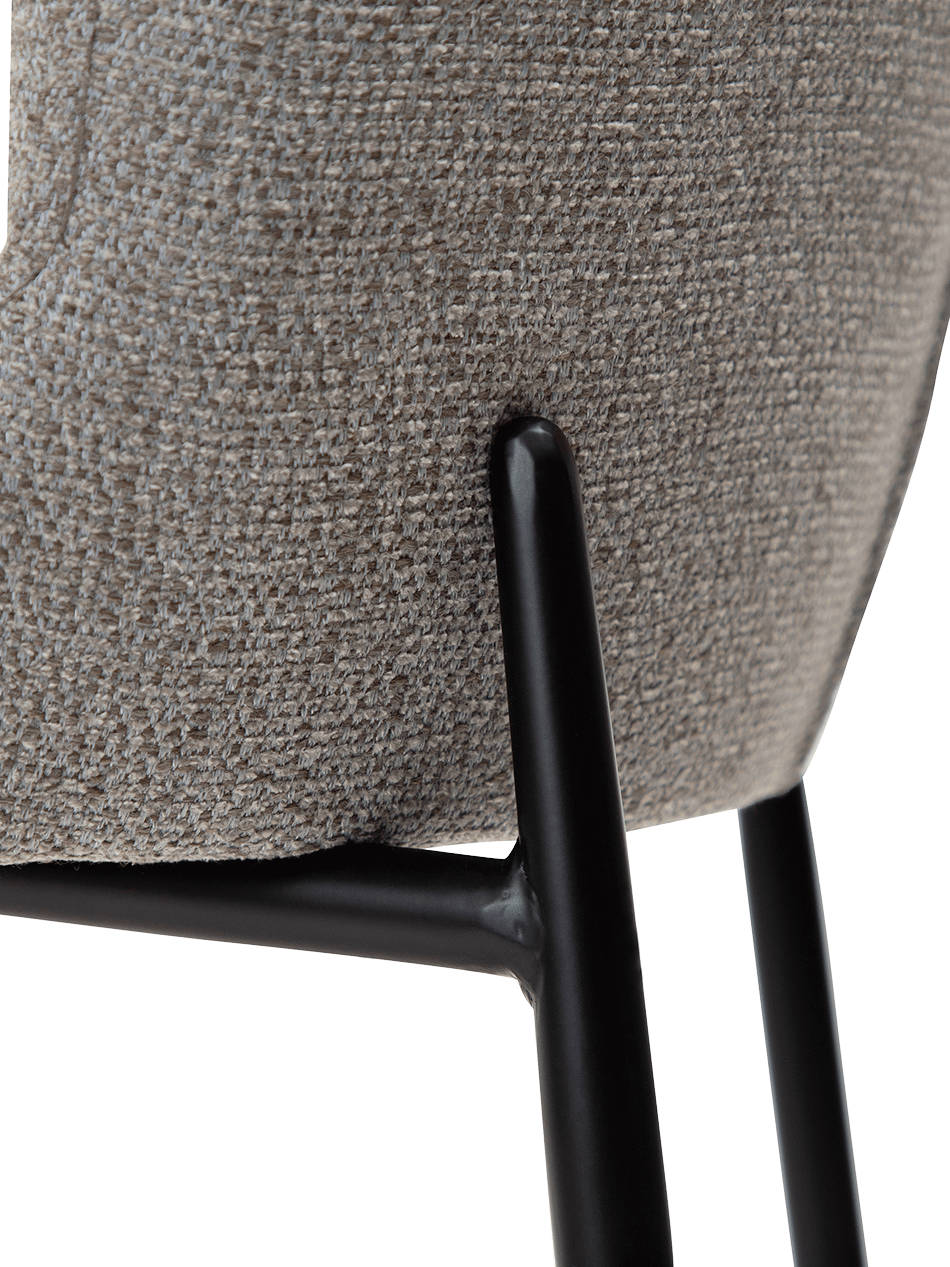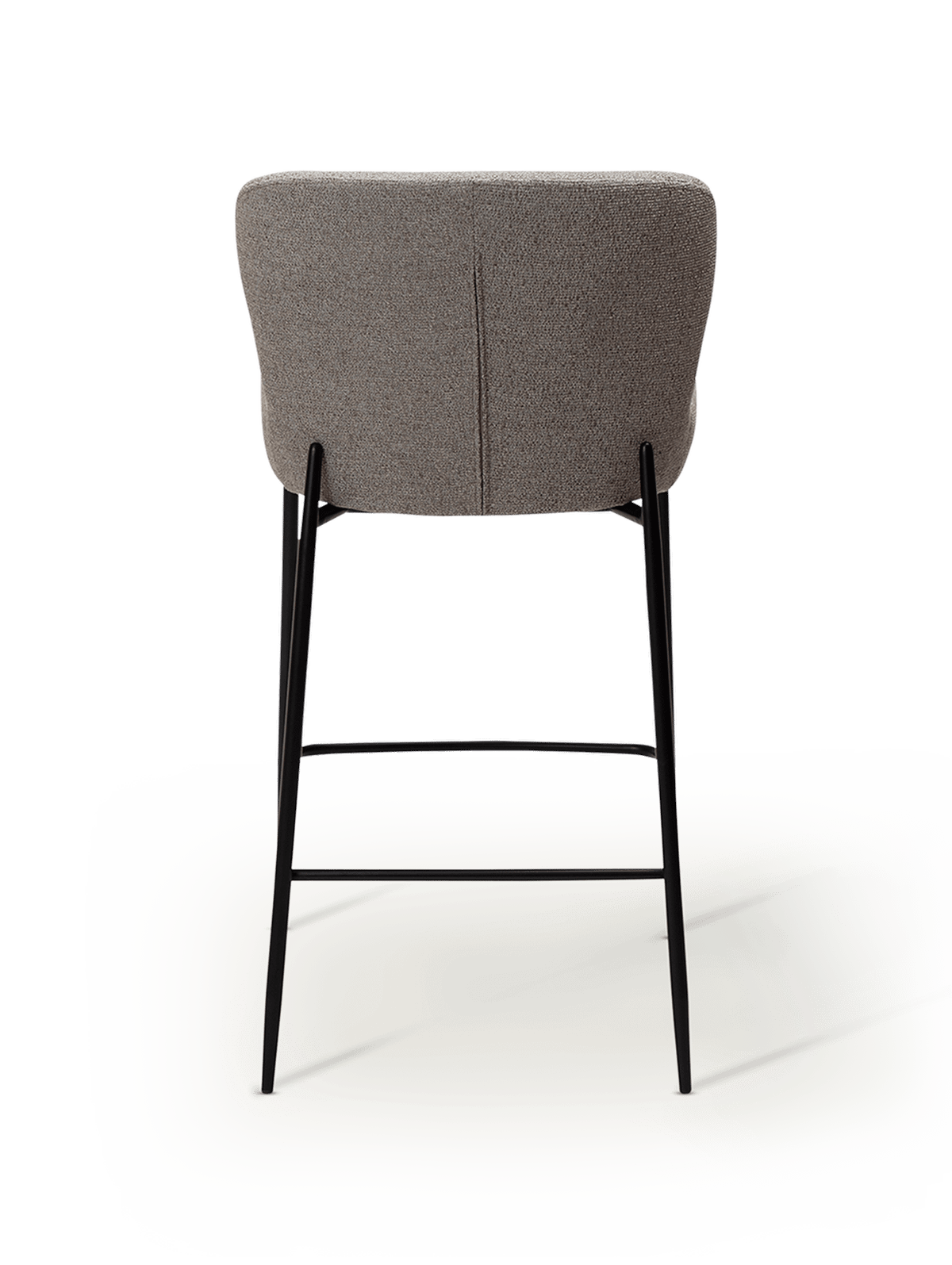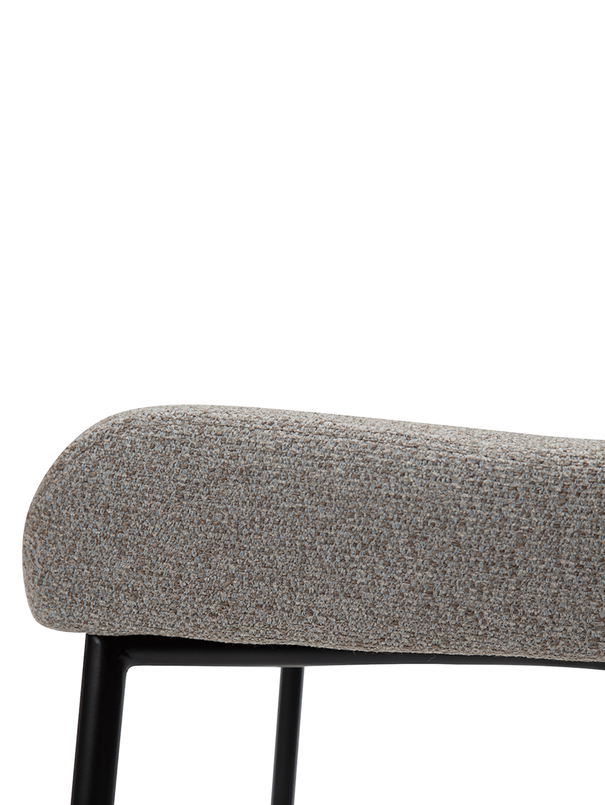 Met een zithoogte van 67 cm is deze stoel geschikt voor gebruik aan een keukeneiland of lagere bartafels. De zitting is bekleed met een bouclé stof in de kleur pebble earth en wordt gecombineerd met zwarte poten, waardoor de stoel veelzijdig inzetbaar is in diverse interieurs.