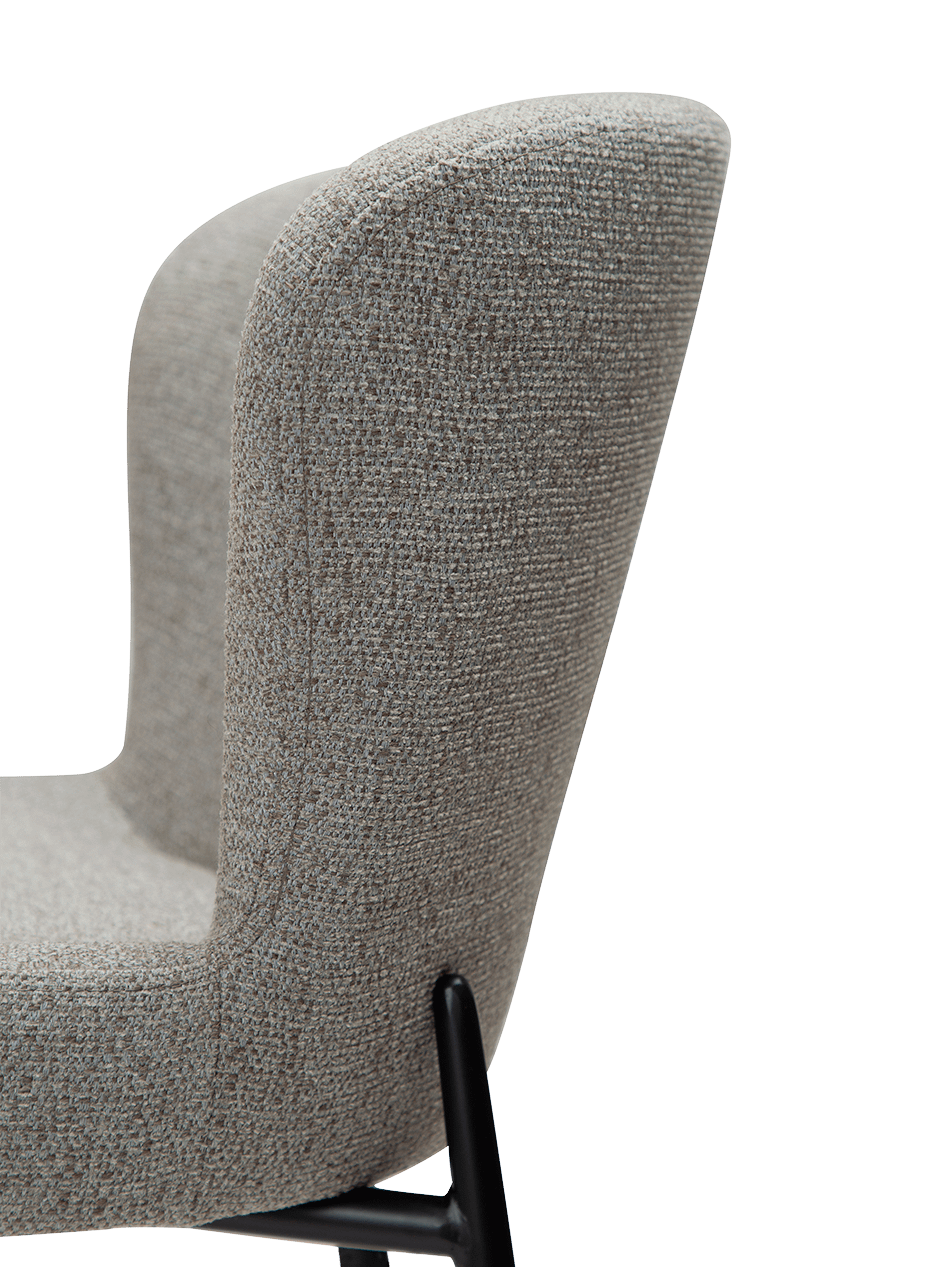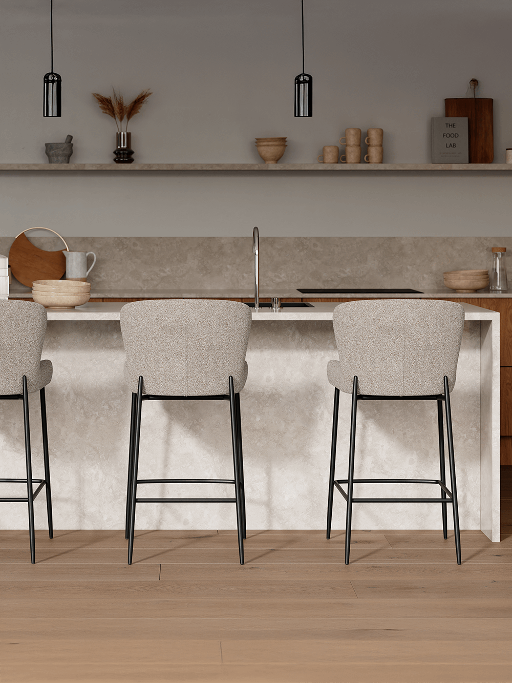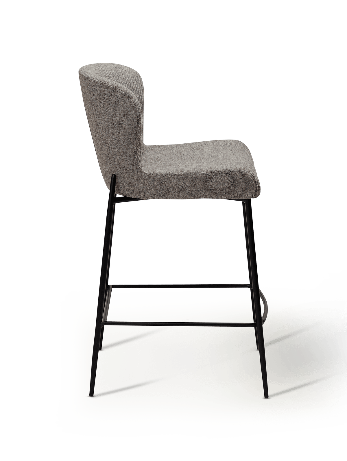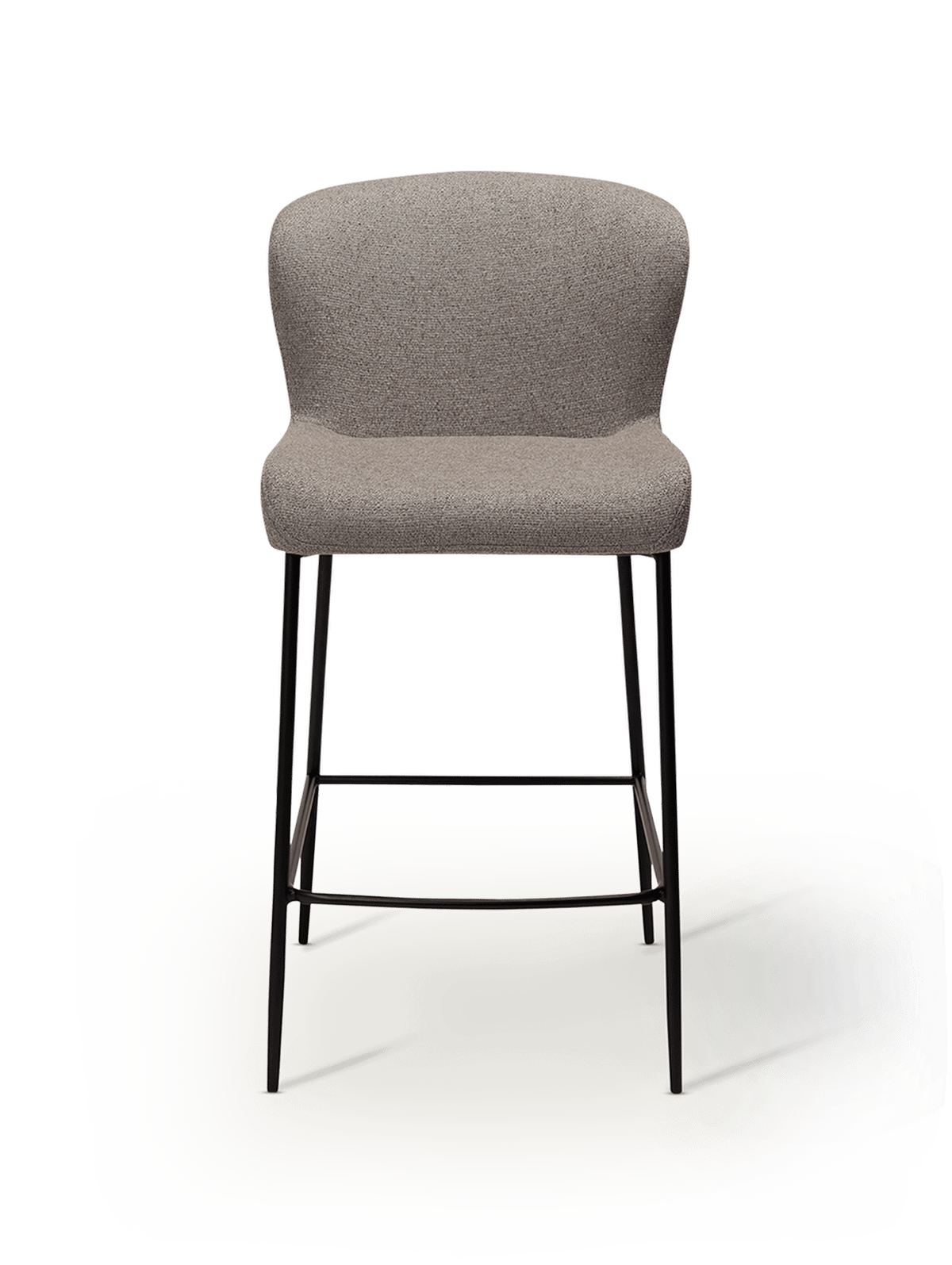 Met een zithoogte van 67 cm is deze stoel geschikt voor gebruik aan een keukeneiland of lagere bartafels. De zitting is bekleed met een bouclé stof in de kleur pebble earth en wordt gecombineerd met zwarte poten, waardoor de stoel veelzijdig inzetbaar is in diverse interieurs.